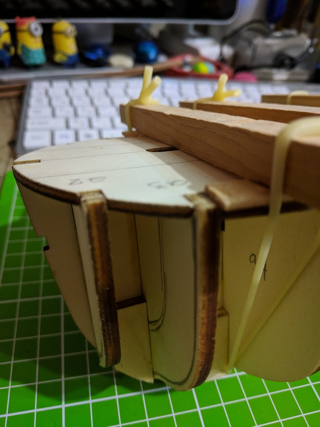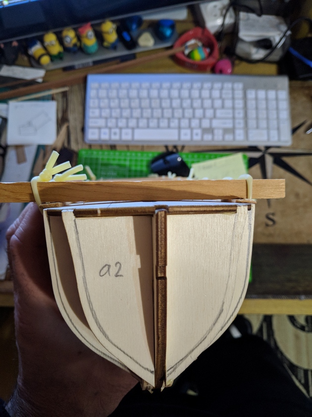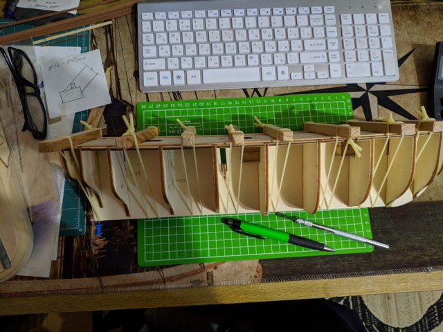 На данный момент собрал силовой набор и приклеил палубу. Для обеспечения седловатости, которая отсутствует, по килевой рамке наклеил рейку 4*1,5мм. Немного помучился с вклейкой палубы, не из-за сходимости со шпангоутами, а с заполнением щелей между шпангоутами и самой палубы. Но вышел из положения смешав ПВА с опилками и плотно прижав палубу до момента окончательного схватывания.