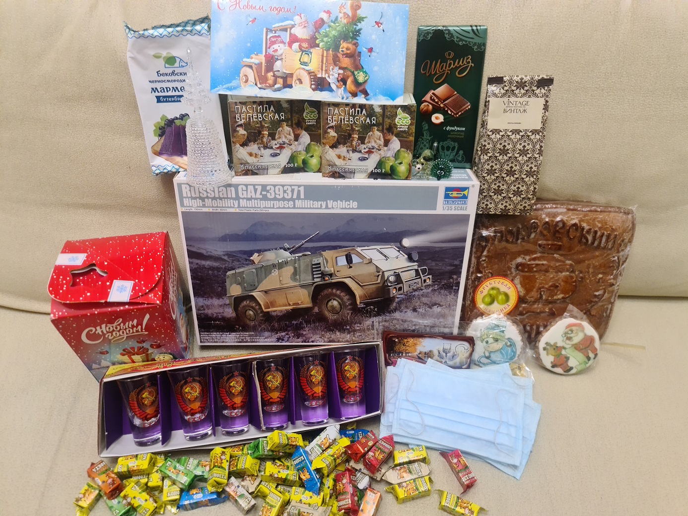 Ещё больше обрадовался после получения- в огромной коробке было почти 6 кг вкусностей и полезностей! Внутри и интересная модель ГАЗ-39371 «Водник» от Trumpeter, и огромное количество разнообразных сладостей, и открытка с тёплыми словами, и известные для Гусь-Хрустального изделия из стекла- как полезные