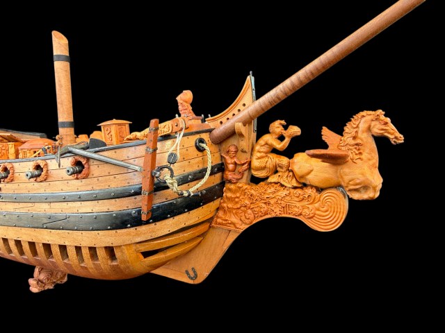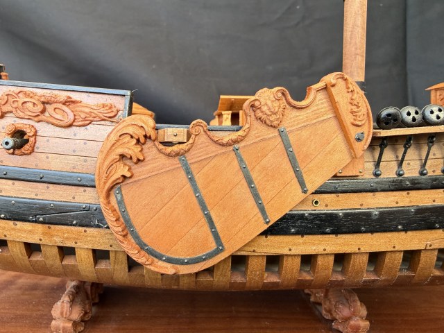 Как то незаметно стройке перевалила за свой экватор. И более менее стало понятно что получается. Собрал и окончательно установил на корпус весь декор. Прорезал пушечные порты.