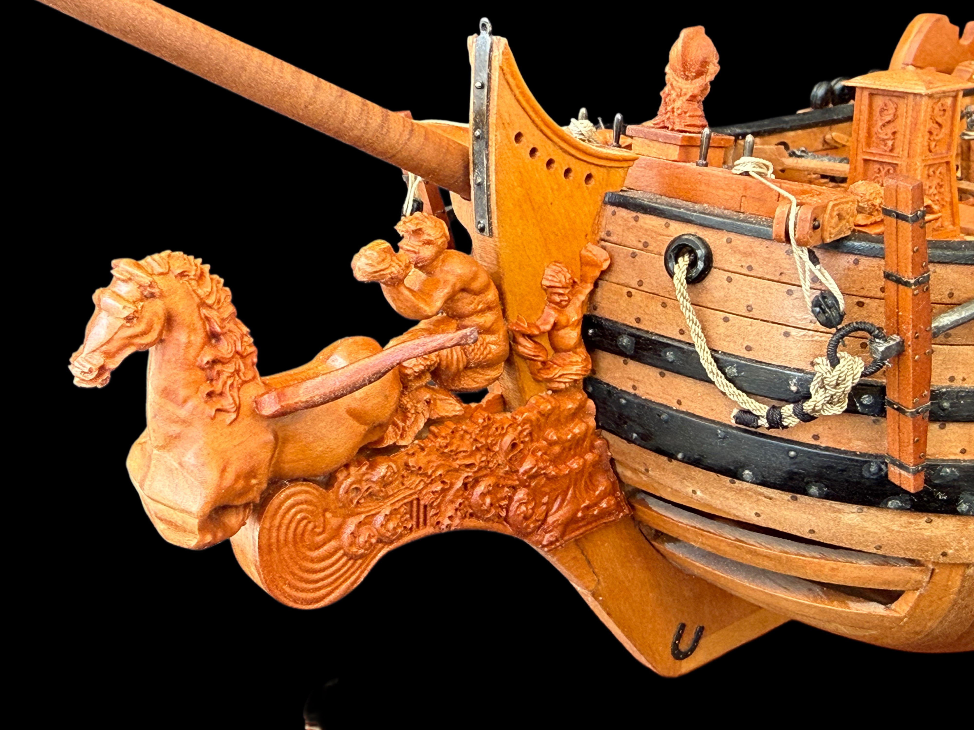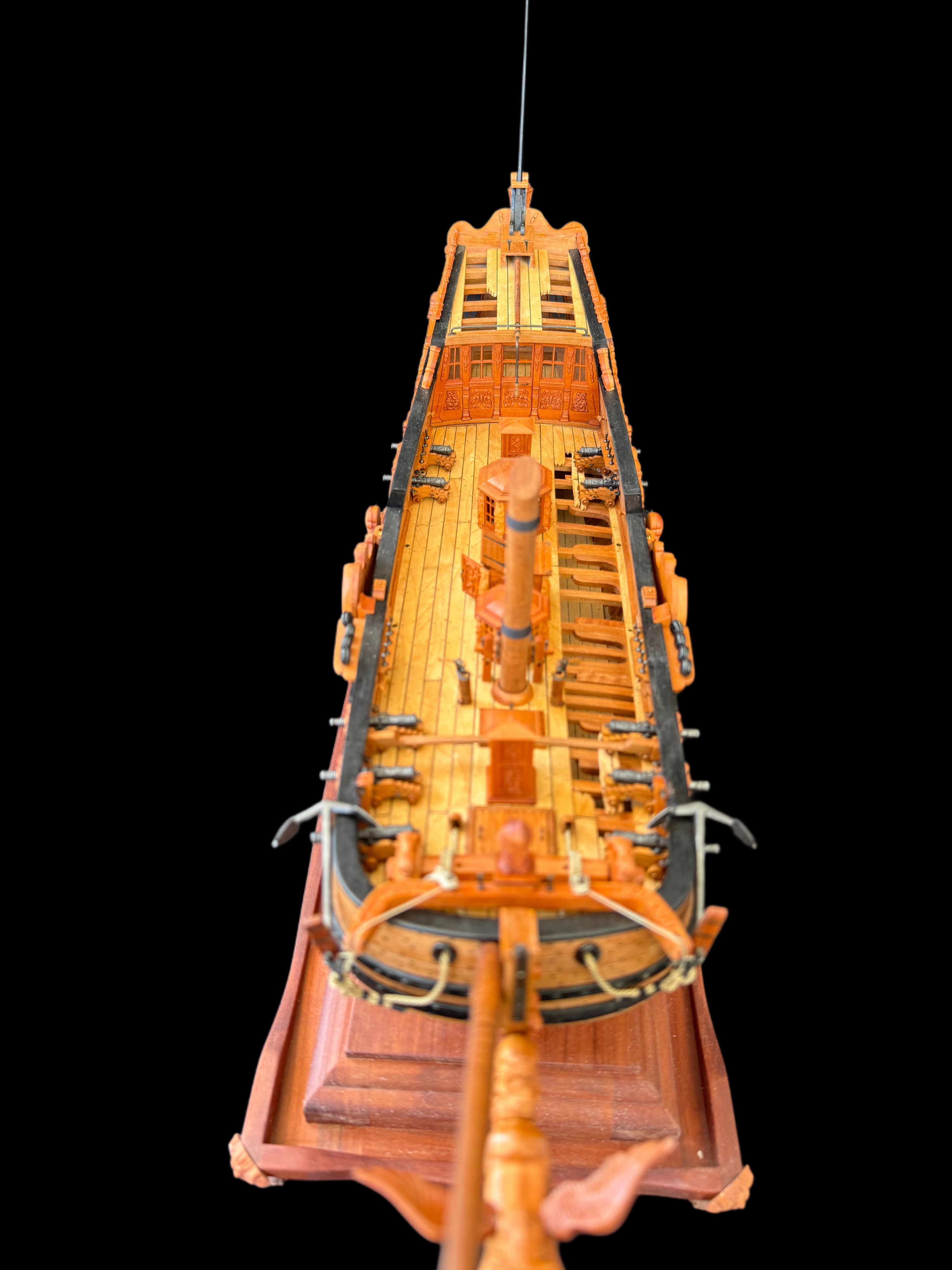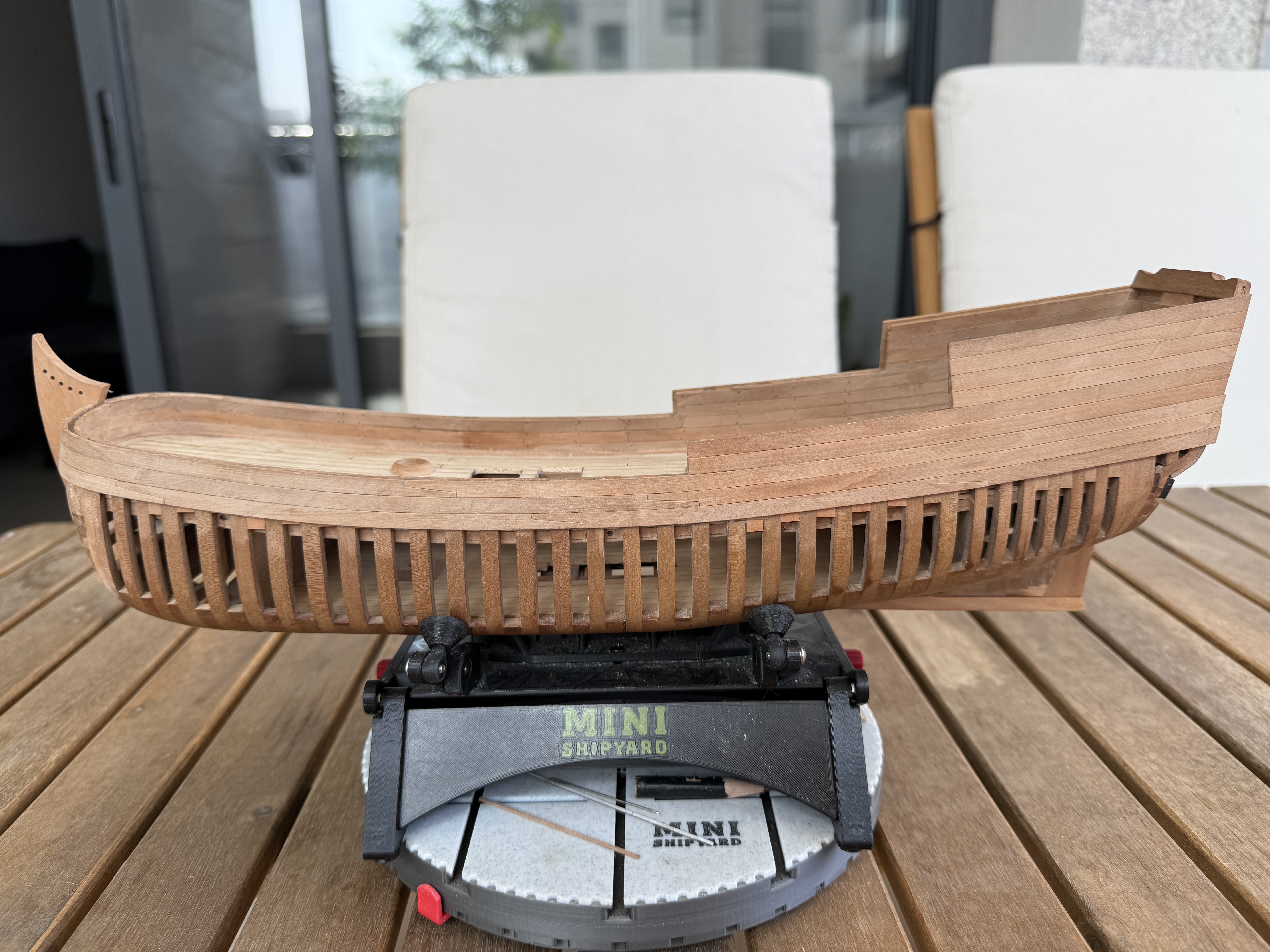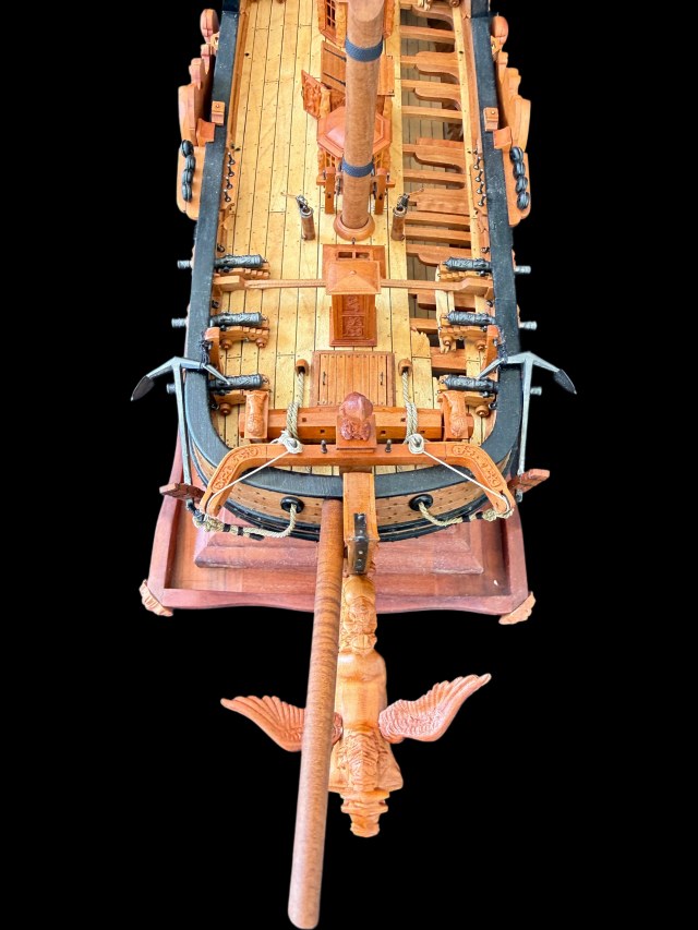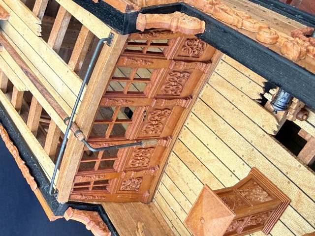 Приветствую всех. Дособрал кормовую каюту. Установил по периметру лавки. Собрал и установил гельмпорт (возможно путаюсь в терминологии). Заменил грушевый планширь на черный граб.