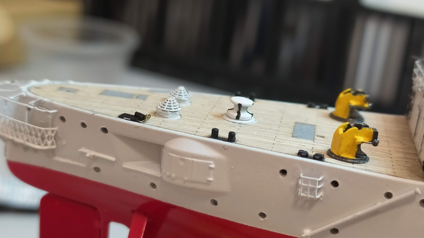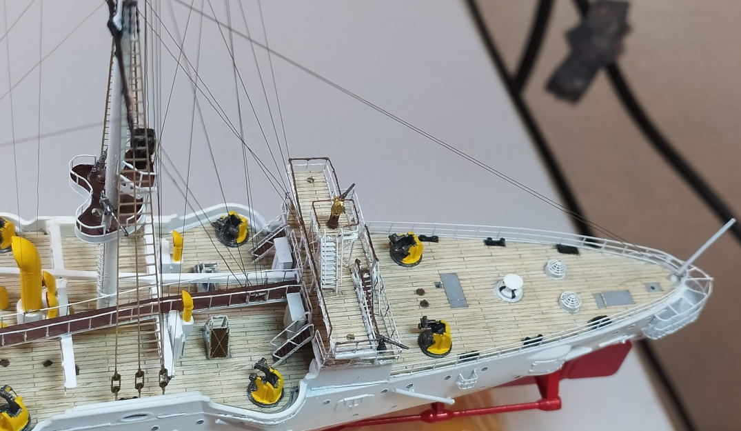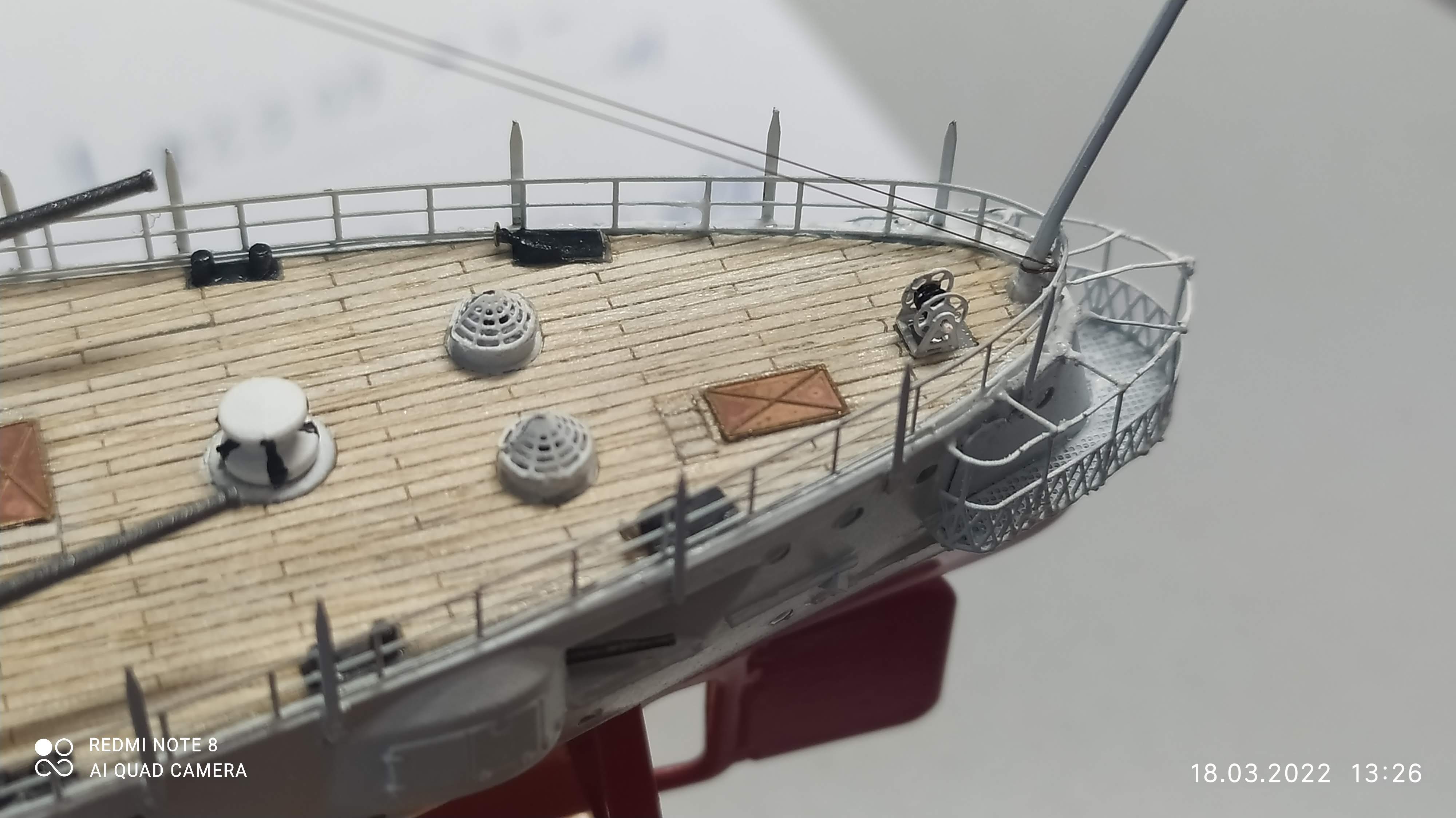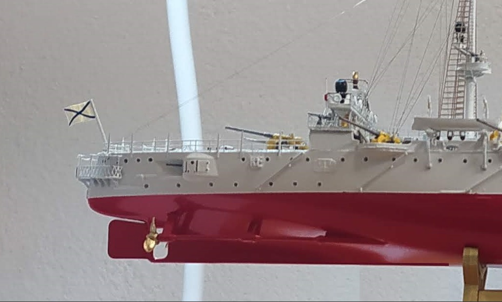 Также из того же нового комплекта Варяга сделал киповые планки в носовой части крейсера. Такие же - как на корме, и на корме ещё изготовил стопоры Булливана, после чего сделал и установил на корму леерные ограждения с флагштоком.