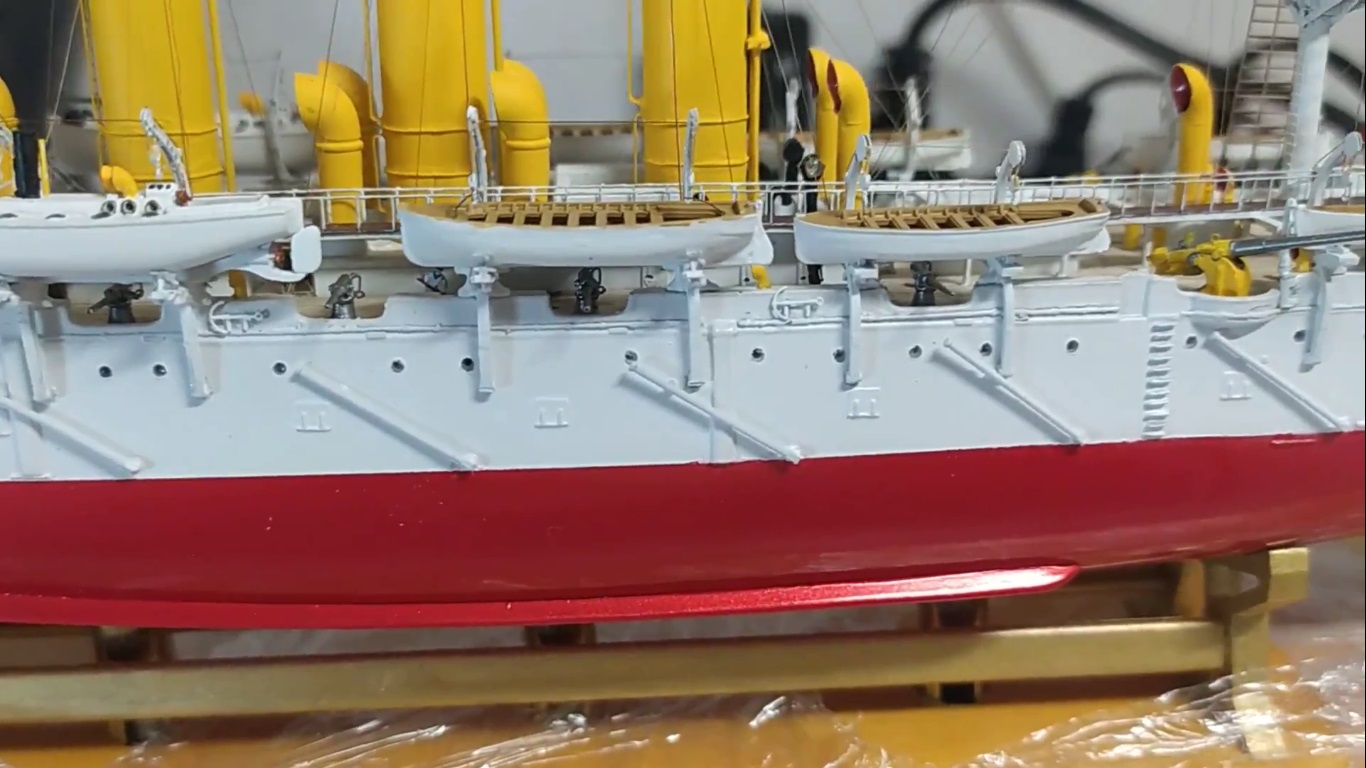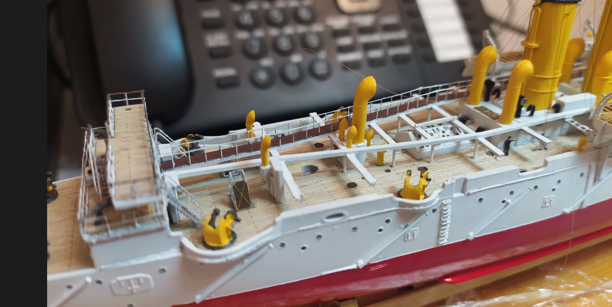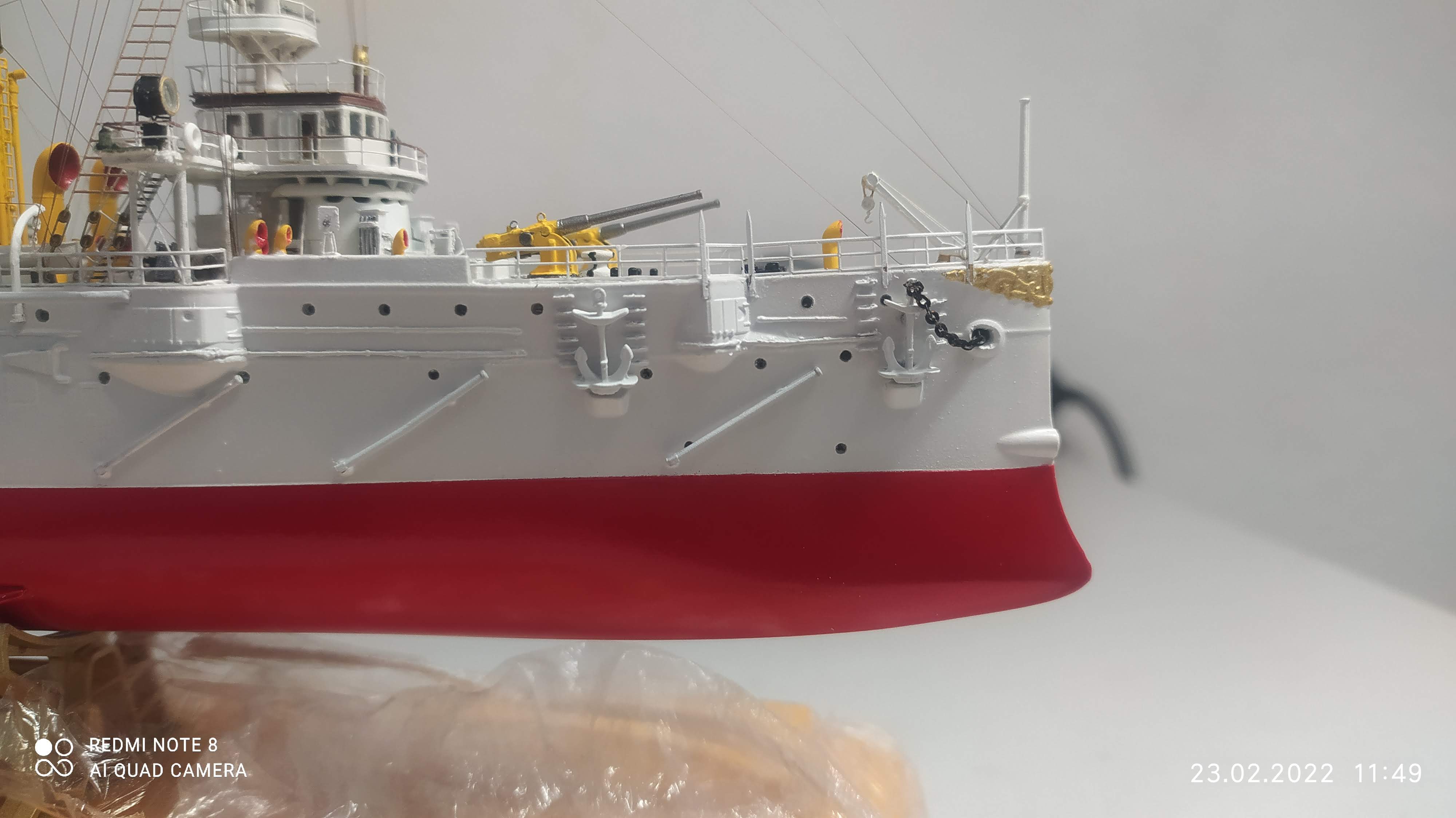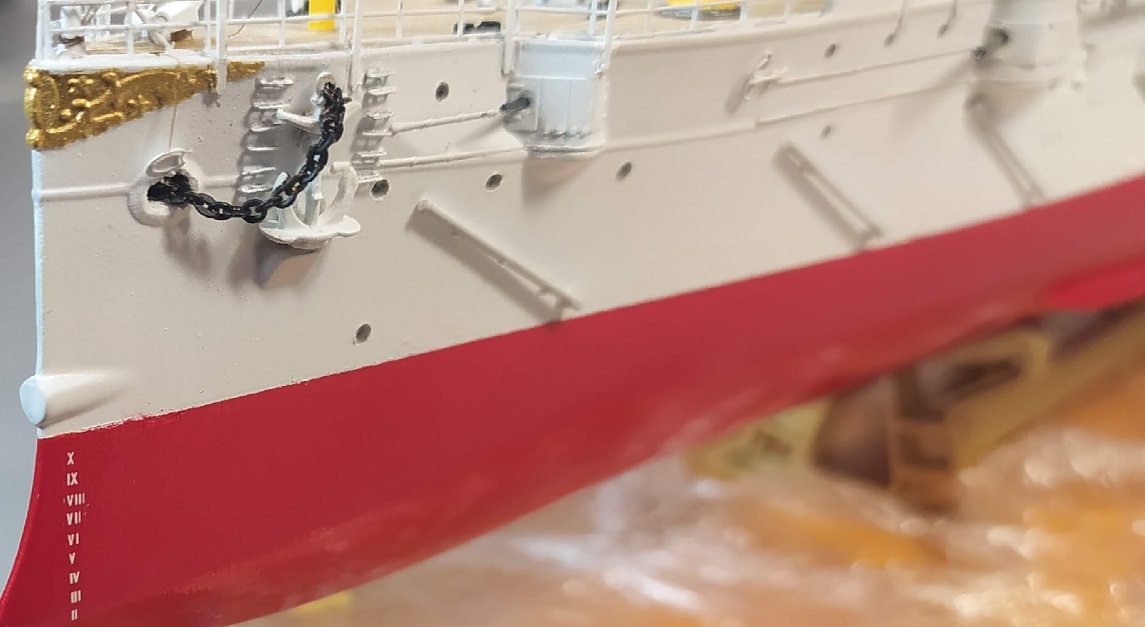 Также из того же нового комплекта Варяга сделал киповые планки в носовой части крейсера. Такие же - как на корме, и на корме ещё изготовил стопоры Булливана, после чего сделал и установил на корму леерные ограждения с флагштоком.