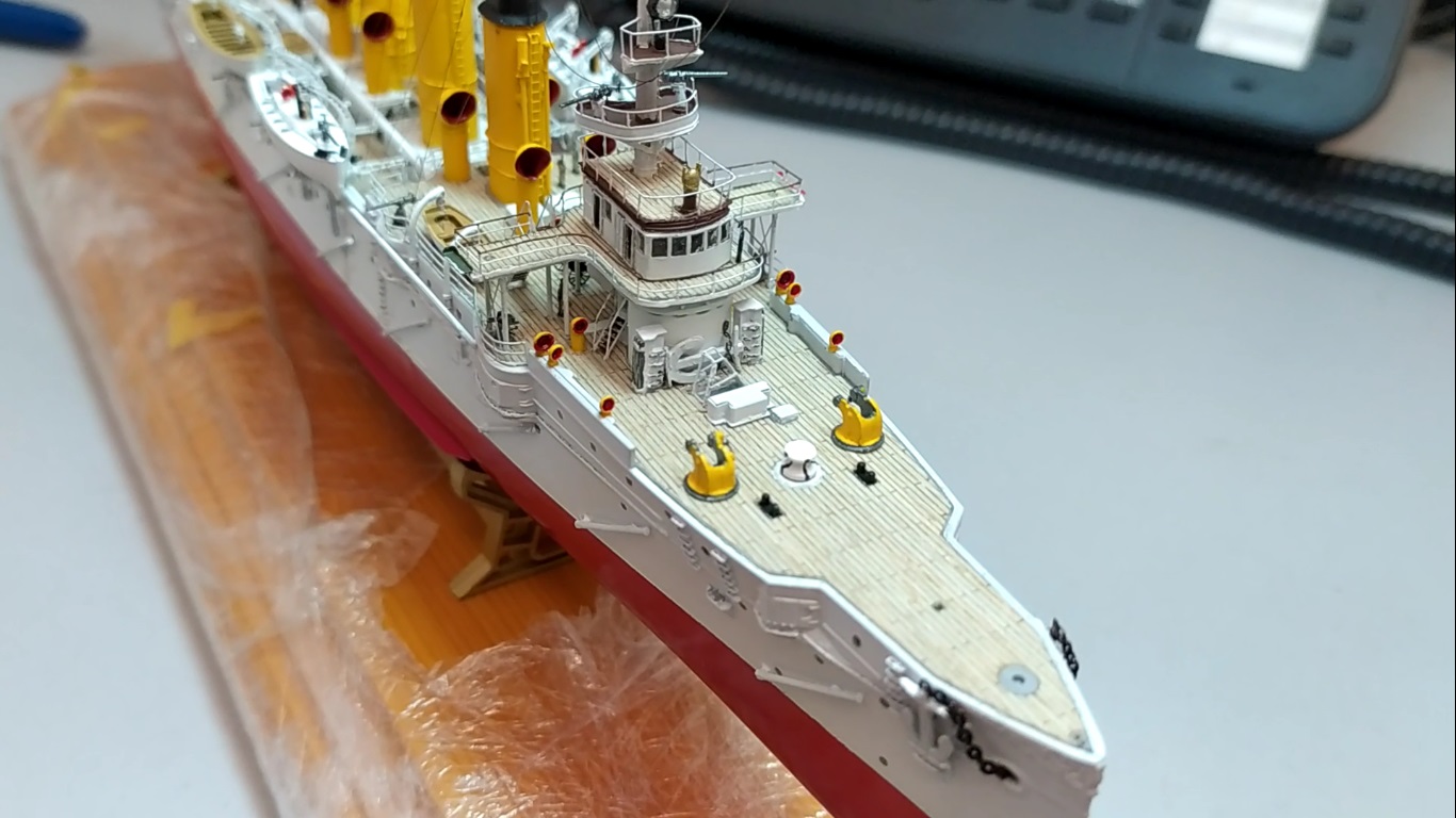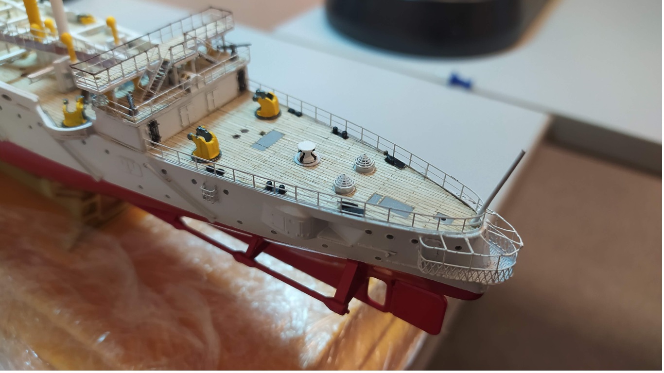 Продолжил сборку модели, установил леерные ограждение и кран в носовой части. Также сделал надстройку с компасом на корме крейсера