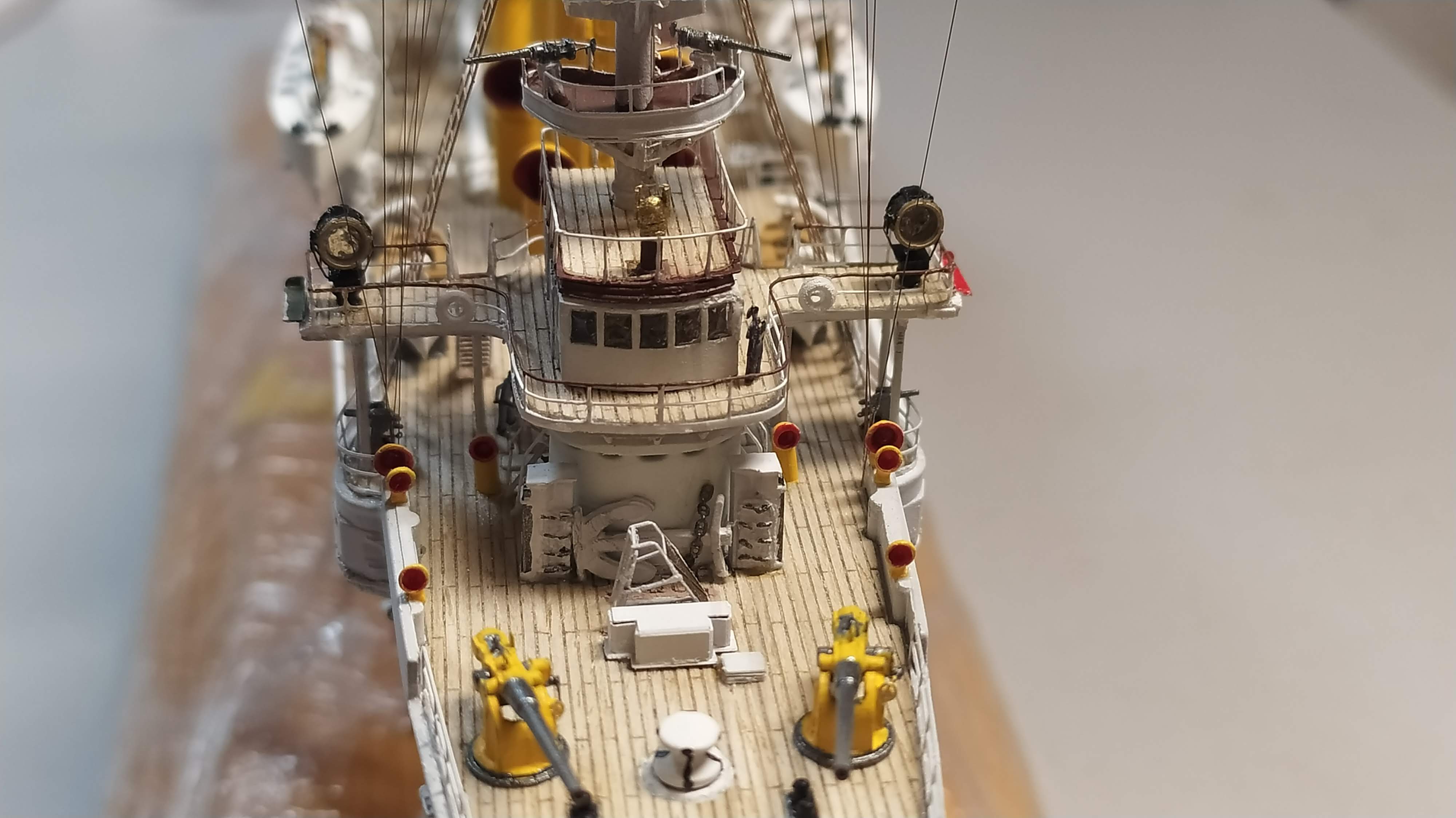 @Роман Быков написал:Павел написал:Продолжил сборку модели, установил леерные ограждение и кран в носовой части. Также сделал надстройку с компасом на корме крейсера