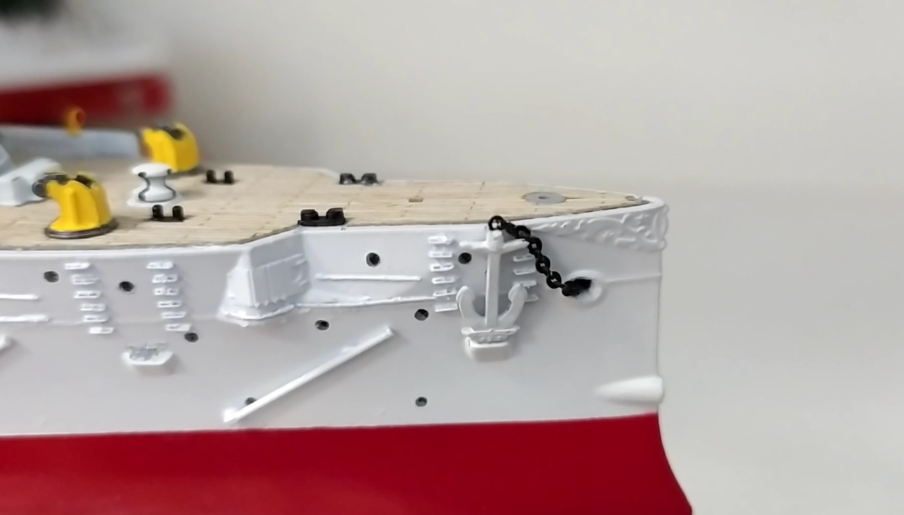 Также сделал все 8 якорей на модели, вернее тот что возле рубки так и оставил остальные переделал. 3 больших заменил на литые от Эскадра. 4 Маленьких взяты с пластин травления от Эдуарда. Хорошо что у меня 2 одинаковых набора, потому, что в наборе только 2 маленьких якоря, а так как раз. Установил ещё крышки на якорные клюзы.