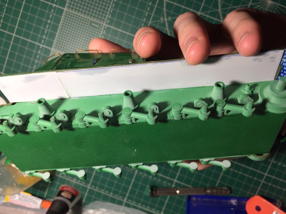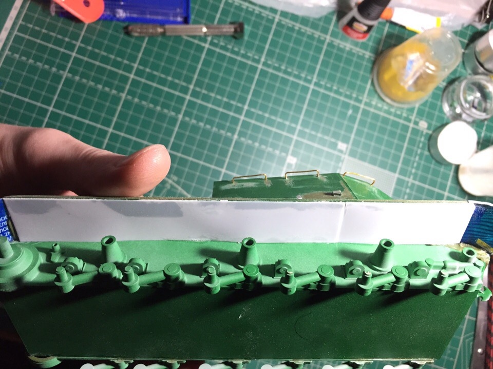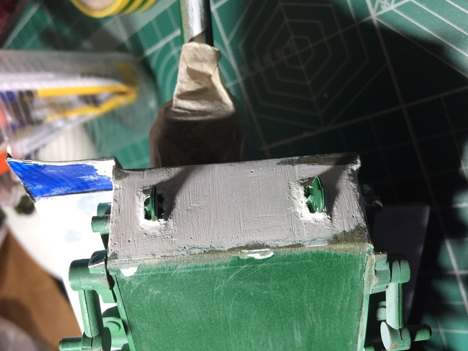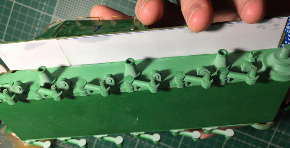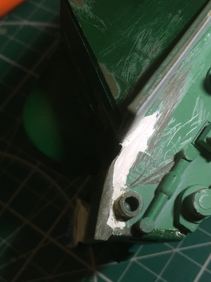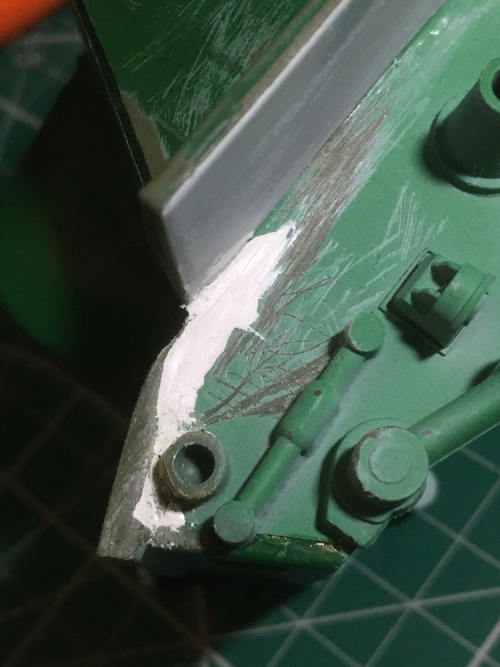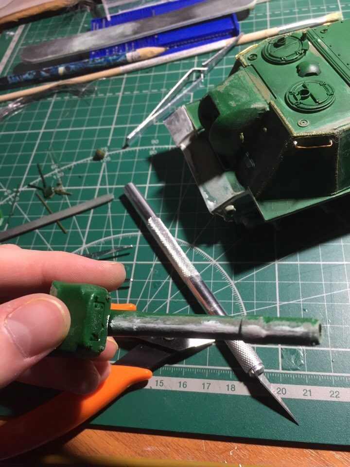Подшпаклевал и подшлифовал стык орудия. Над ним еще ведется работа, фото тоже не совсем достоверное, новое сделать еще не успел. Там добавились крючки.
