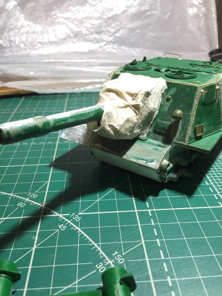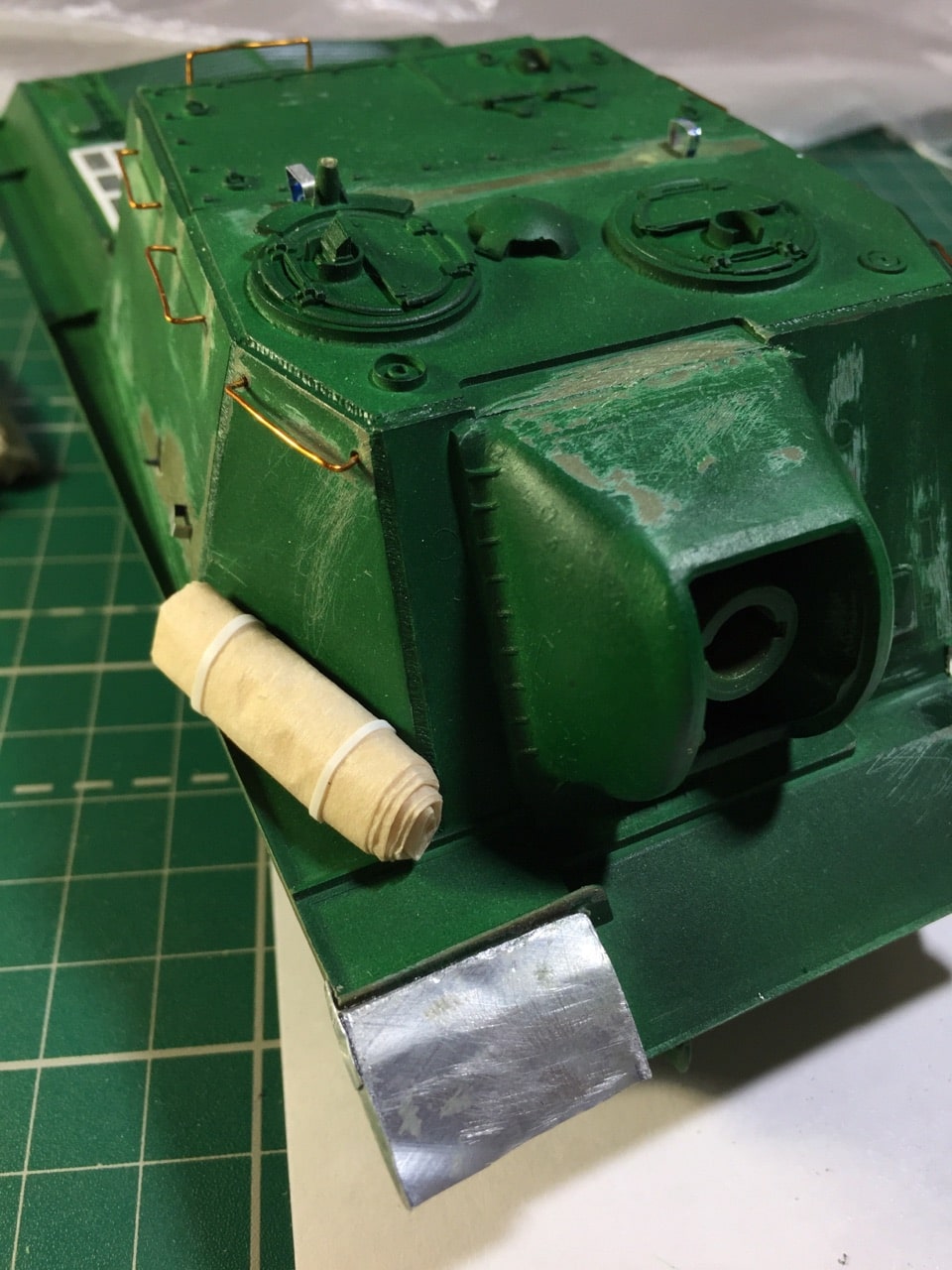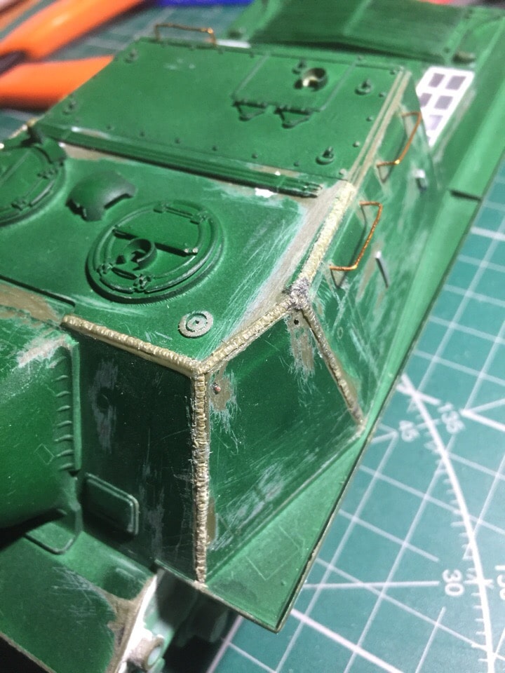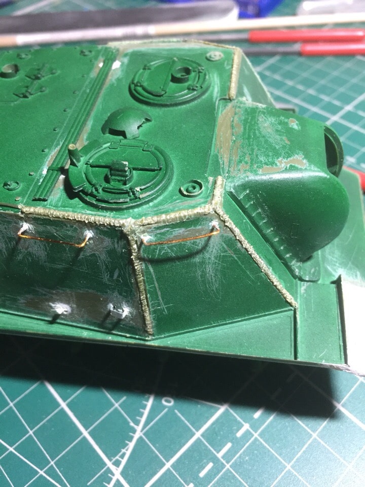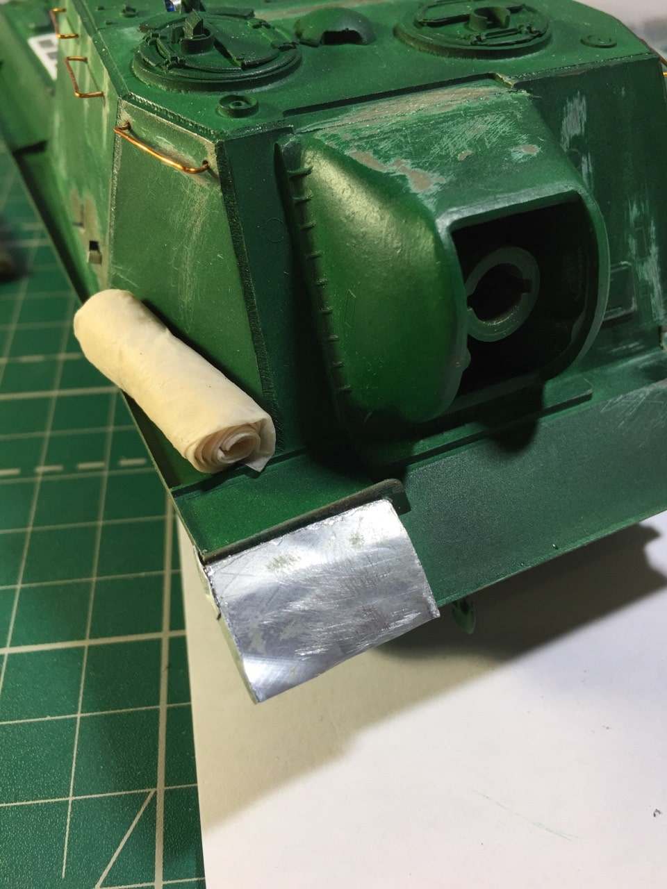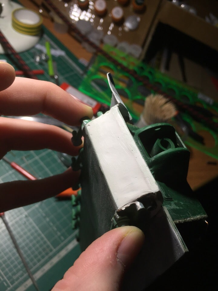 Подшпаклевал и подшлифовал стык орудия. Над ним еще ведется работа, фото тоже не совсем достоверное, новое сделать еще не успел. Там добавились крючки.