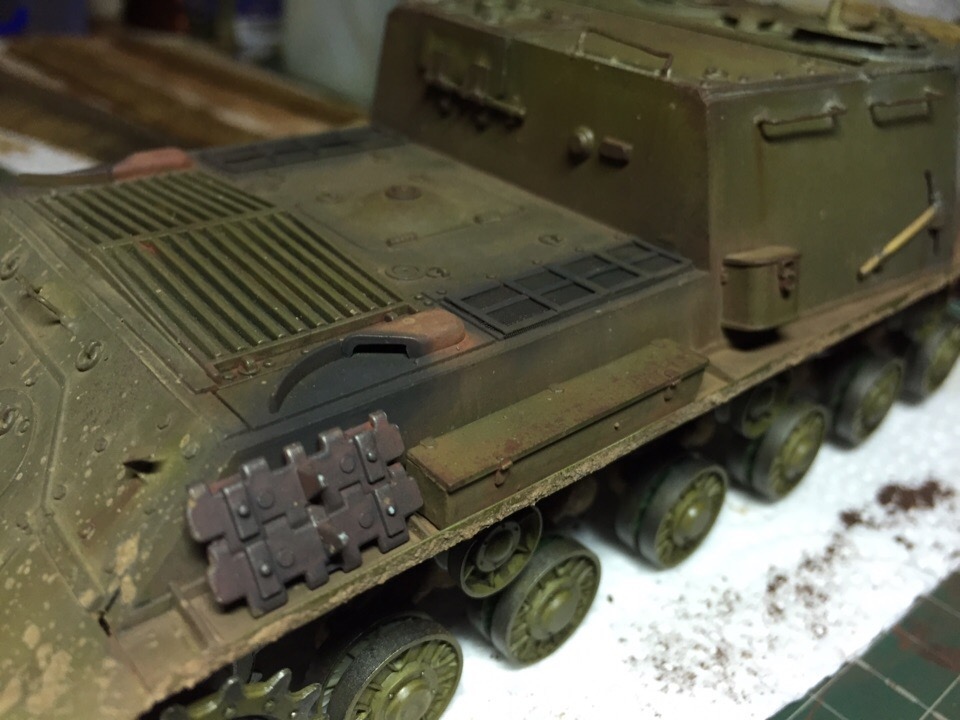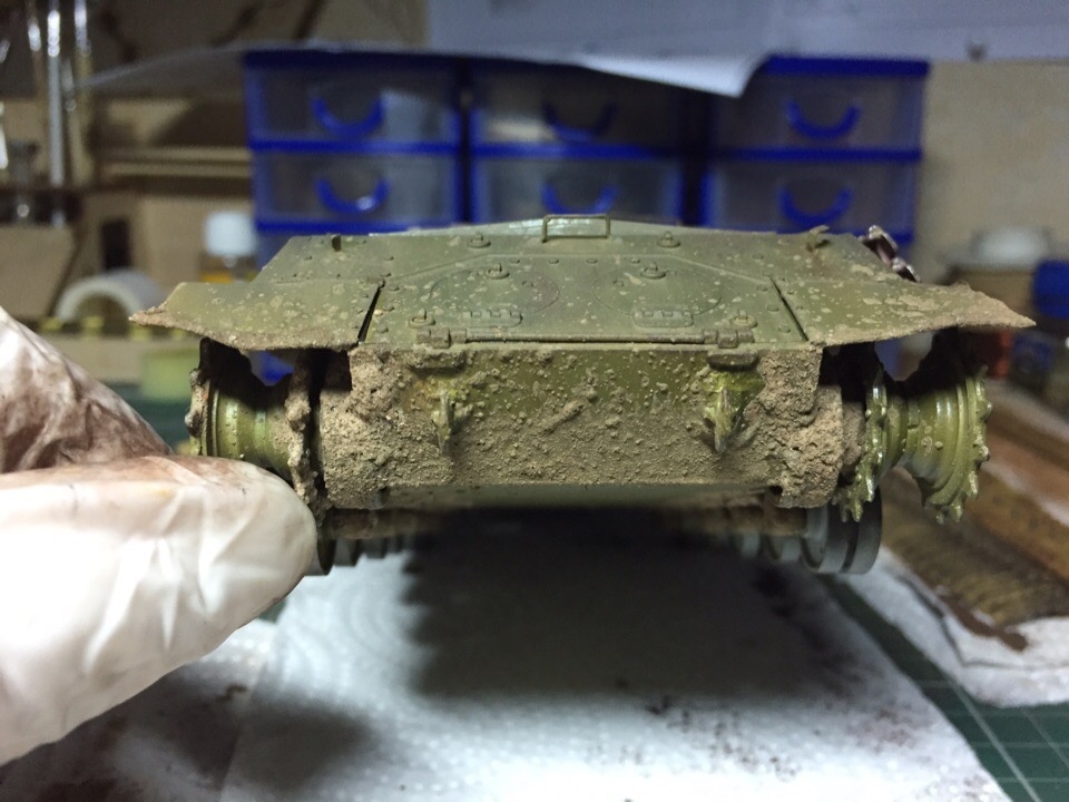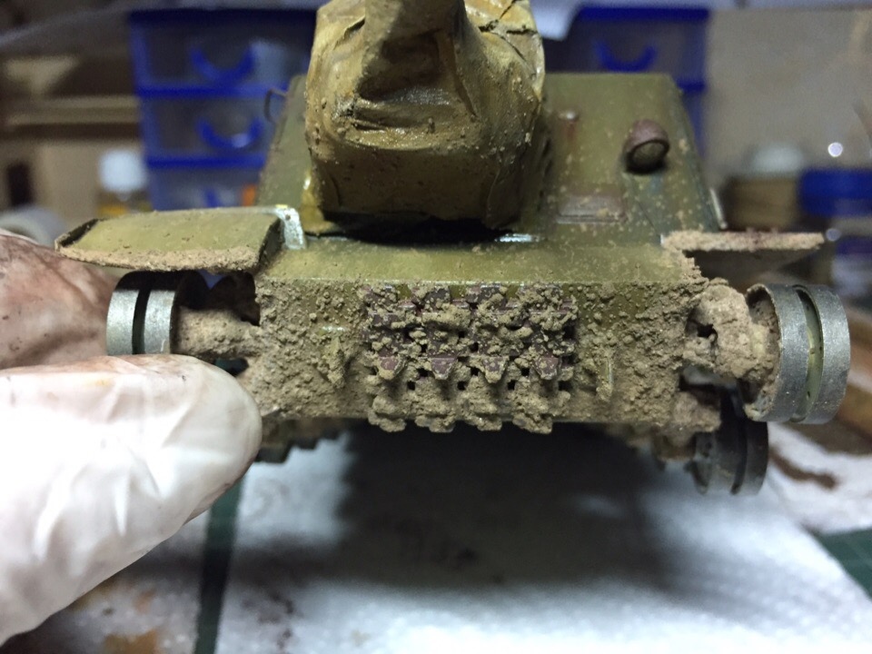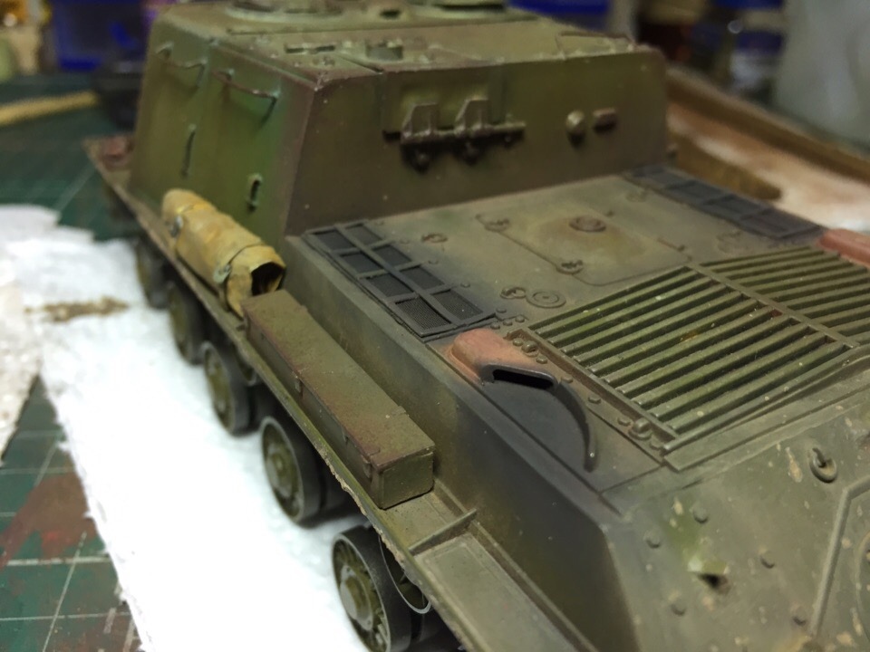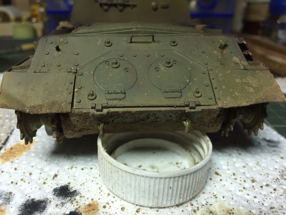 Начал загаживать ходовку и везерить мелочевку. Нанес сколы, нанес брызги грязи на лобовую и кормовую часть, завезерил выхлопные и решетки МТО. Пока все это делал отвалился кусок крюка в кормовой части, который должен был держать трос...