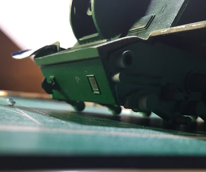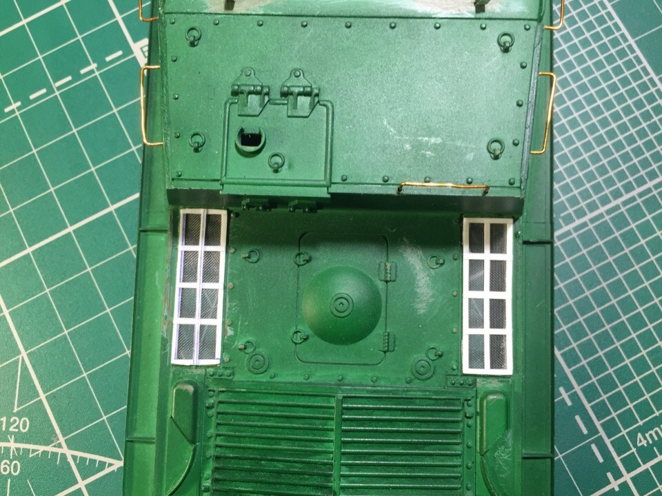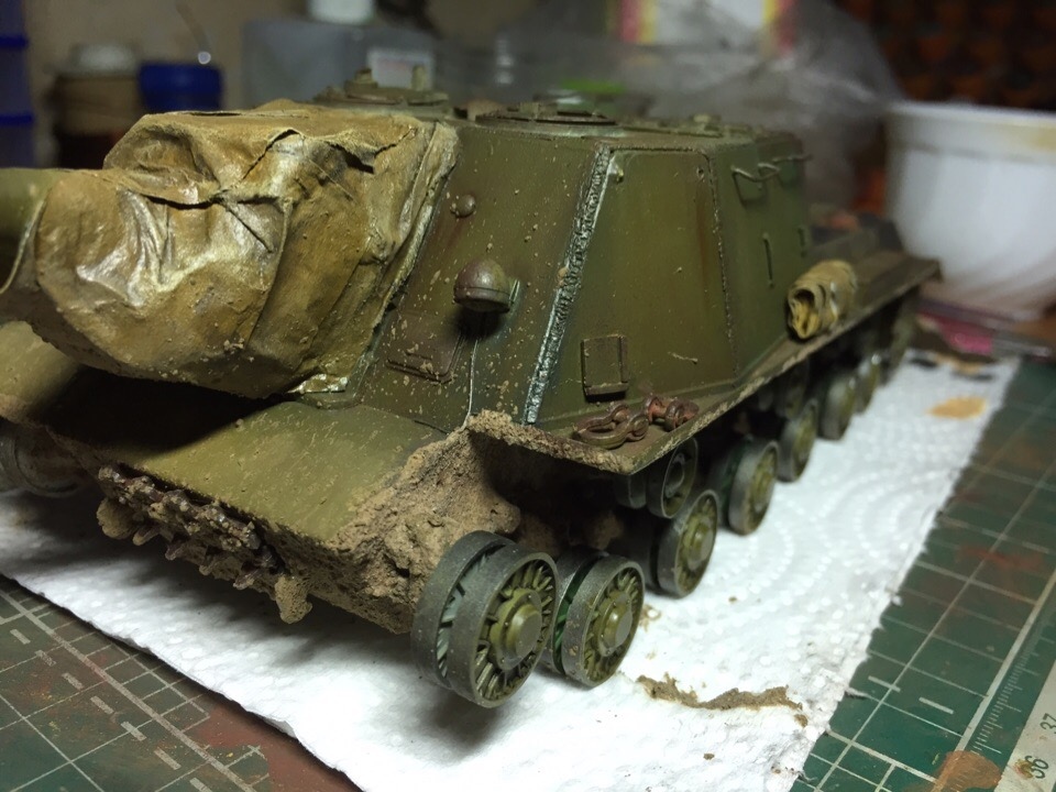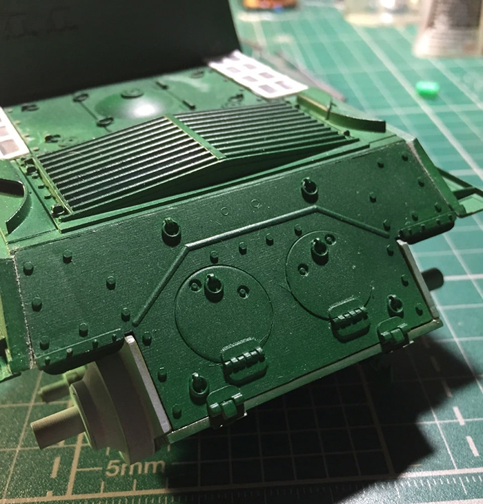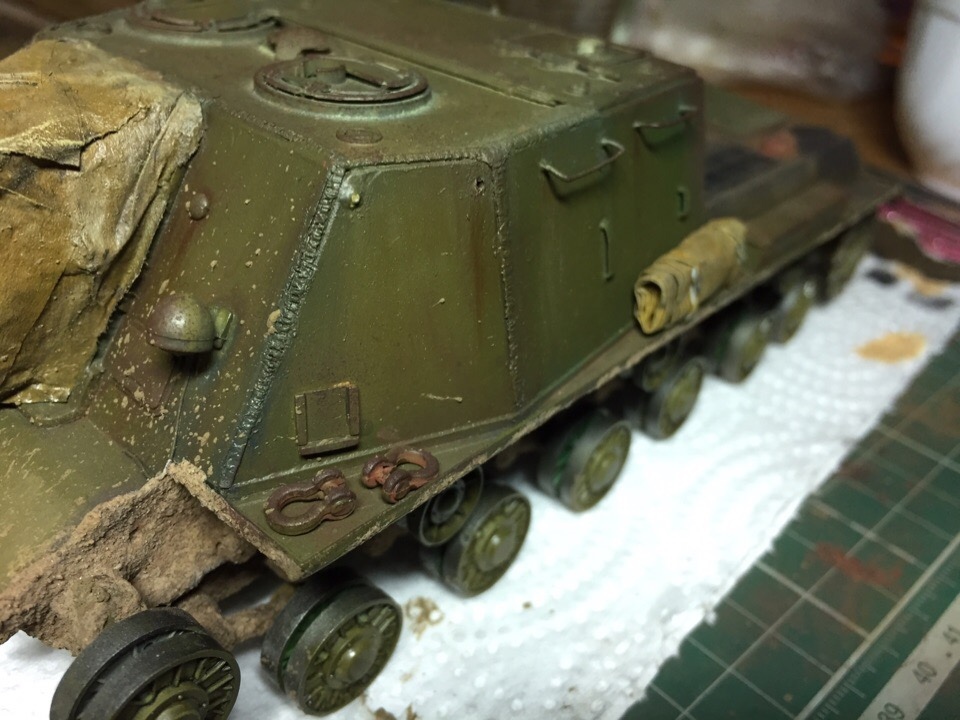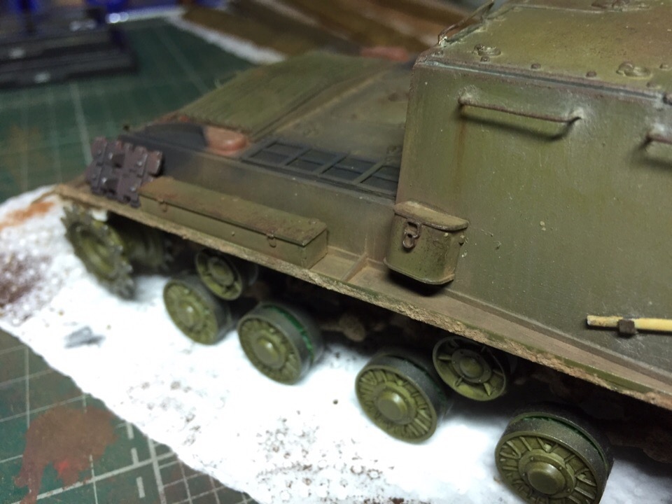 Начал загаживать ходовку и везерить мелочевку. Нанес сколы, нанес брызги грязи на лобовую и кормовую часть, завезерил выхлопные и решетки МТО. Пока все это делал отвалился кусок крюка в кормовой части, который должен был держать трос...