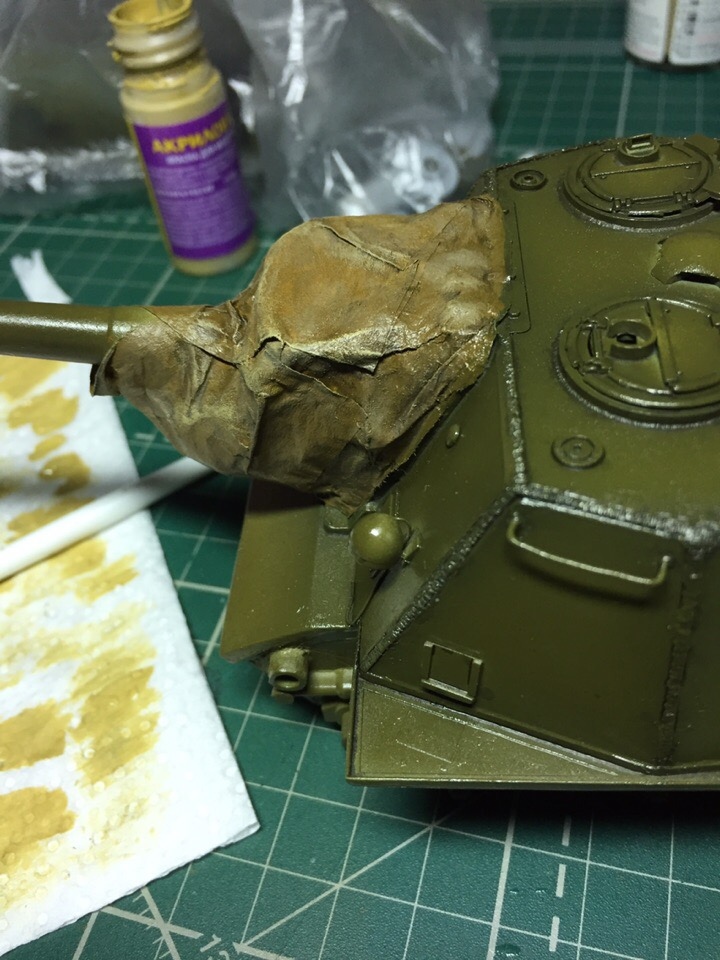 1. Окрасил брезент кистью на маске орудия в соотв. цвет, обычным акрилом от звезды (номер не вспомню, но он так и называется, брезент).