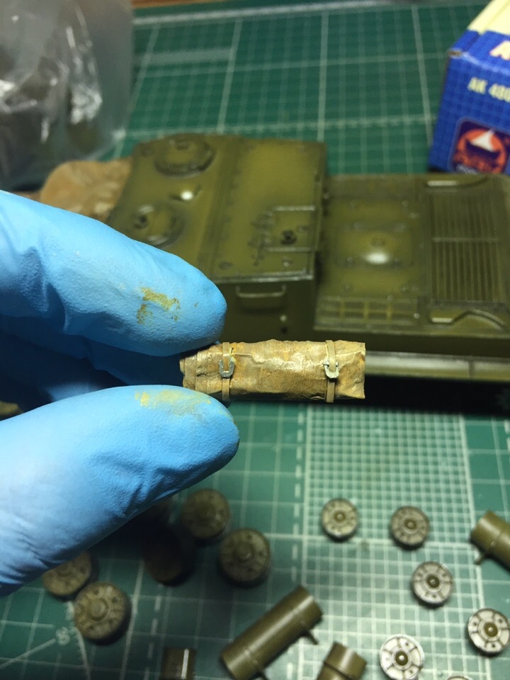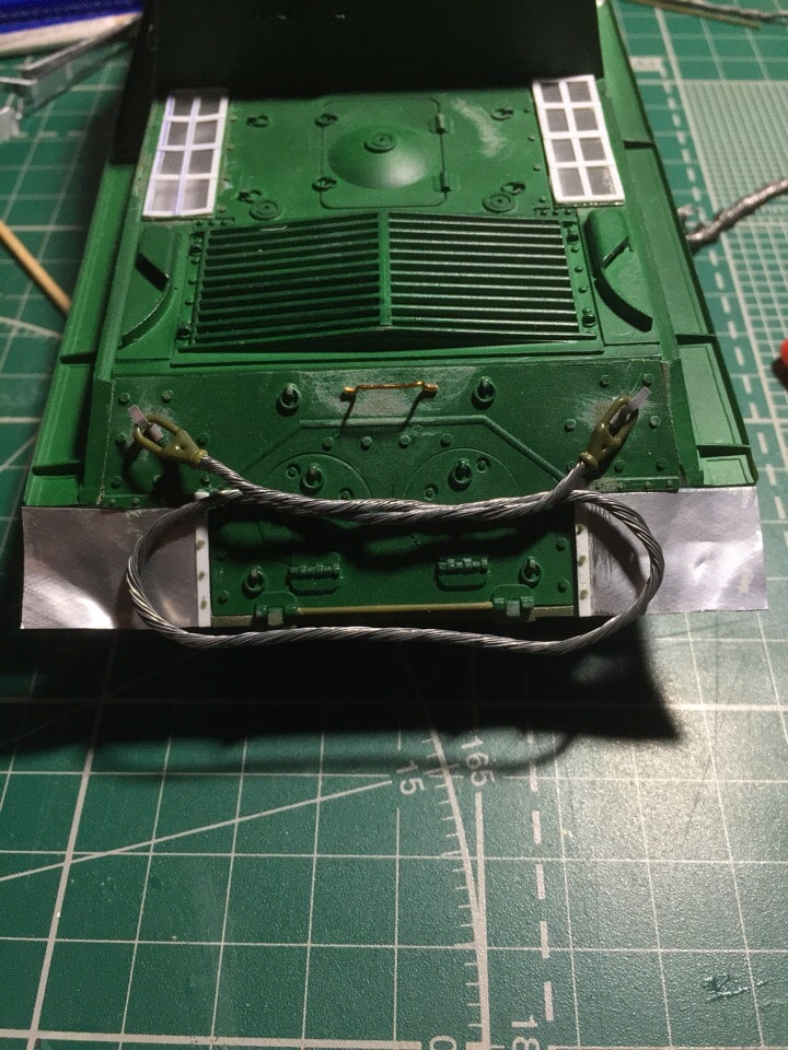 Сделал крючки в кормовой части корпуса, и еще один поручень. Сделал металлический трос. Мне уже сказали что их должно быть 2 и они должны быть короче. Я решил что будет один но подлиннее. Я его потом еще получше присобачу туда, будет песня. Сделал скатку брезента. Брезент тоже делал первый раз) Да вообще это первая модель с такими масштабными переделками. В любом случае, я уверен что найдутся люди которые скажут, что мол, то не так, это не так. ИМХО, я работой доволен. Впереди еще работа со сварными швами на левой стороне с поручнями и креплениями для подвесного инструмента, работа с проводкой, брезентом на маске орудия а дальше - посмотрим.