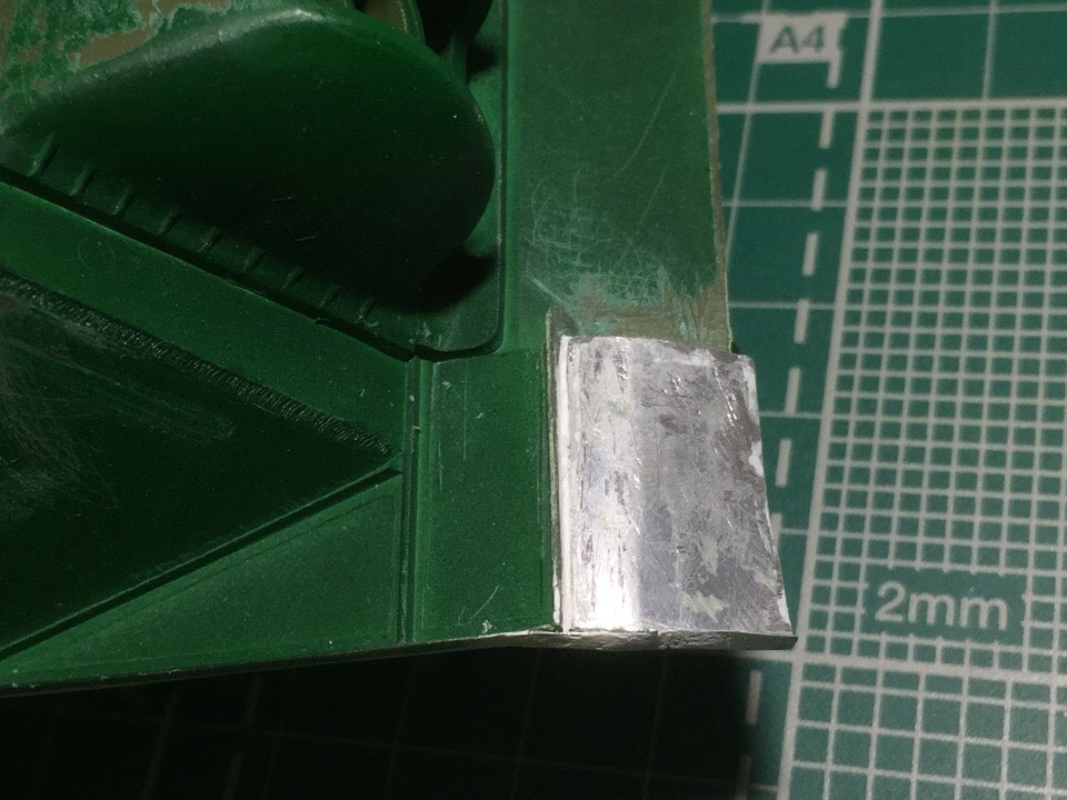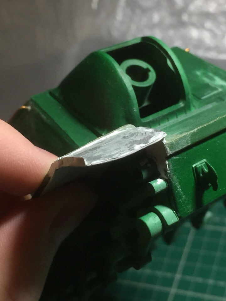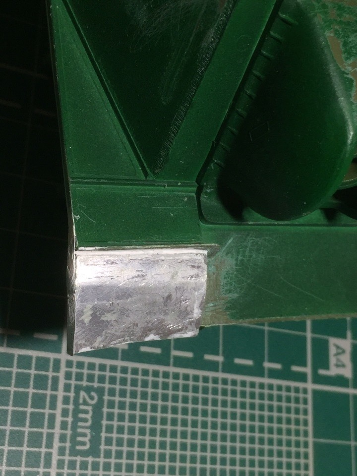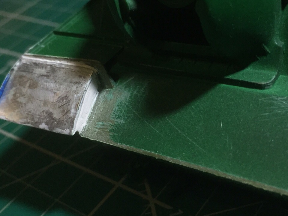 4,5. Два передних крыла (грязевых щитка) были срезаны. Переднее правое заменено на самодельное, из пивжести. Дырка между корпусом и крылом зашпаклевана. Предполагается что модель будет только с одним крылом (второе было утеряно во время боевых действий...)