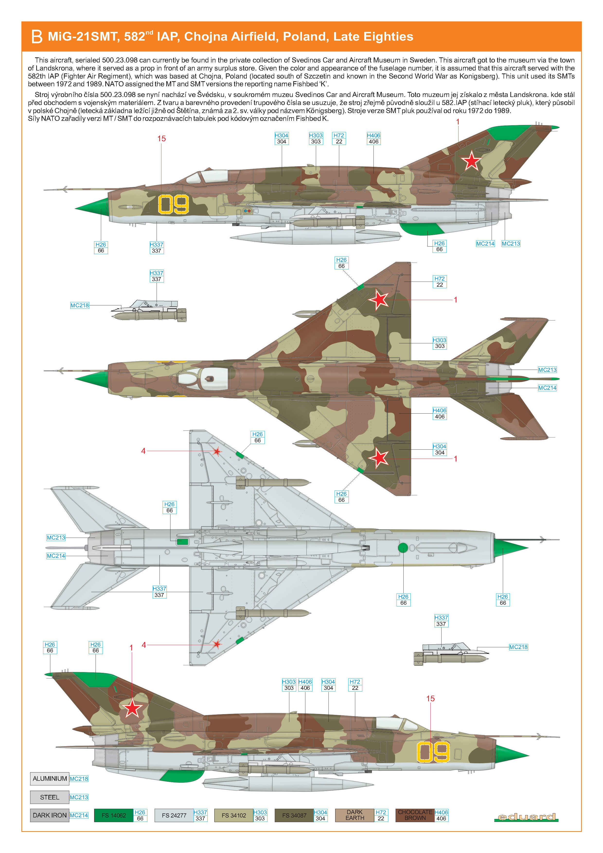 Только еще несколько деталей должны быть в цвет конуса (зеленые): по одному сигменту на передних кромках крыла в районе гребней, по одной полоске на киле (справа и слева) между верхней радиопрозрачной панелью и обтекателем гироскопа АГД (наплывом). Ну и на Ваших снимках не видно есть или нет: на фюзеляже снизу, справа от фальшкиля прямоугольник - там антенна МРП. На Ваших же снимках реальных машин они зеленые.