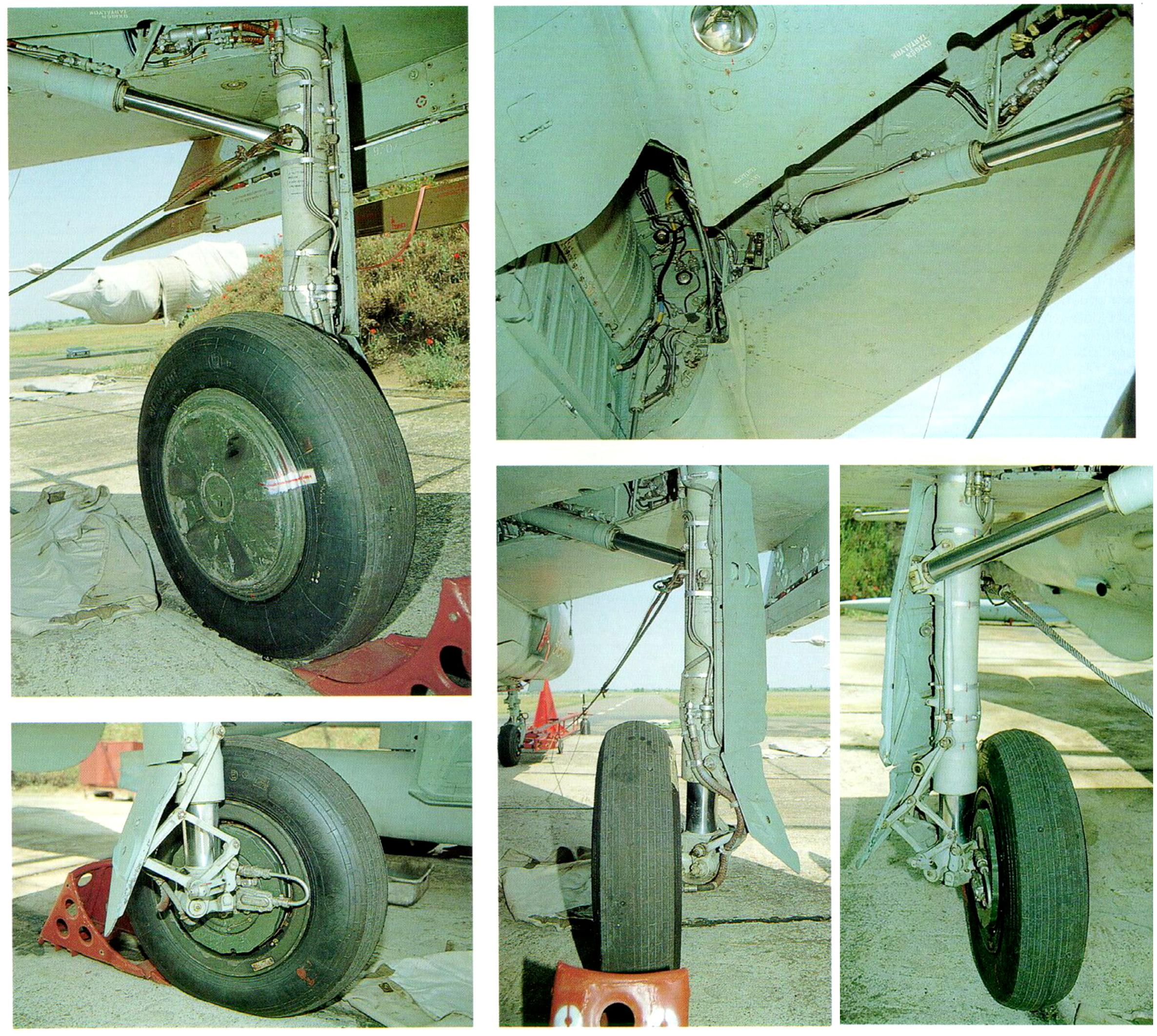 Рычаги амортизаторов должны быть больше завалены назад.Они должны смотреть в сторону, примерно противоположную направлению движения стойки при ее уборке. На скорую руку нашел два фото, там более-менее видно. И, кстати, щитки на основных стойках тоже должны быть поперек этого-же направления.