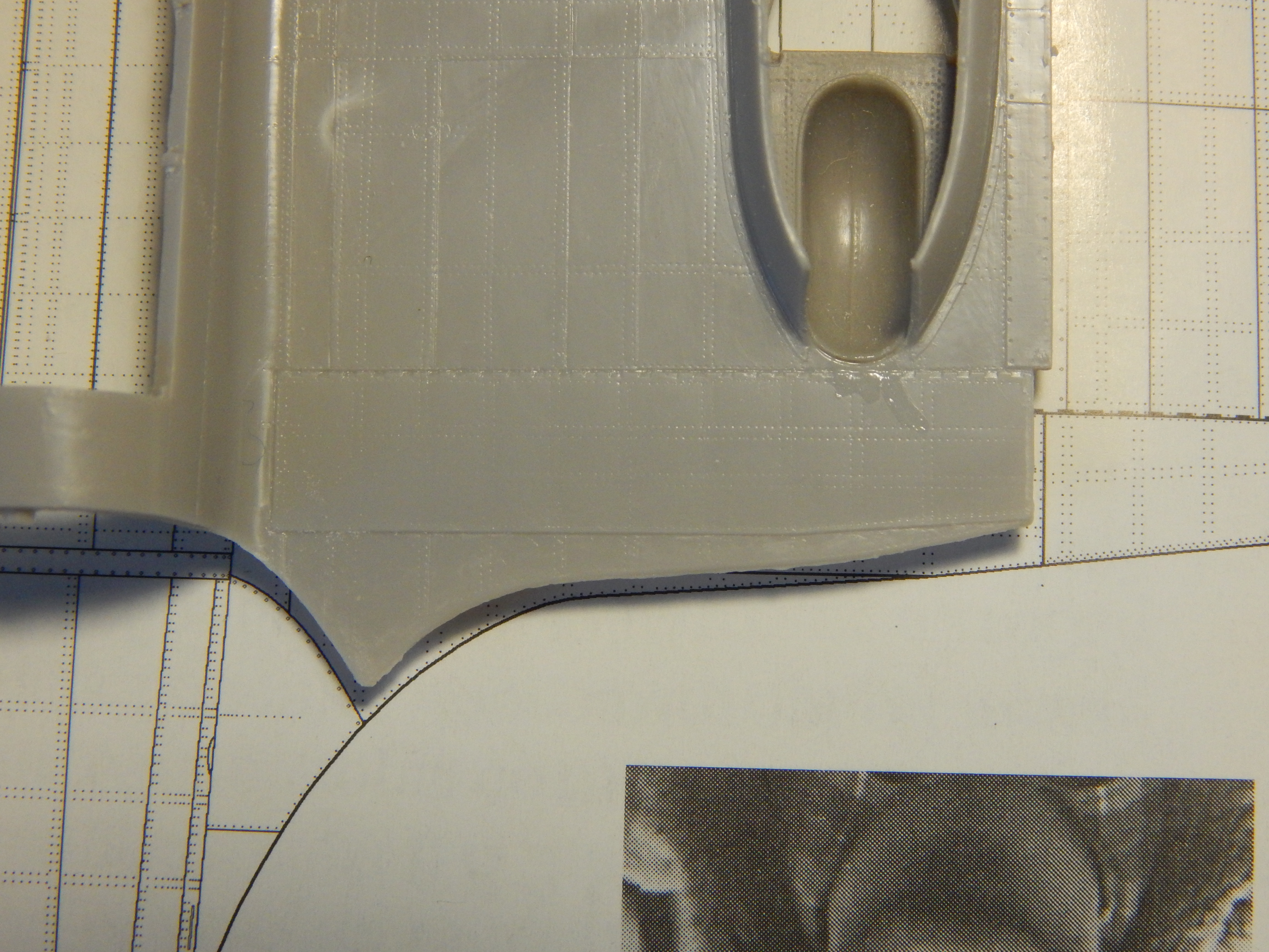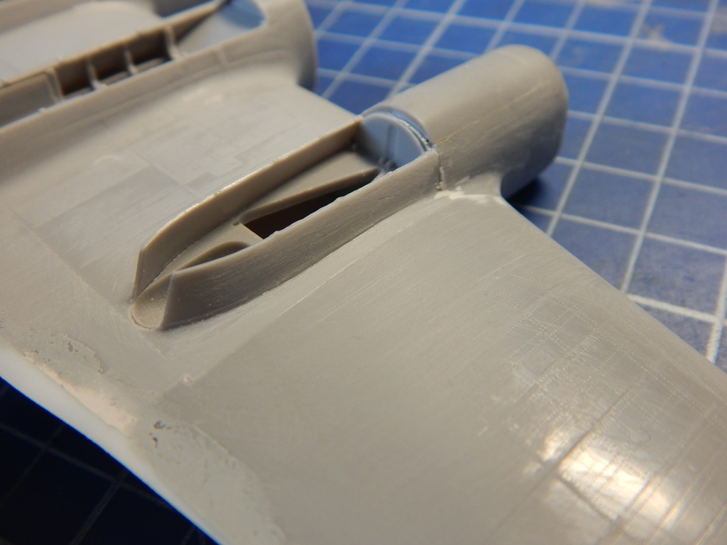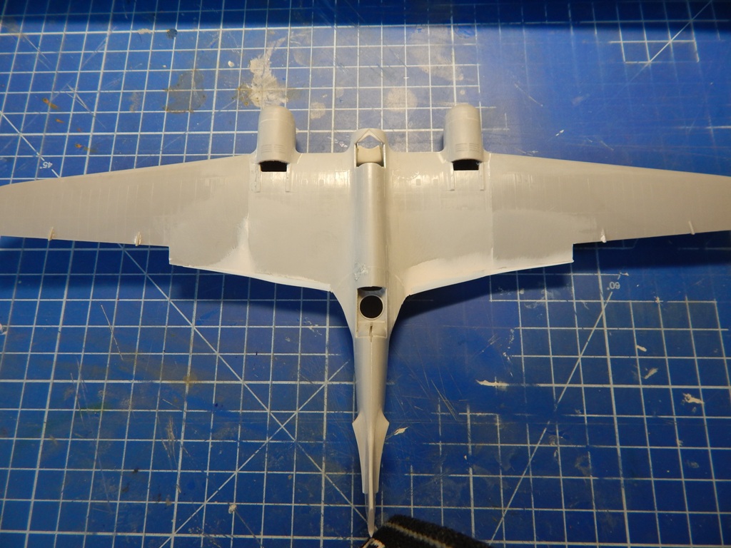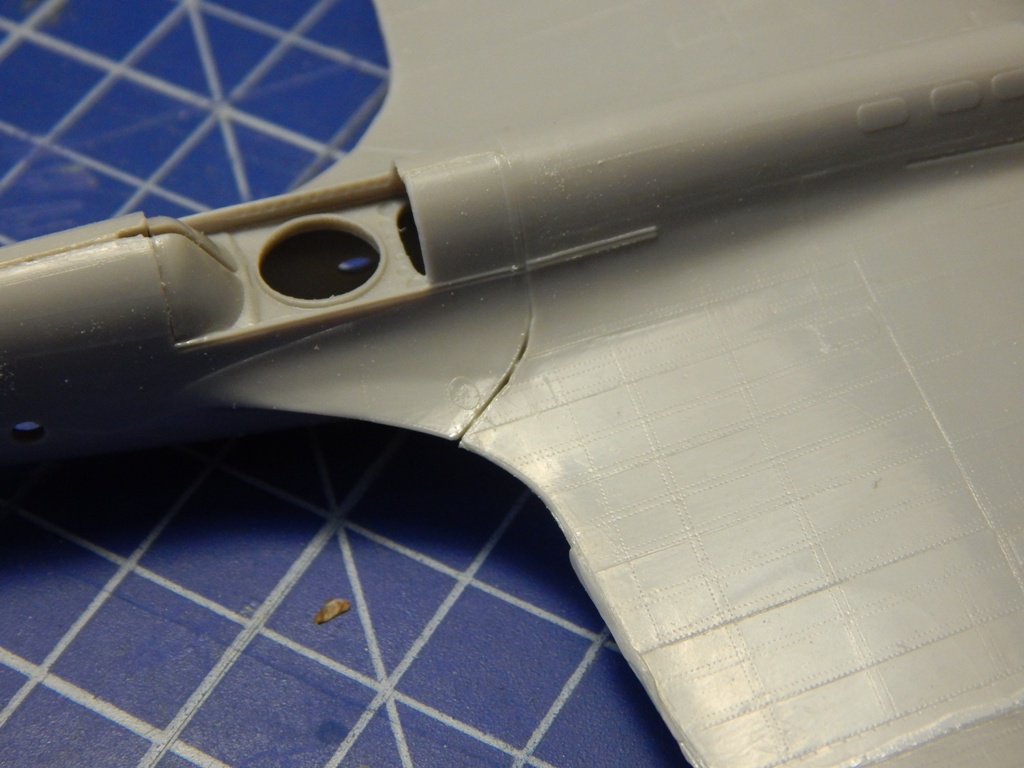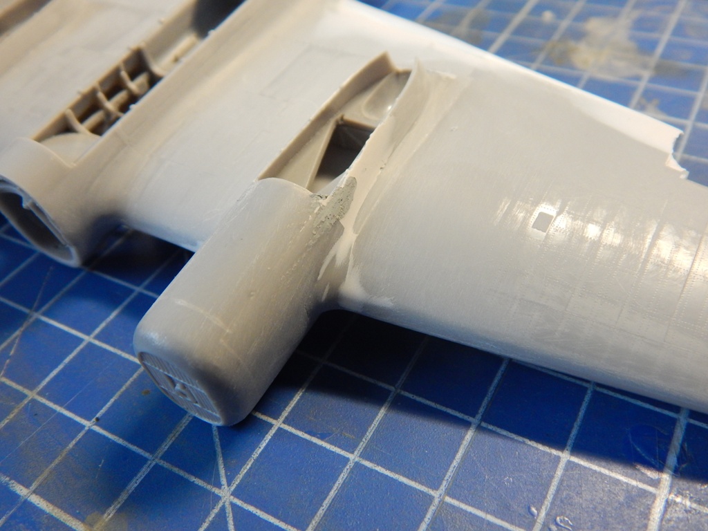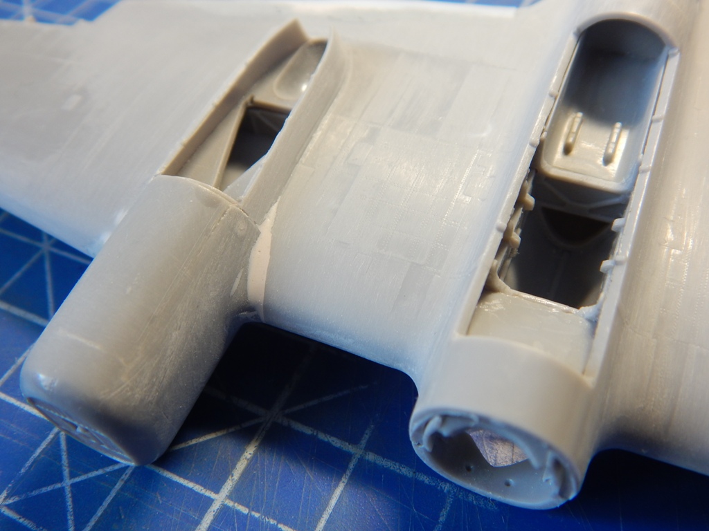 Про эту модель пишут (в частности в рецензии на нее в М/хобби 4/2007), что детали центроплана и крыла уже по хорде на 4 мм. Это не соответствует действительности - на самом деле уже на 1,5 мм и по задней кромке в районе мотогондол. Это связано с тиражированием деталей с мастер модели и последующим снятием с них форм гальваникой. Лечится очень просто - приклеивается полоски полистирола по задним кромкам и стачивается. Да, надо будет восстанавливать расшивку и клепку, но как я уже писал выше, это придется делать в любом случае.