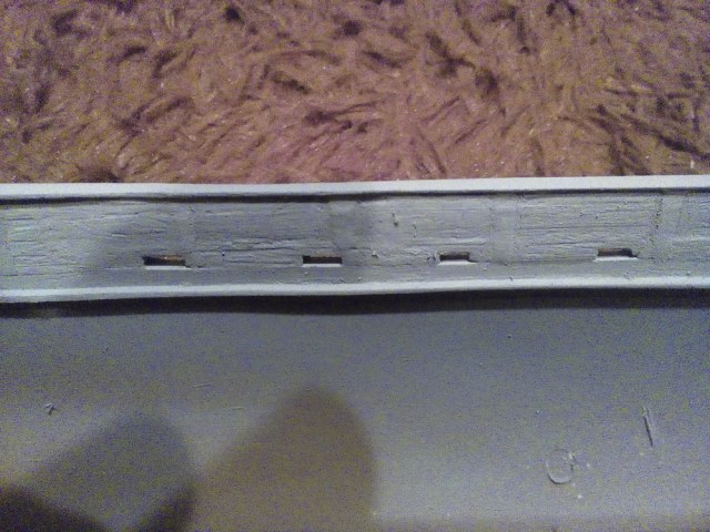 В планшире сделаны специальные выемки для приклеивания кофельнагельных планок и русленей. Сдается мне, что более реалистичным будет сделать планширь цельным, руслени приклеить снаружи, а кофельнагельные планки - изнутри фальшборта.