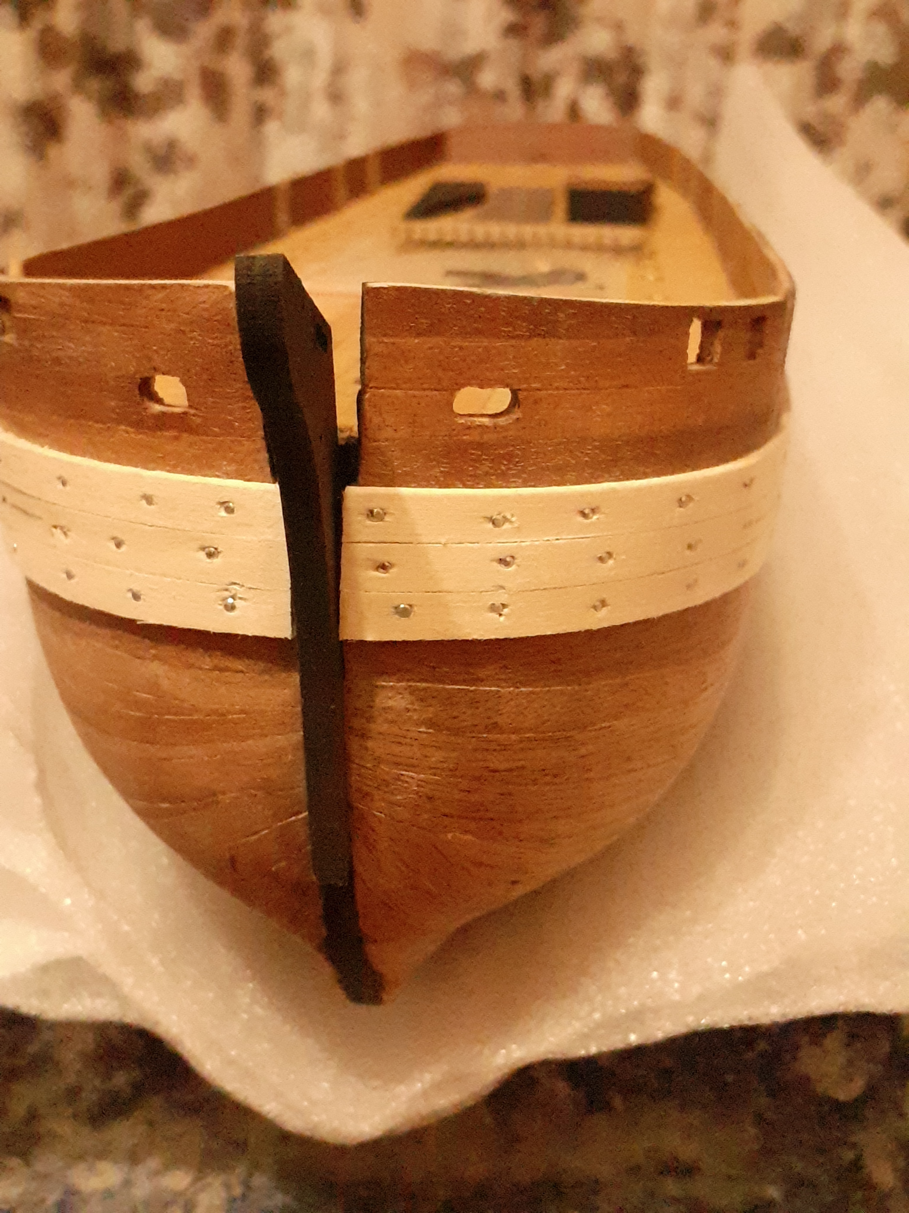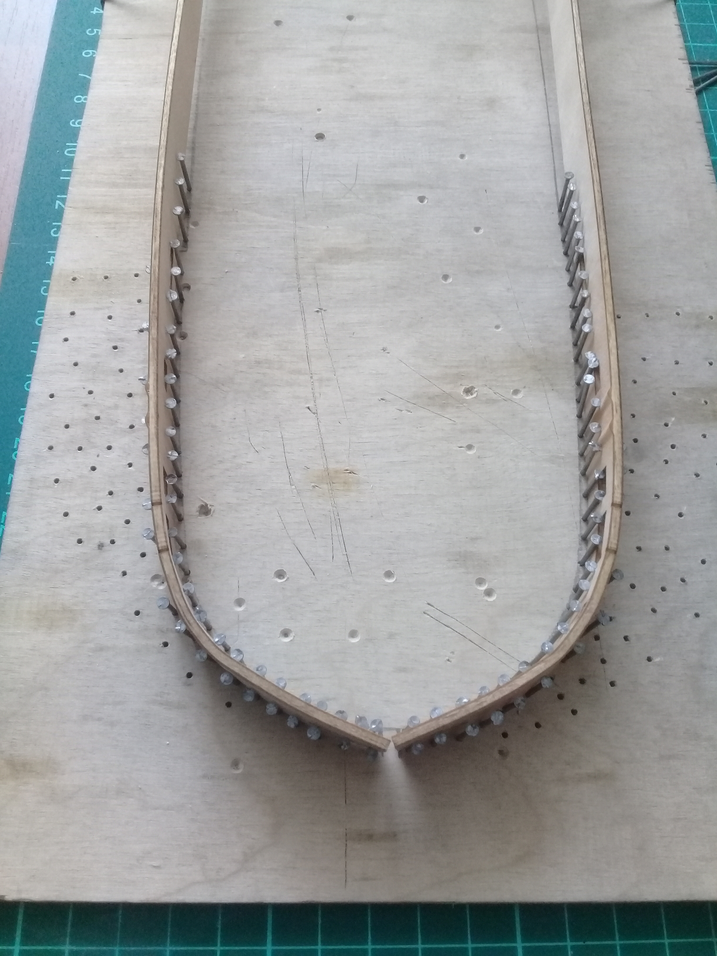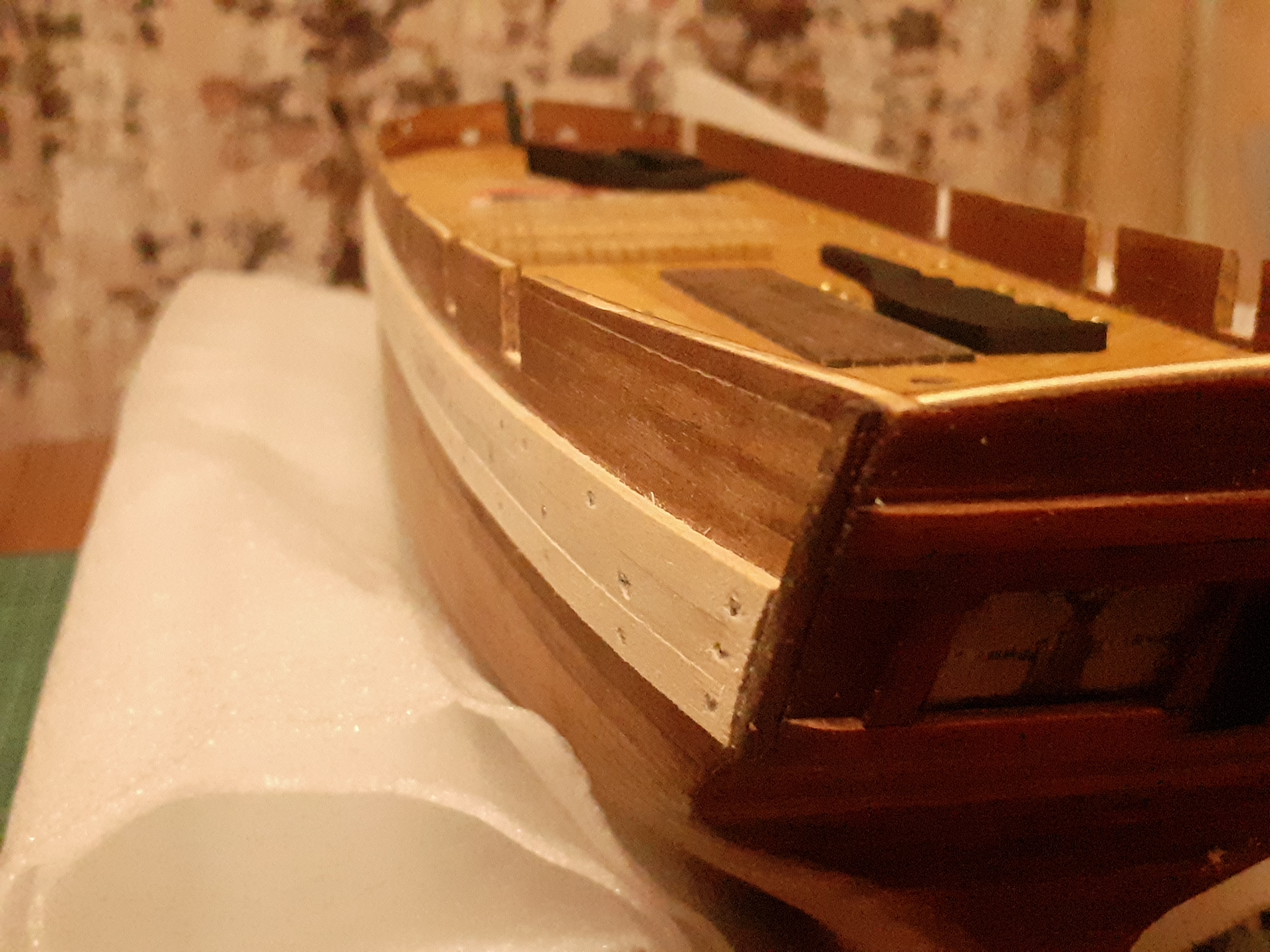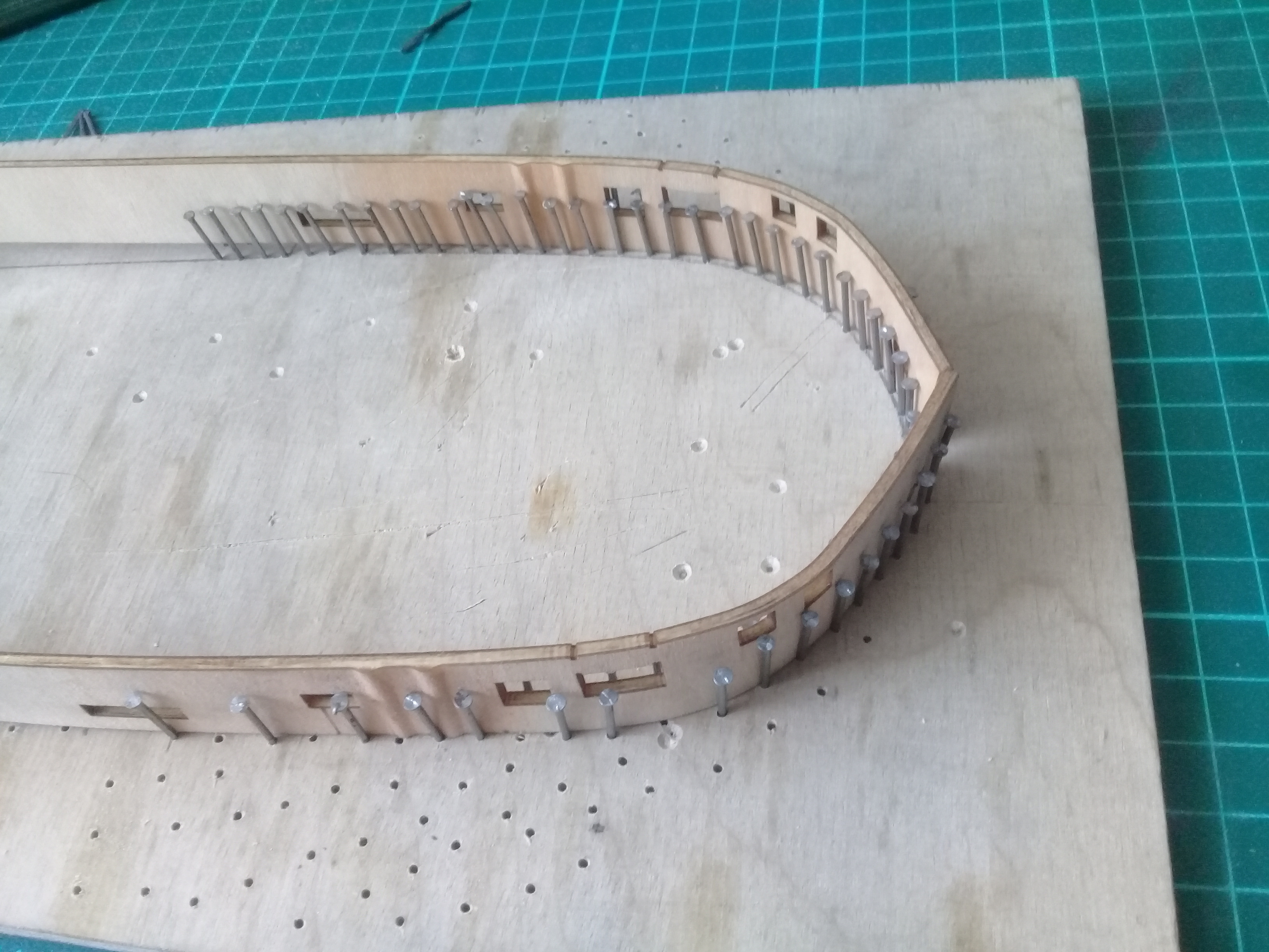 Ну а пока готовлюсь к обшивке. Отмочил и загнул фальшборт. Внутреннюю поверхность думаю тоже обшить орехом,
