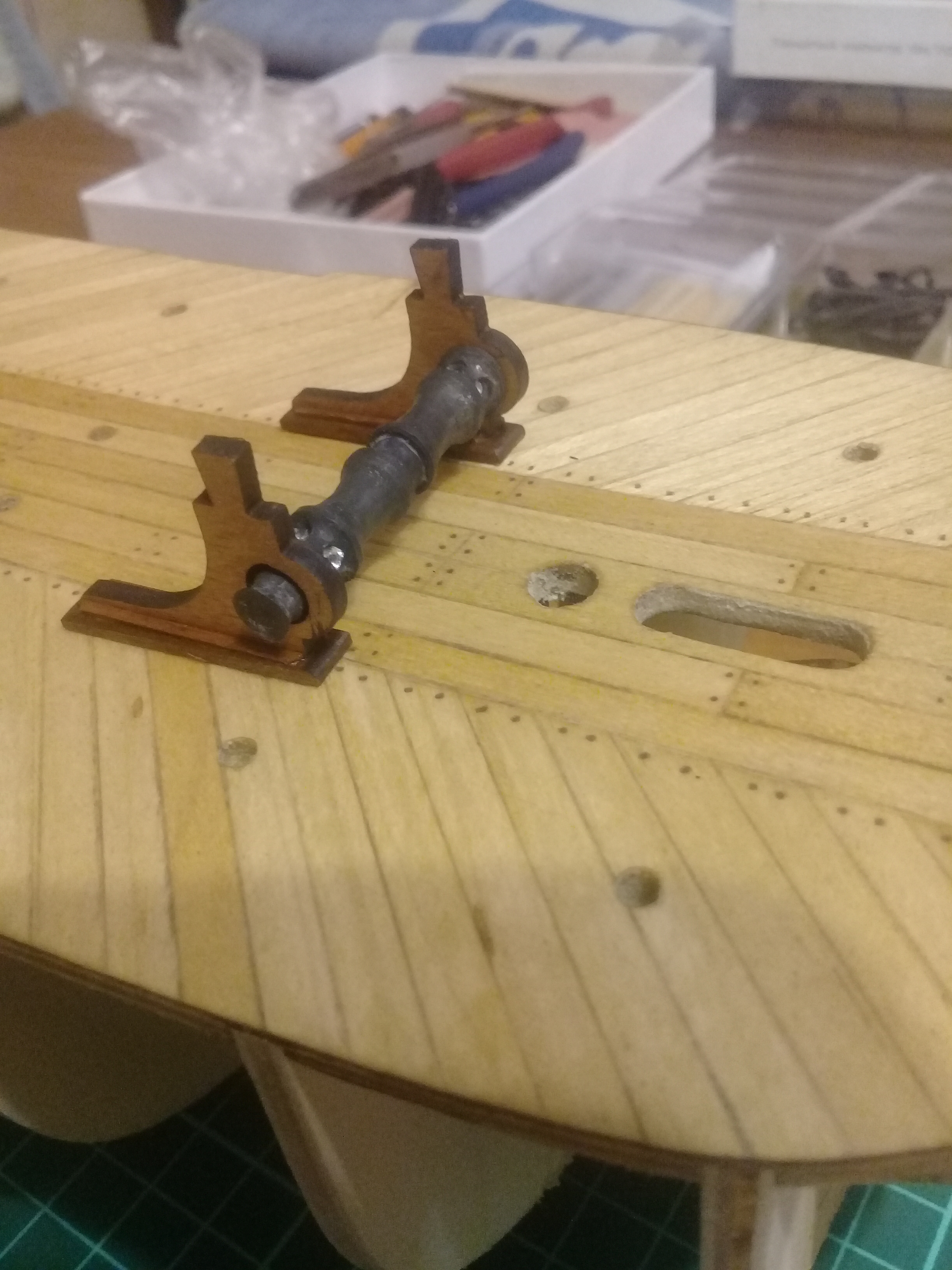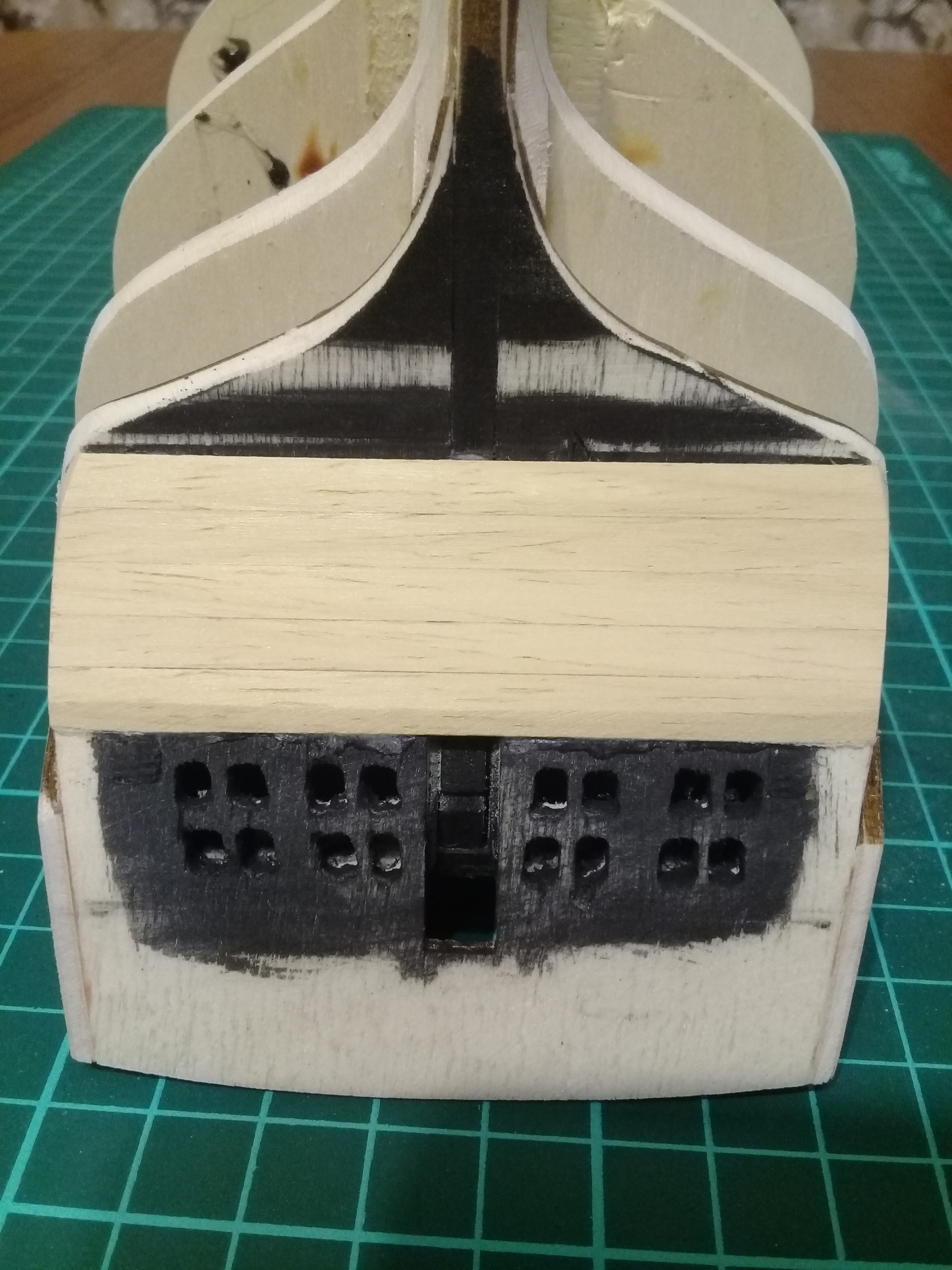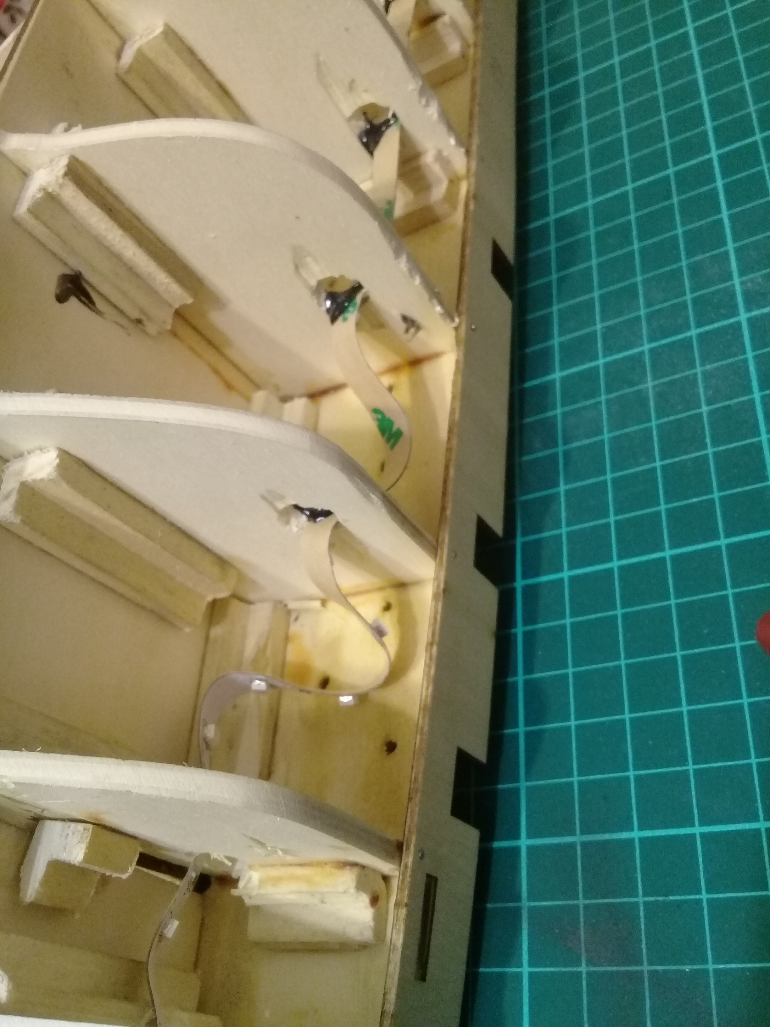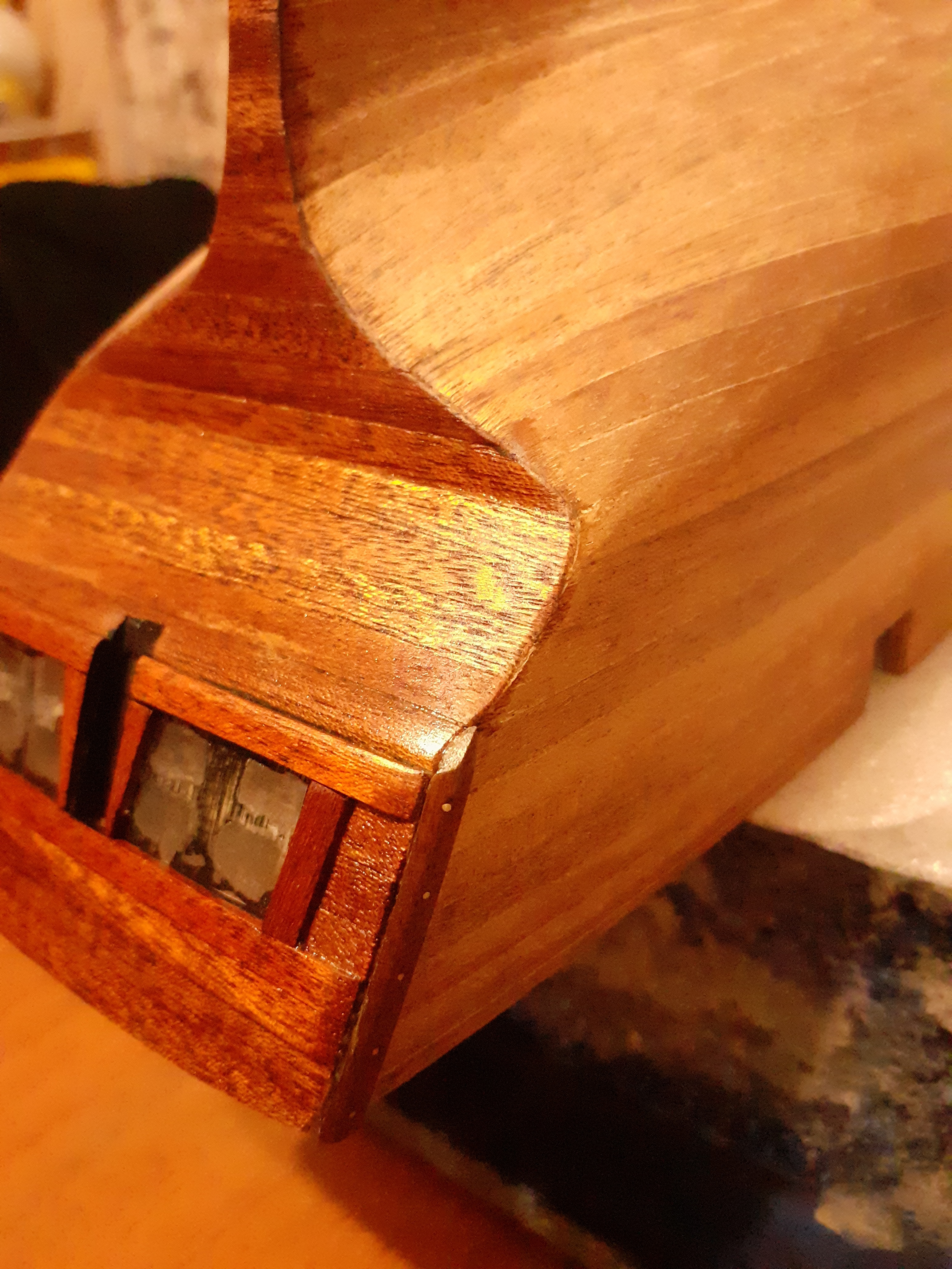 Ну а пока готовлюсь к обшивке. Отмочил и загнул фальшборт. Внутреннюю поверхность думаю тоже обшить орехом,