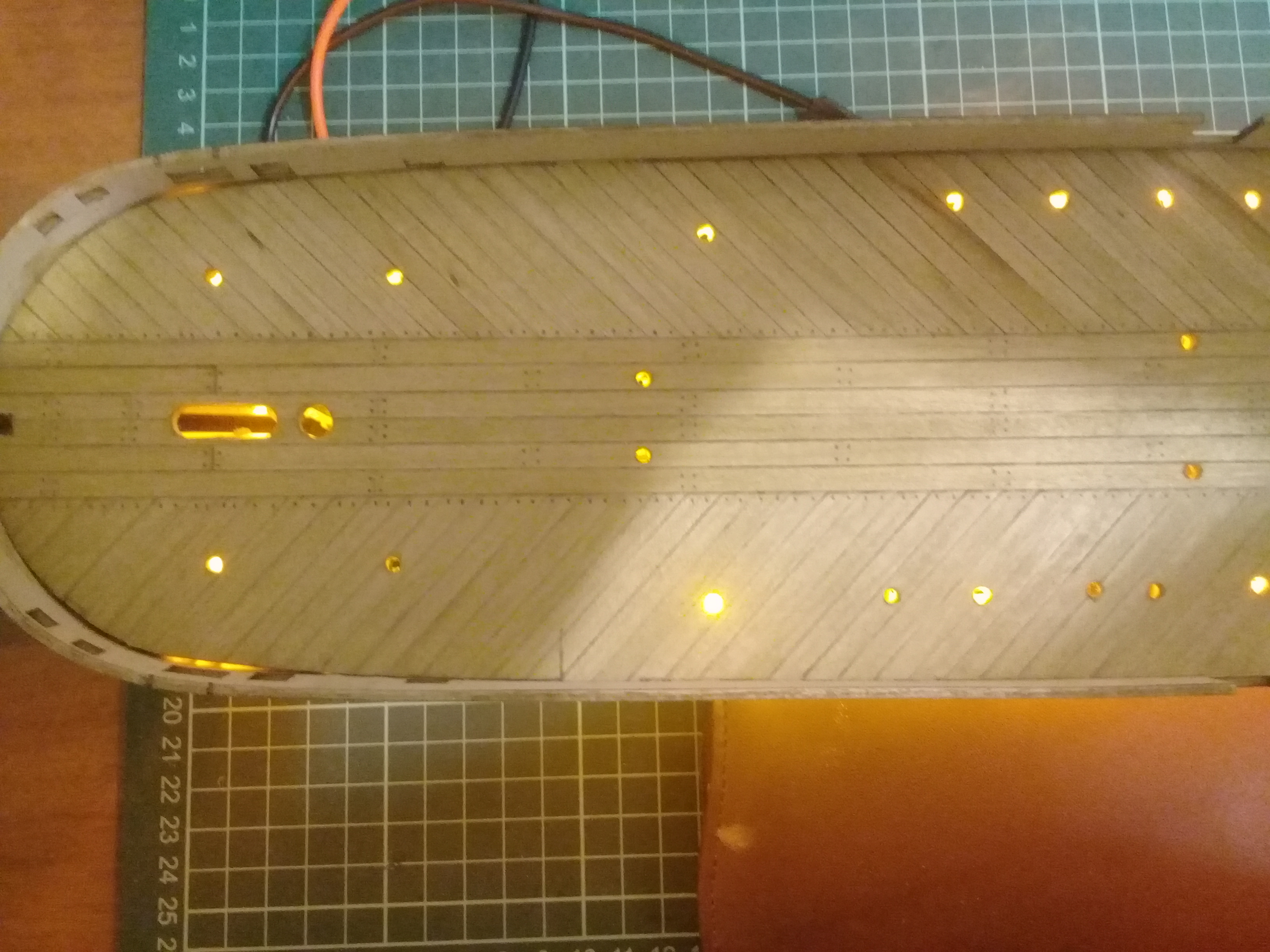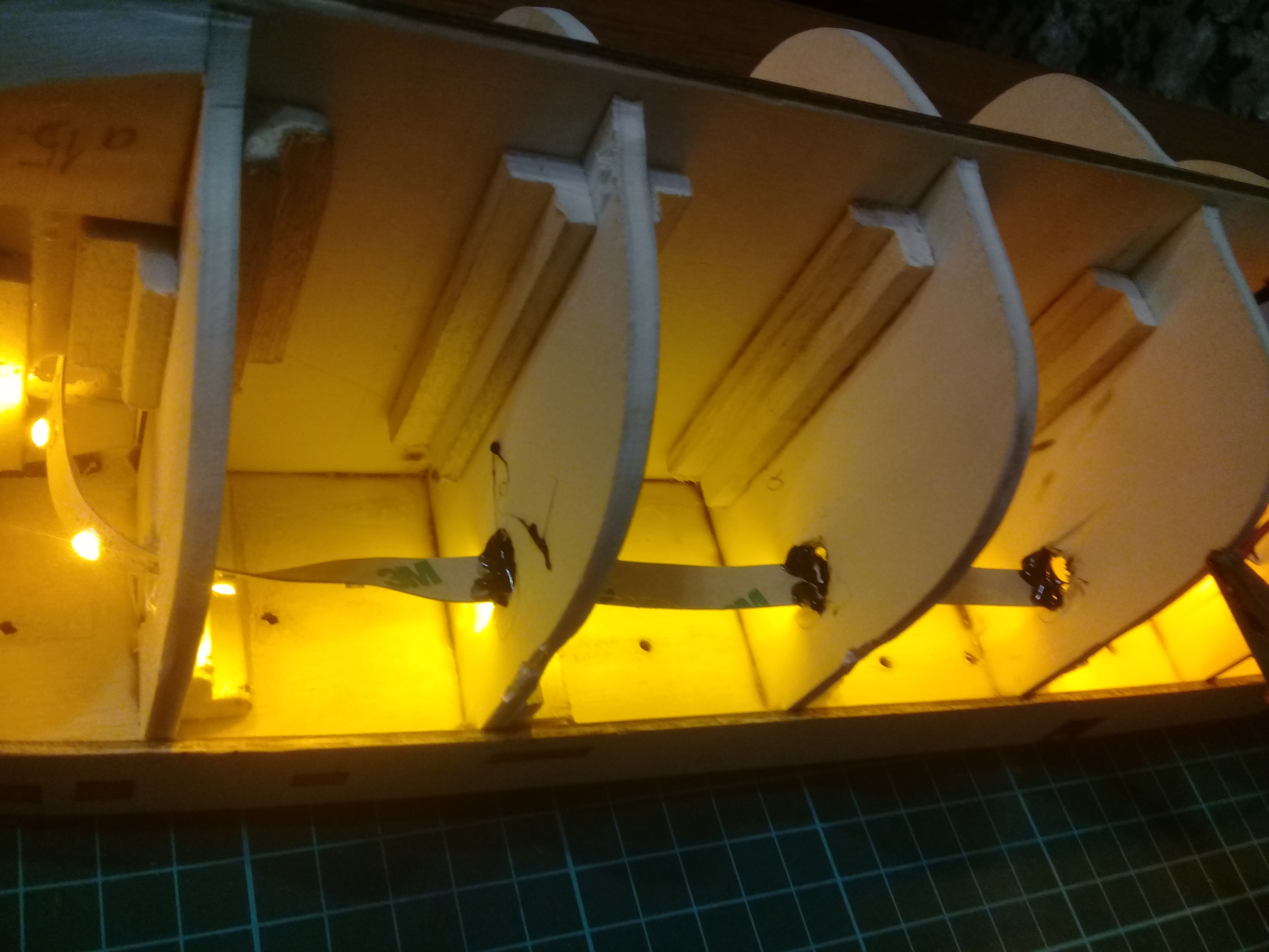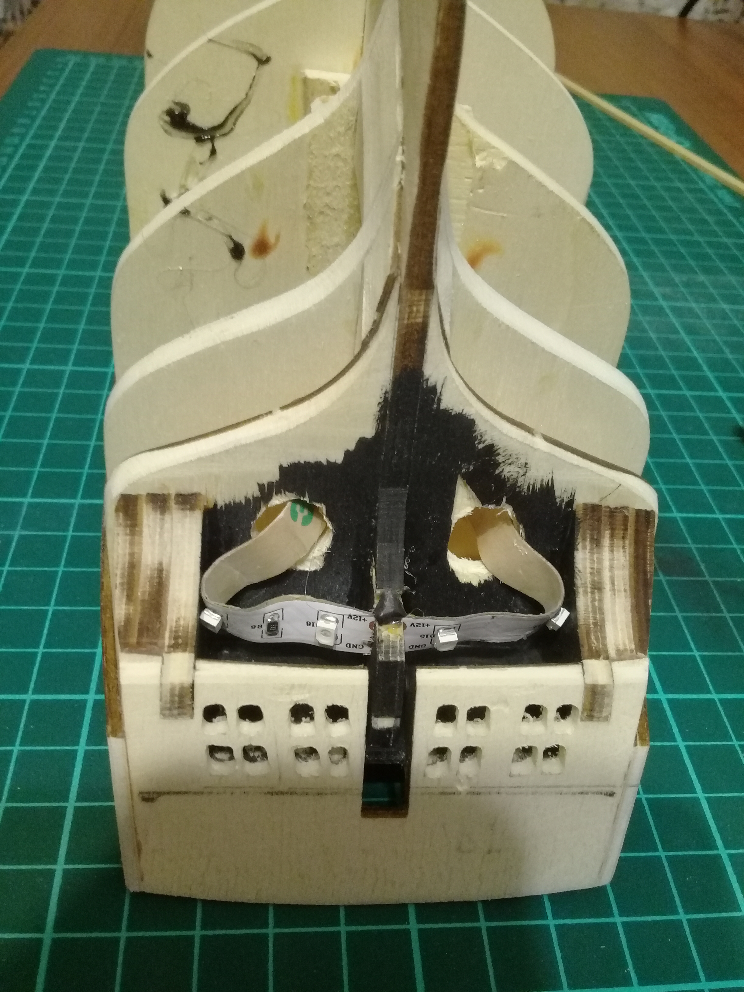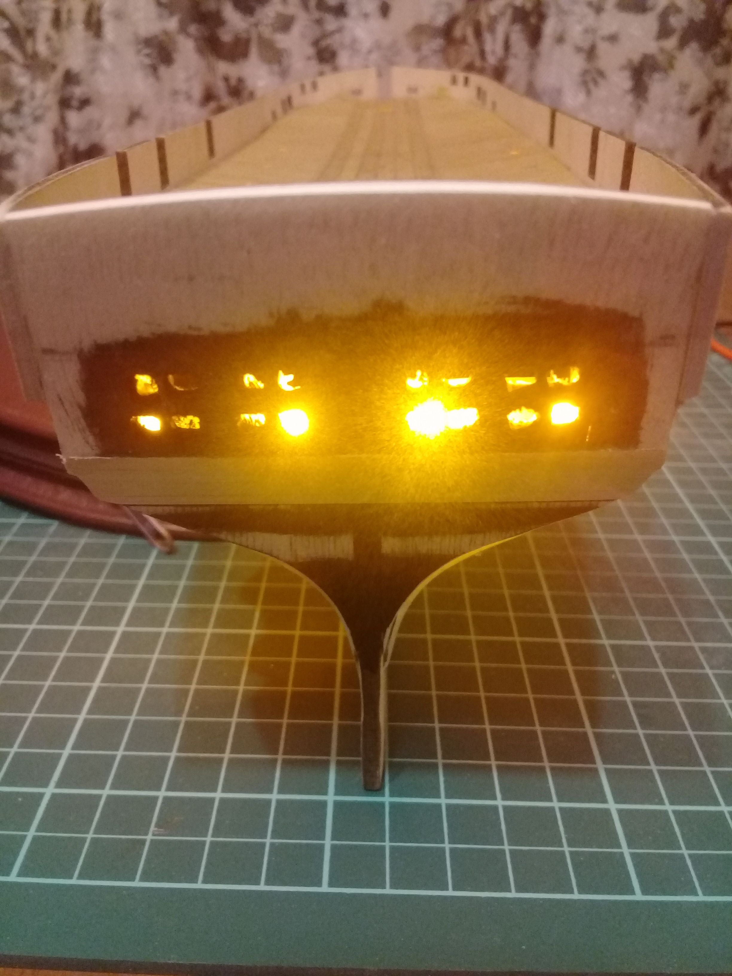 В данный момент так... нашиваю бархоут, закреплю киль, потом подготовка основания-подставки, будет 100×50см, тоже с подсветкой, торосы, снег, ну и думаю под стекло закрыть...