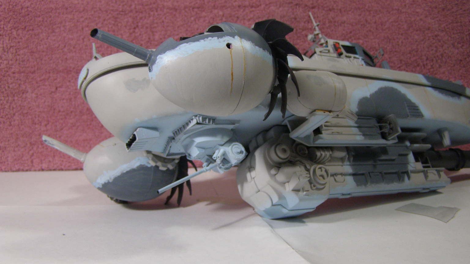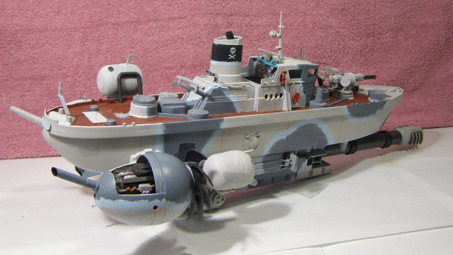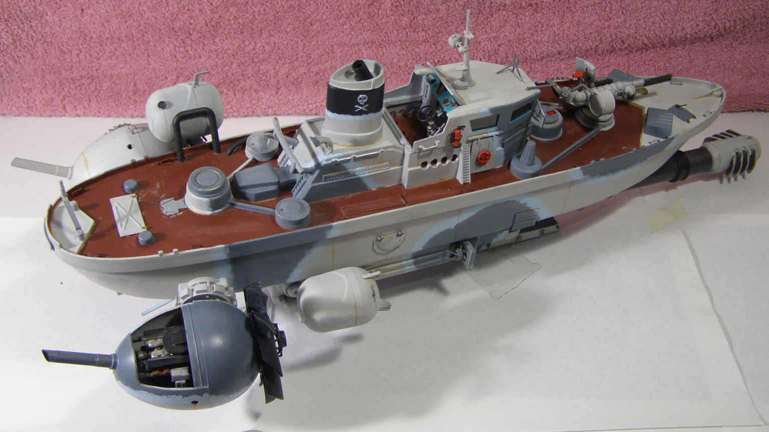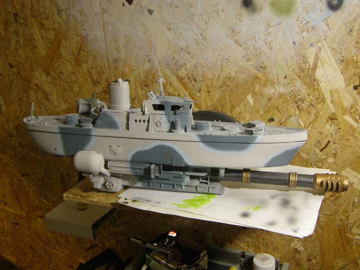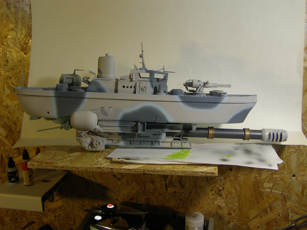 Сильно подставил грунт автомобильный, давший лютую шагрень... Огрехи в покраске умышленно не исправлял - масштаб для кораблей очень крупный и огрехи "ручной" покраски должны быть видны (всё-таки по легенде "на коленке" собирали же)