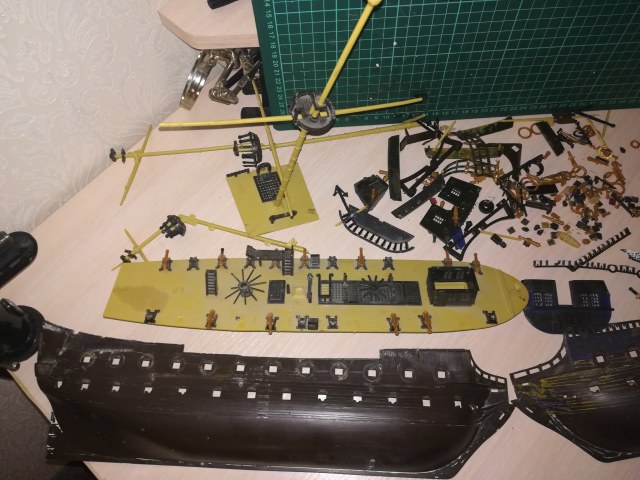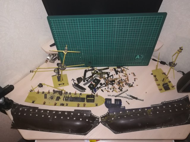 Очистил родной опердек от деталей, в принципе без особо критических повреждений палубы. Правда некоторые элементы пришлось удалять достаточно варварскими методами. Так же удалил с половинок корпуса некоторые детали например ограждения,перо руля и платформы под установку артиллерии. Скрепил корпус зажимами и прикинул положение палубы на новом месте. из старого опердека получится вполне годный гондек , надо только будет нарастить с боков несколько миллиметров, часть люков заклеить а часть прорезать и немного подогнать по длинне