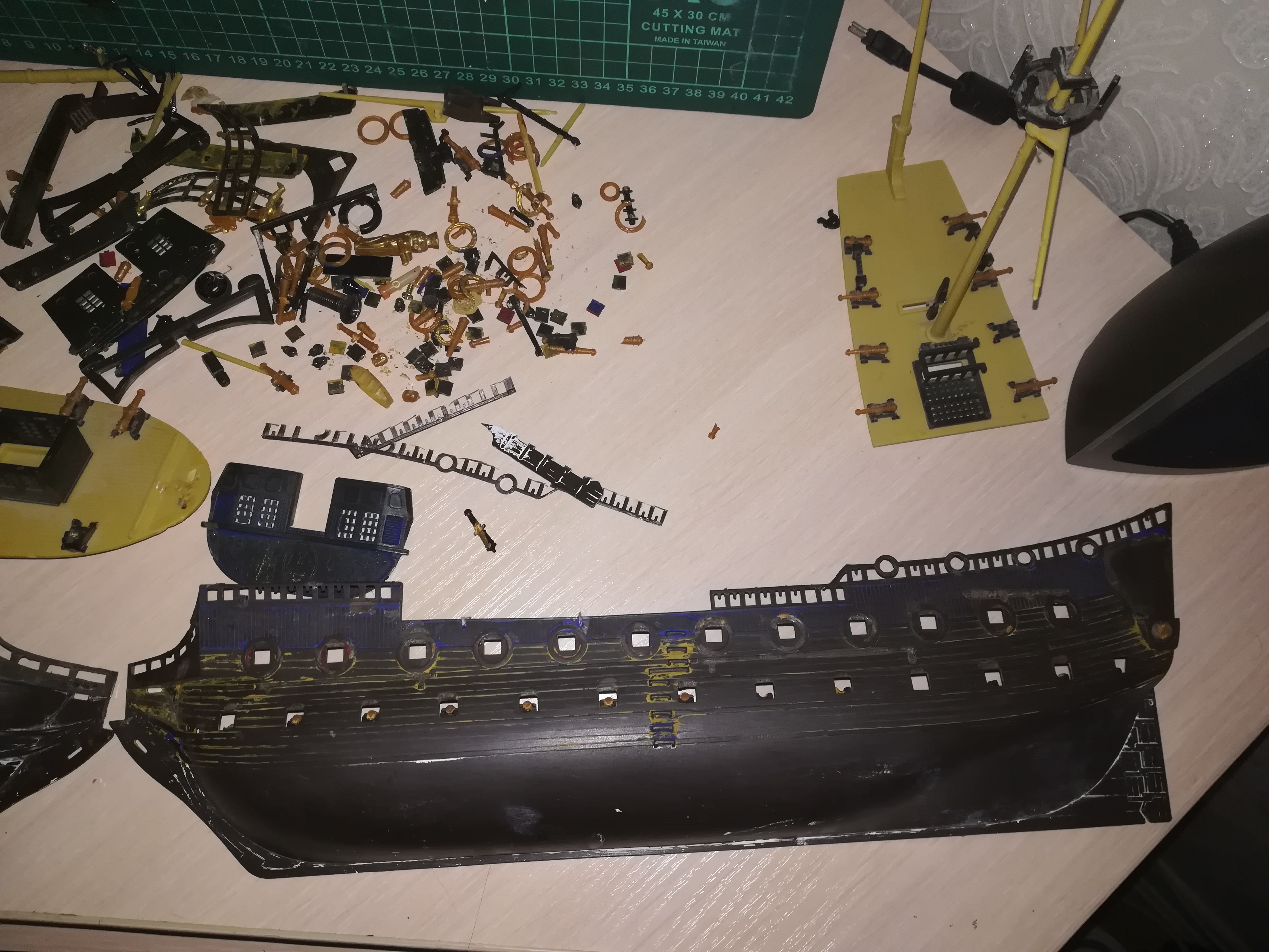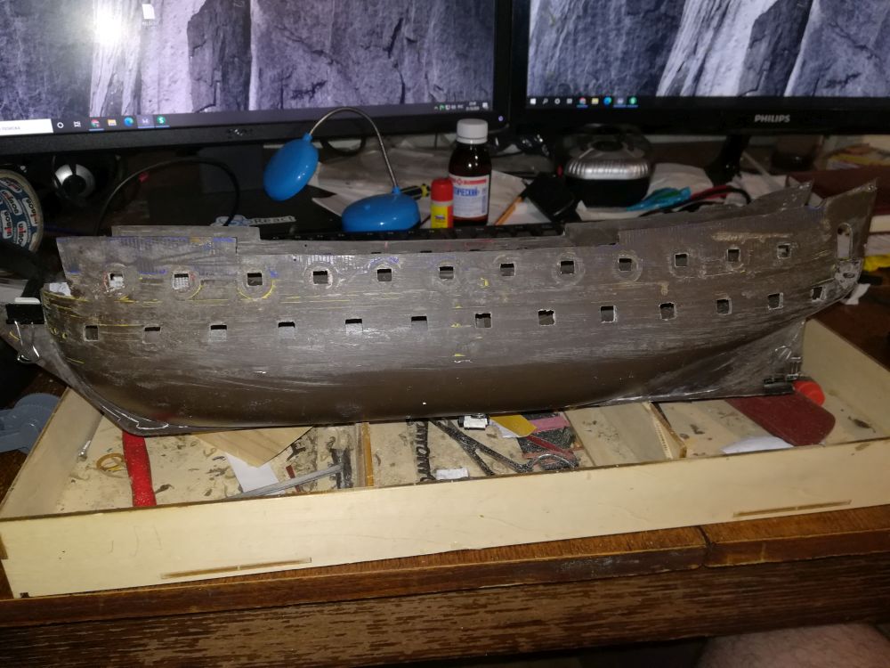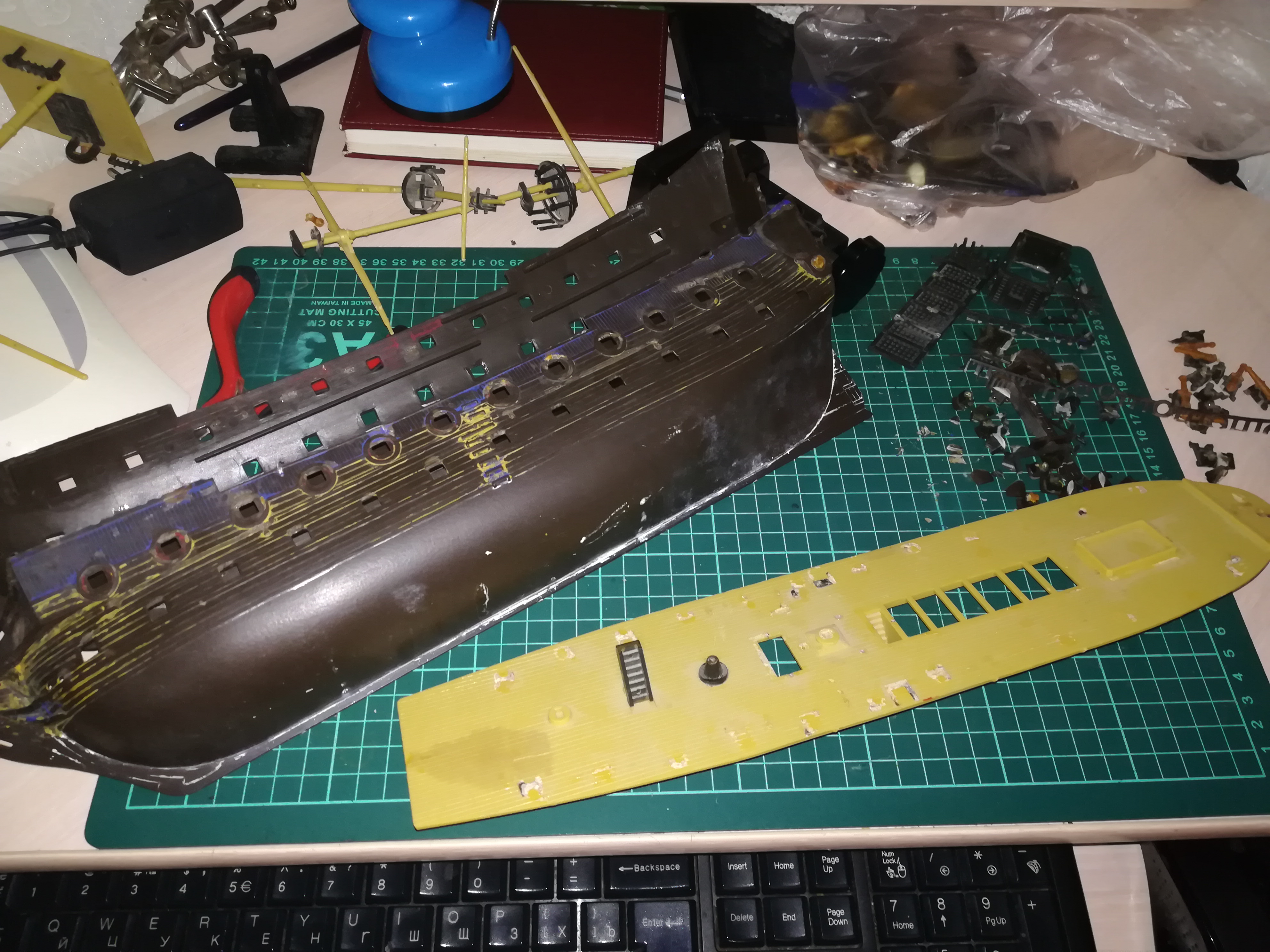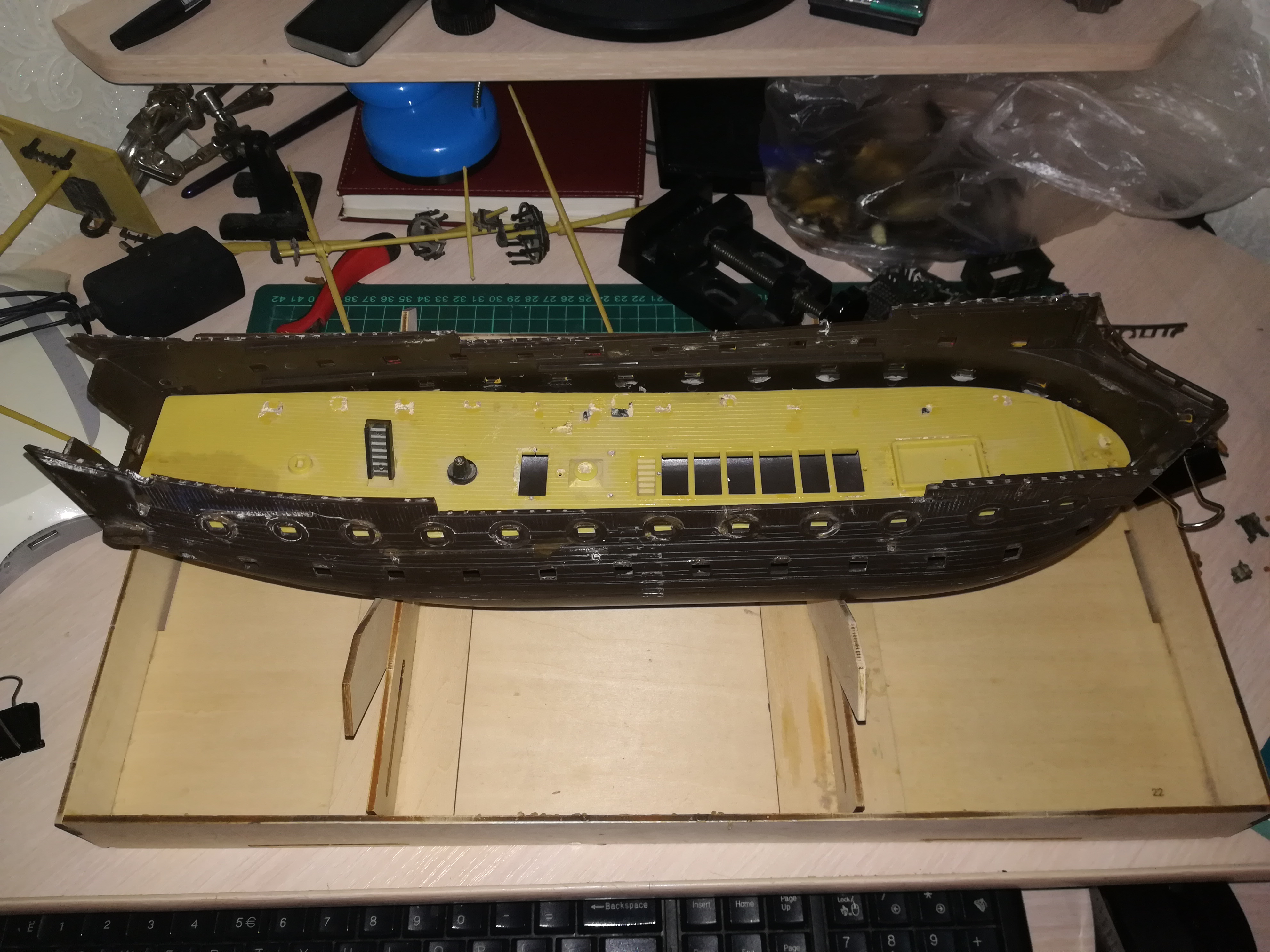 ну а бонусом увлекся и раширил орудийные порды гондека, потому как в очередной раз просматривая чертежи понял что в родные порты правильная 16-фунтовка входит уж как-то плотненько, после расширения портов вид у корпуса стал вот прямо какой-то правильный чтоле.