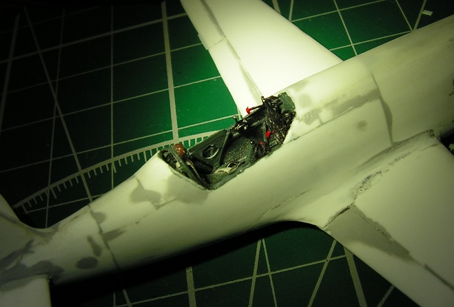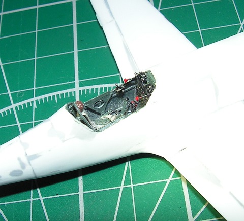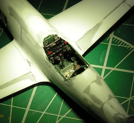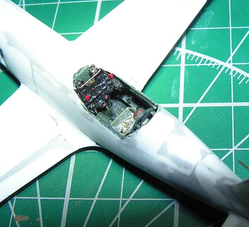 Попытки снять интерьер, добитый до состояния "перед закрытием фонарем". Поскольку пластик самолета белый, а интерьер не слишком светлый, то что-то снять удалось только при помощи вспышки и/или доп.подсветки. Причем если глазом пыль не видна, то фотоаппарат с доп подсветкой высвечивает ее с абсолютной беспощадностью. Перед приклейкой фонаря продую воздухом из аэра и протру проволочкой с влажной ваткой.