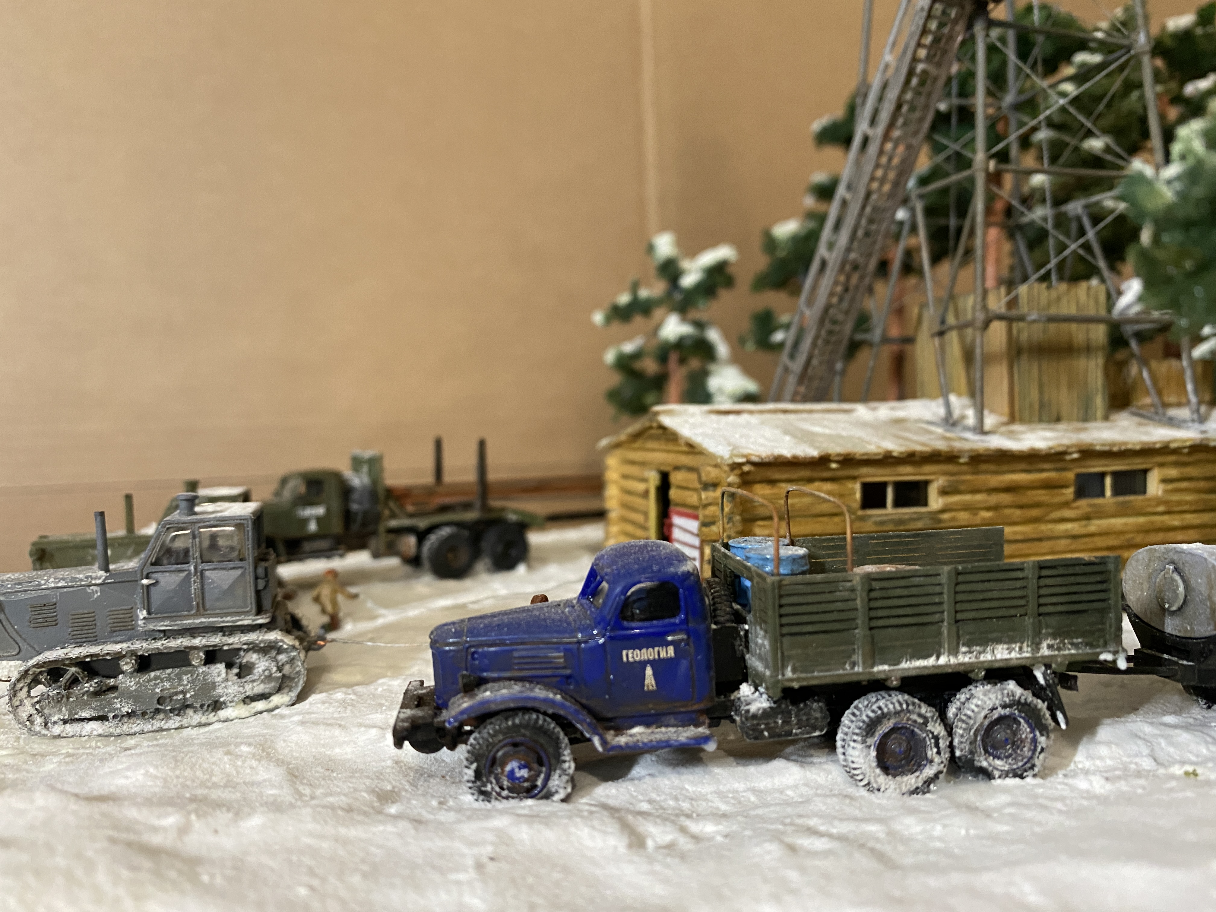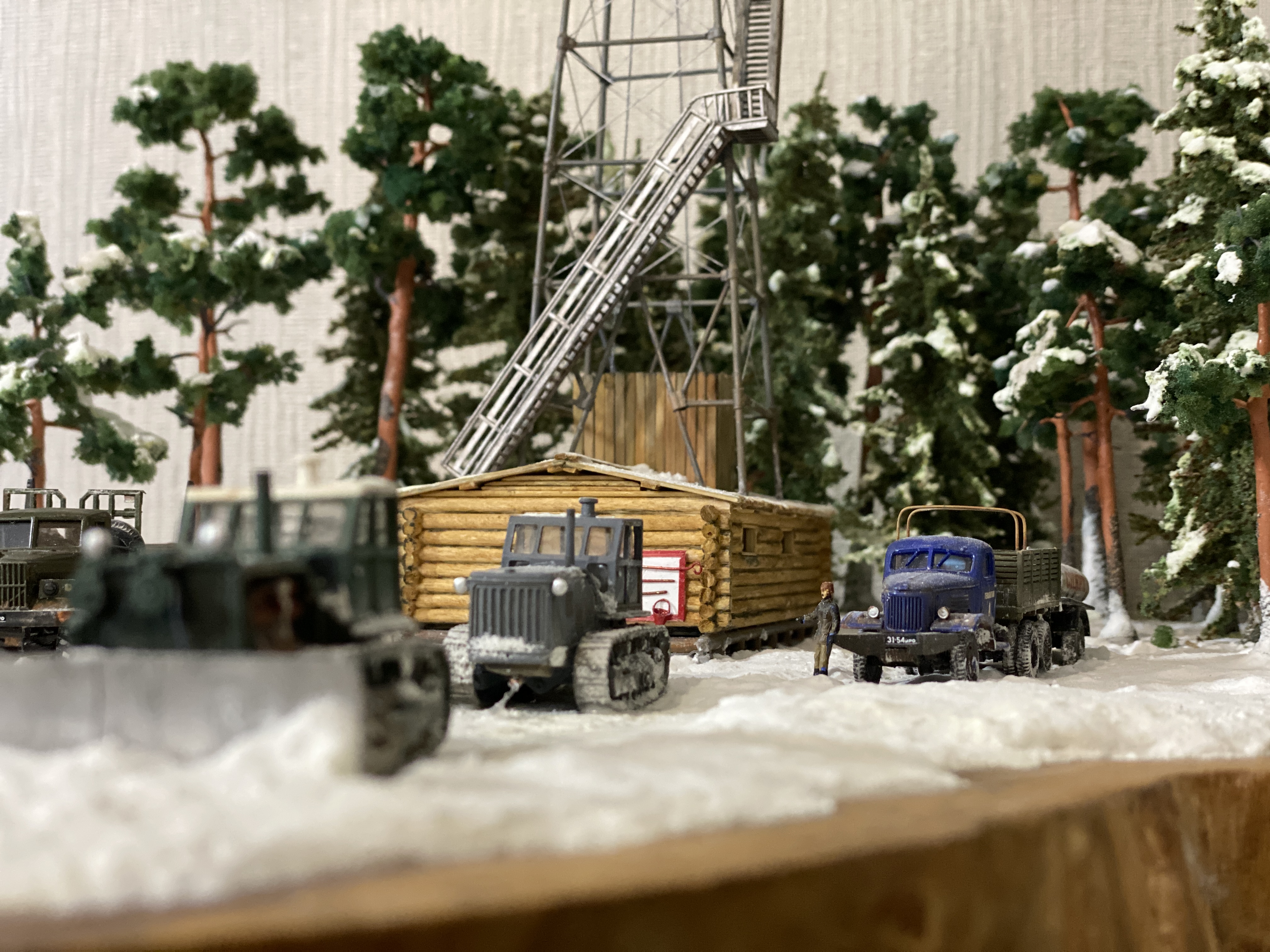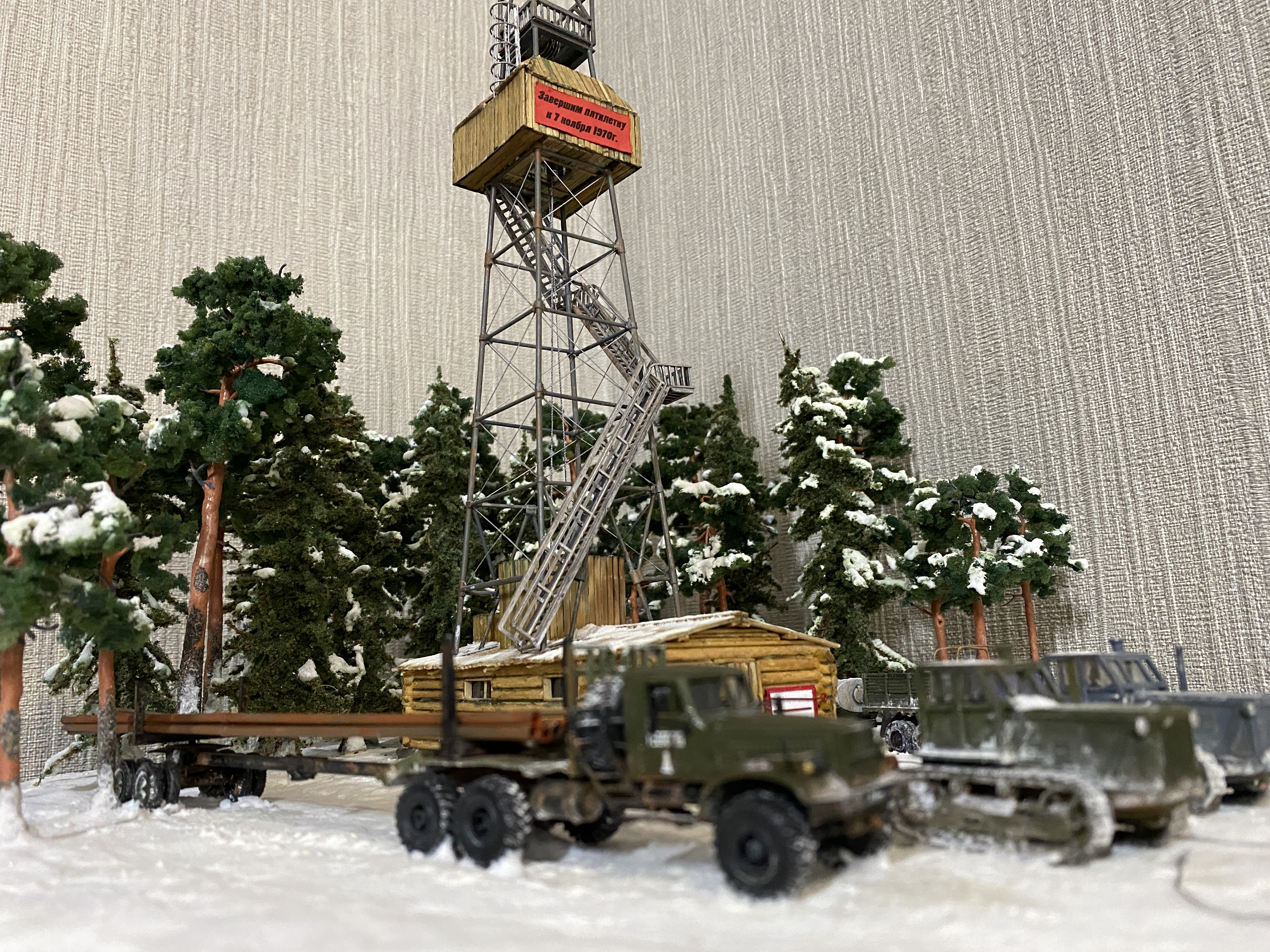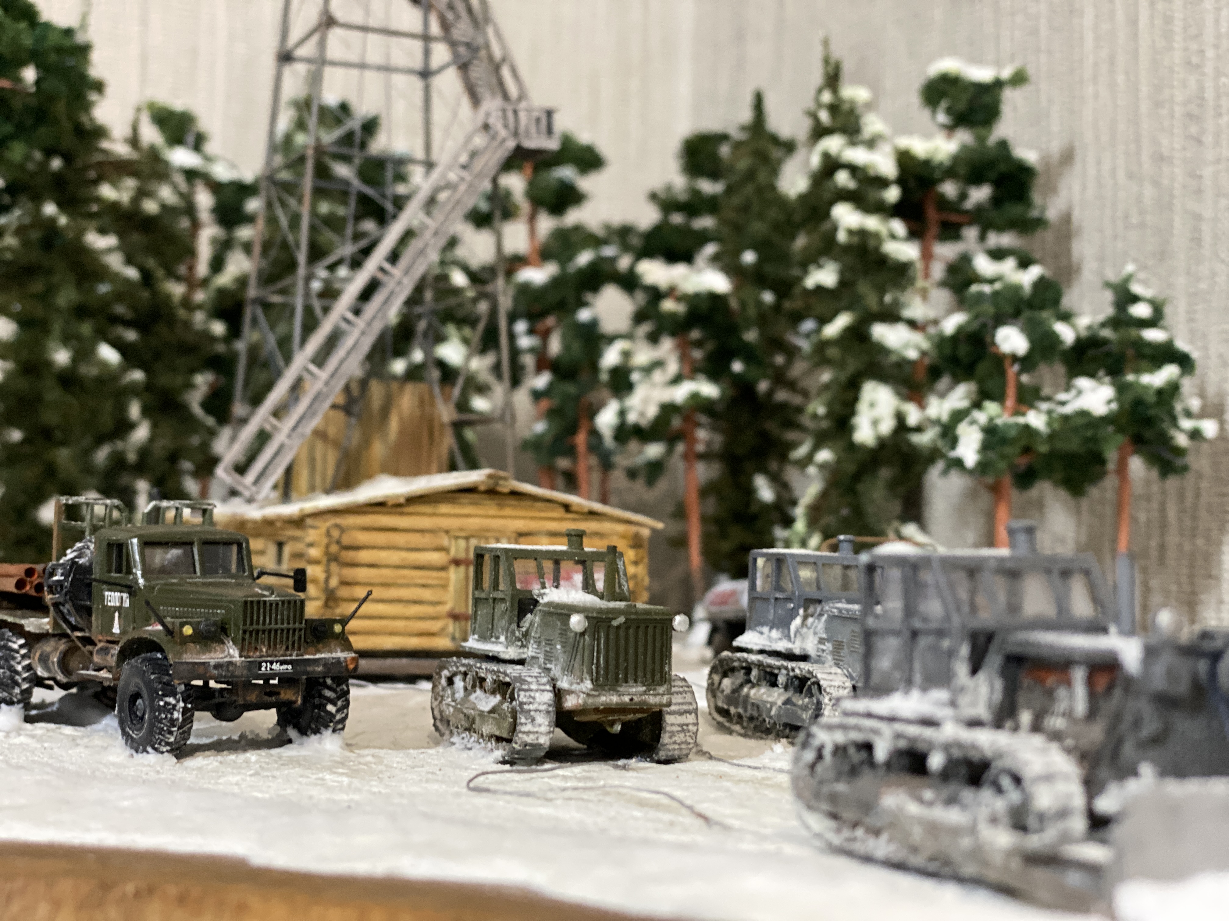 Самое сложное для меня было, как ни странно это снег, он то желтел на основании, то зеленел на деревьях, задолбался искать нужные пропорции, перепробовал три разных клея, в итоге остановился на пва титан для древесины. Сама буровая выполнена из шпажек, вышка из материалов от zip maket. Косяков конечно же хватает, снег (сода) падла, на второй день, всё-таки местами впитала зелень от деревьев, корректировал белой краской, скорей всего позже надо будет опять пройтись. Краски, пигменты, смывки почти все от тамии. Учился по роликам из ютуба) По ходу сборки понял, что «замахнулся я конечно на самого Шекспира», но заднюю уже было поздно врубать, т.к. обещал коллегам и сам же предложил идею. Видел работы в галлереи Каропки, понимаю, что есть куда стремится, работы просто супер!