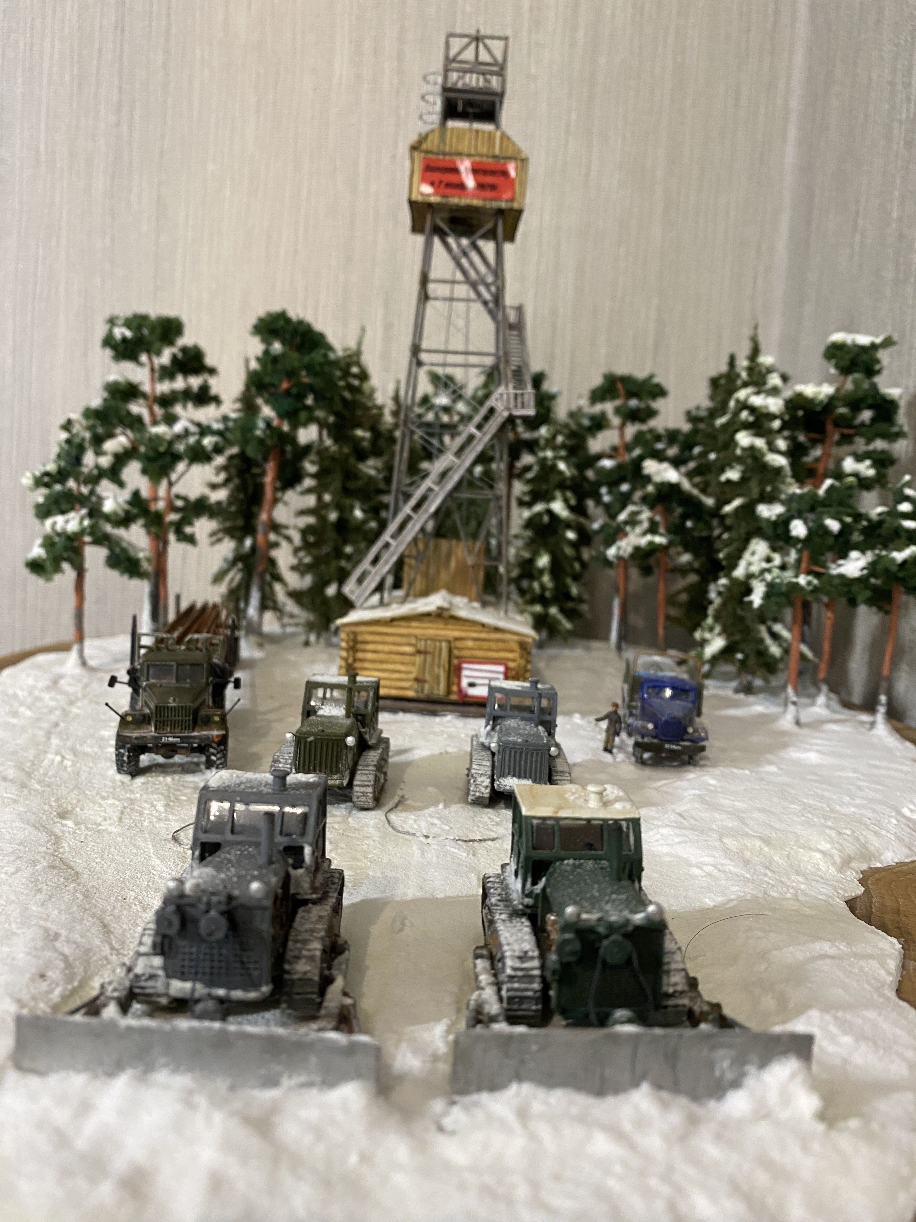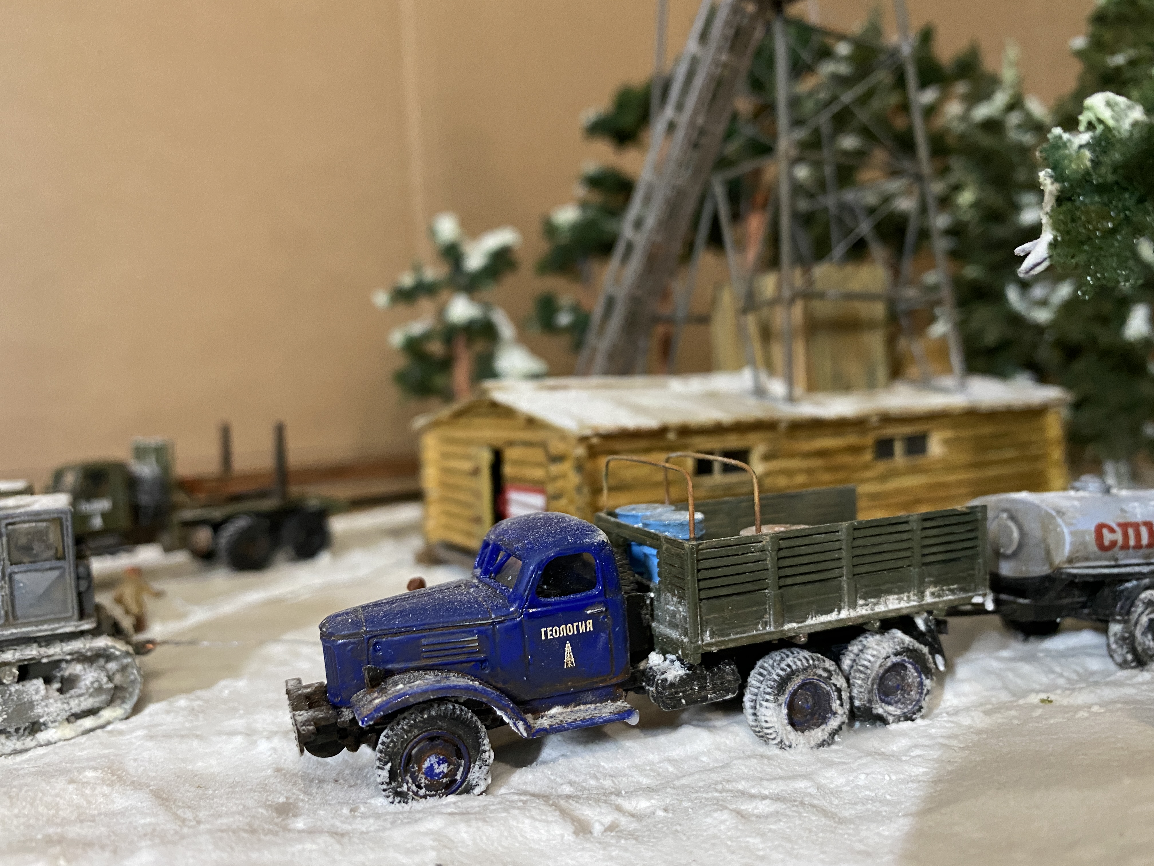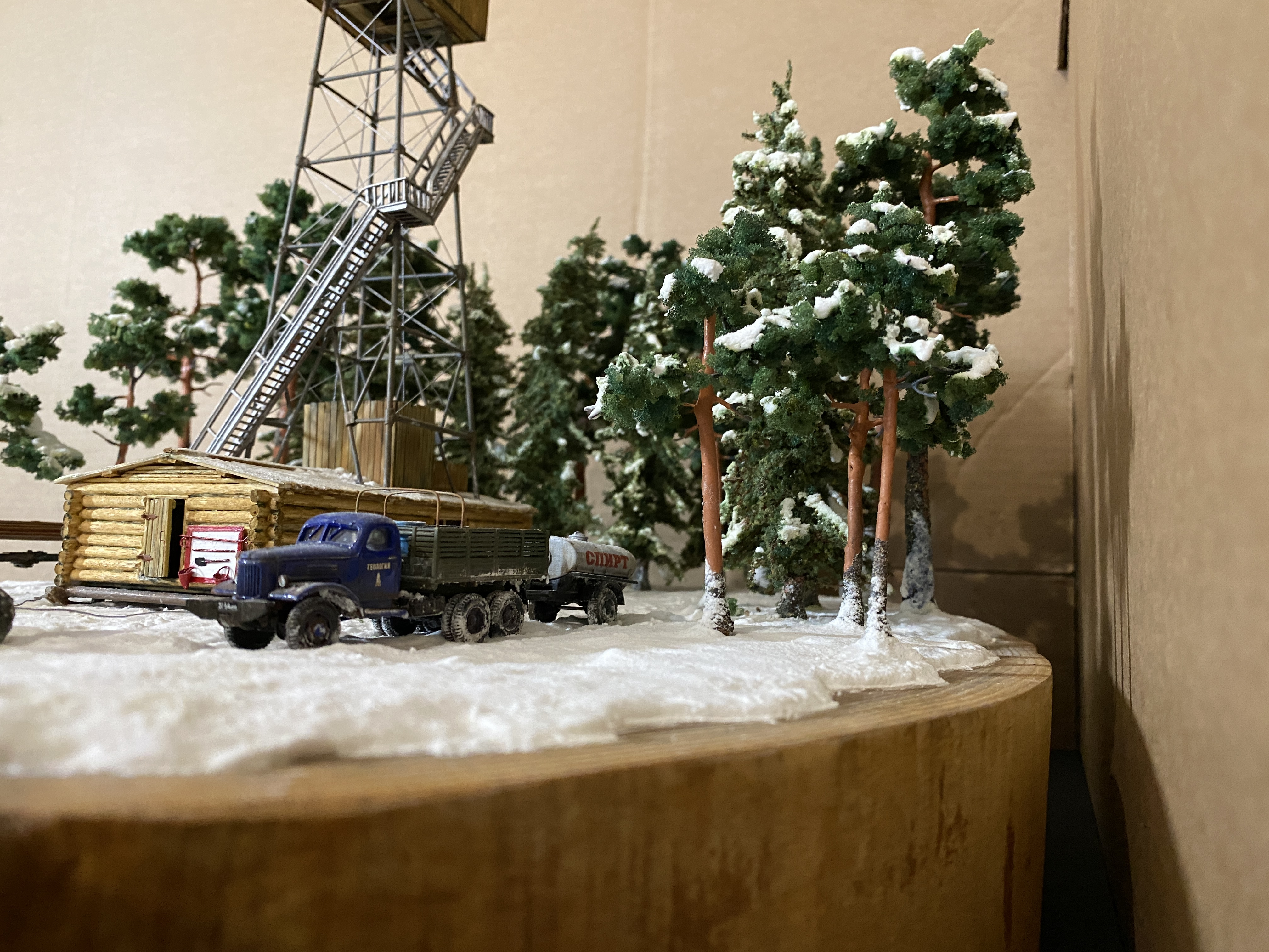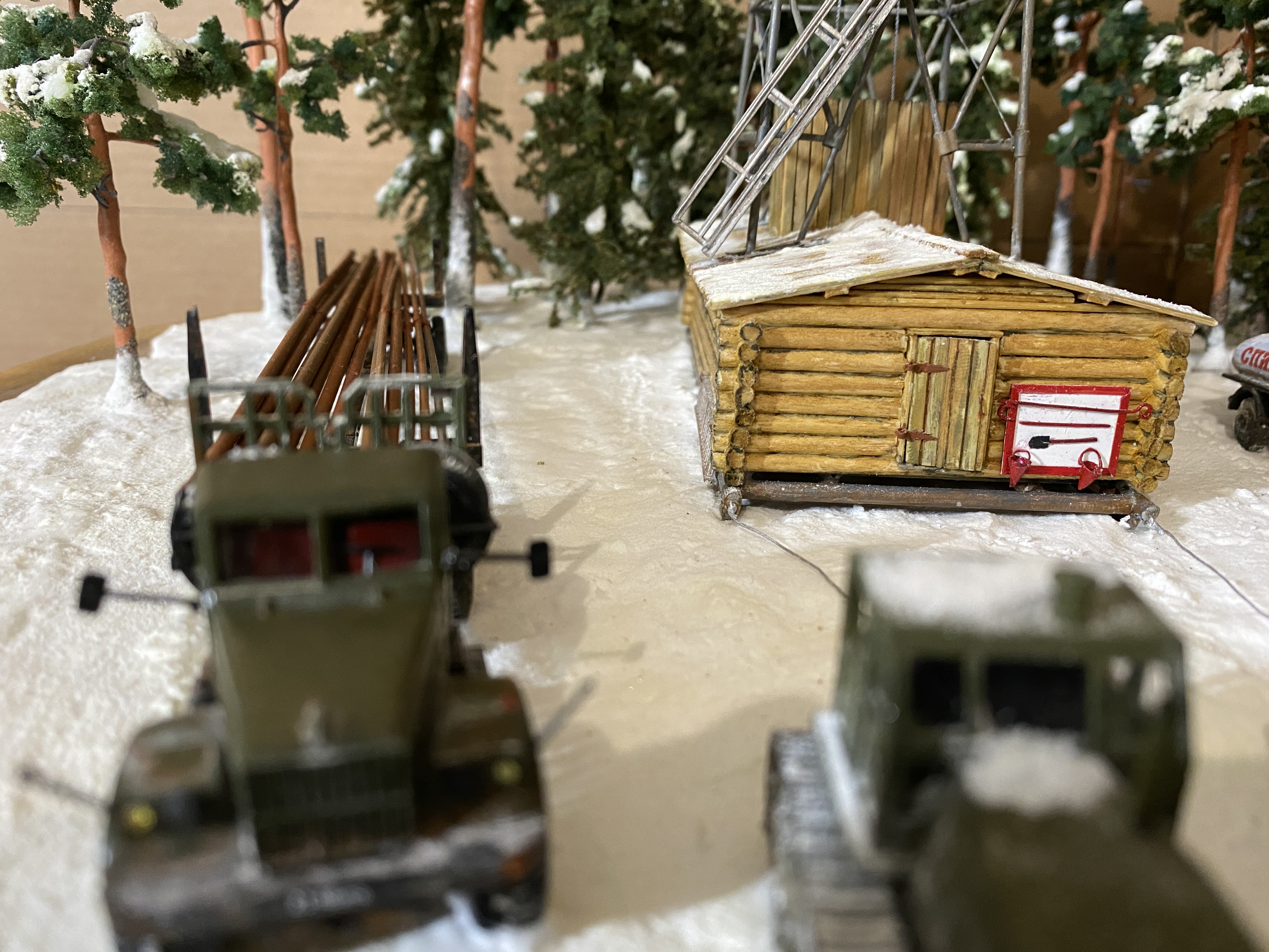 Самое сложное для меня было, как ни странно это снег, он то желтел на основании, то зеленел на деревьях, задолбался искать нужные пропорции, перепробовал три разных клея, в итоге остановился на пва титан для древесины. Сама буровая выполнена из шпажек, вышка из материалов от zip maket. Косяков конечно же хватает, снег (сода) падла, на второй день, всё-таки местами впитала зелень от деревьев, корректировал белой краской, скорей всего позже надо будет опять пройтись. Краски, пигменты, смывки почти все от тамии. Учился по роликам из ютуба) По ходу сборки понял, что «замахнулся я конечно на самого Шекспира», но заднюю уже было поздно врубать, т.к. обещал коллегам и сам же предложил идею. Видел работы в галлереи Каропки, понимаю, что есть куда стремится, работы просто супер!