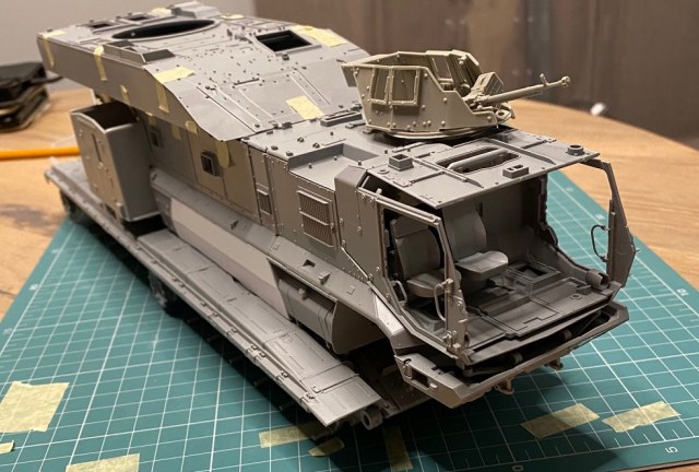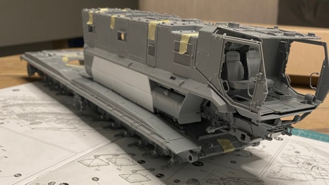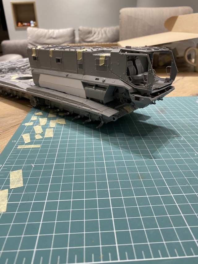 В процессе примерок и раздумий стало понятно, что вторым уровнем надстроек тушка двухосного Тигра будет смотреться очень спорно. приобрел комплект БТР Бумеранг. Буду его перепиливать вторым этажом. Собрал его тоже на сухую, примерил - органично - его корма будет нависать на 20-30мм на грузовой платформой, выглядит хорошо.