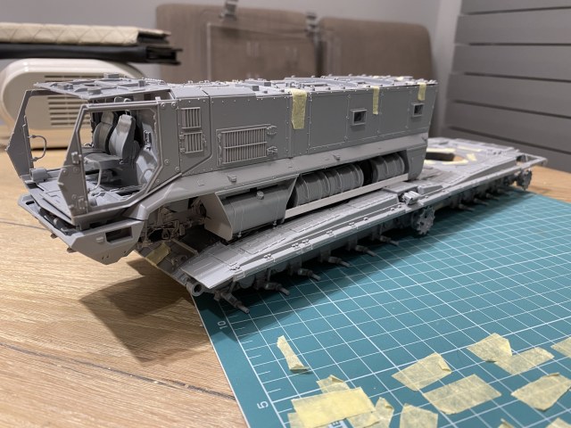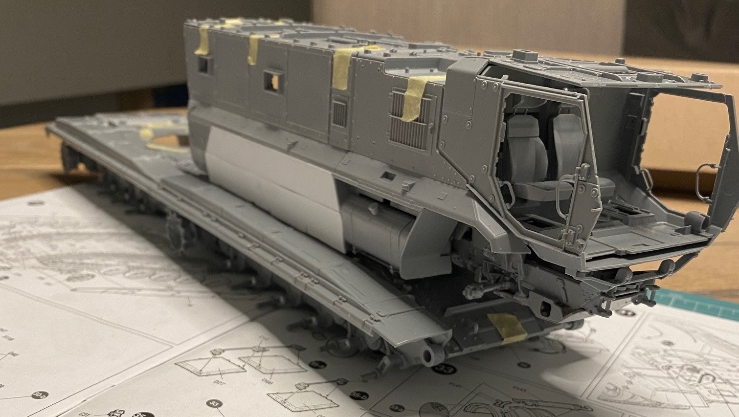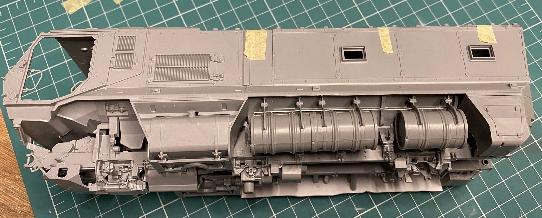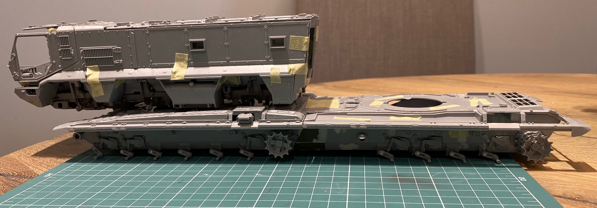 Собрал на сухую (на малярный скотч) тушку Тайфуна, начал примерять. Чтобы за ним встал кунг и далее бортовая платформа/кузов с краном (про него чуть позже, уже купил и собрал) пришлось Тайфун выдвинуть вперед. Смотрится гармонично... но я пока думаю, оставлять ли так.