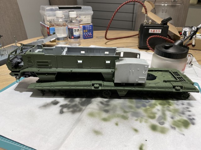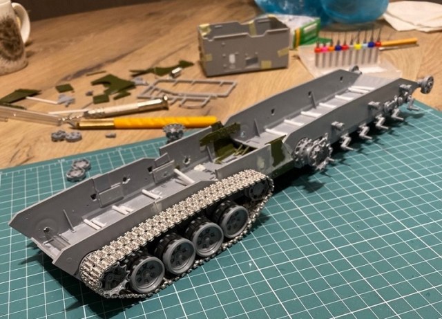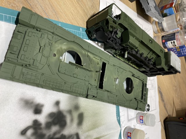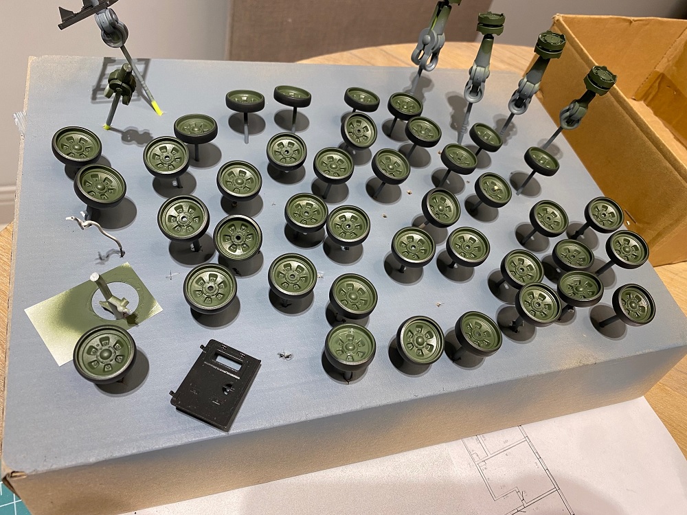 Параллельно делаю колеса для ходовки: грунт, два цвета, лак. Впереди пигменты/смывки и пр. Колес адское множество... отнимает много времени. Особенно когда первый раз делаешь покраску с резиновыми катками.