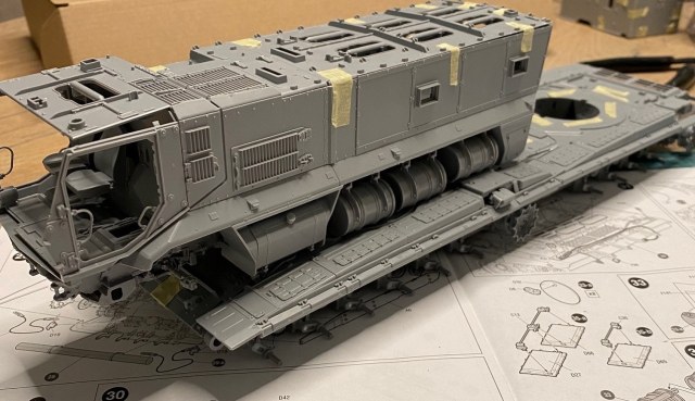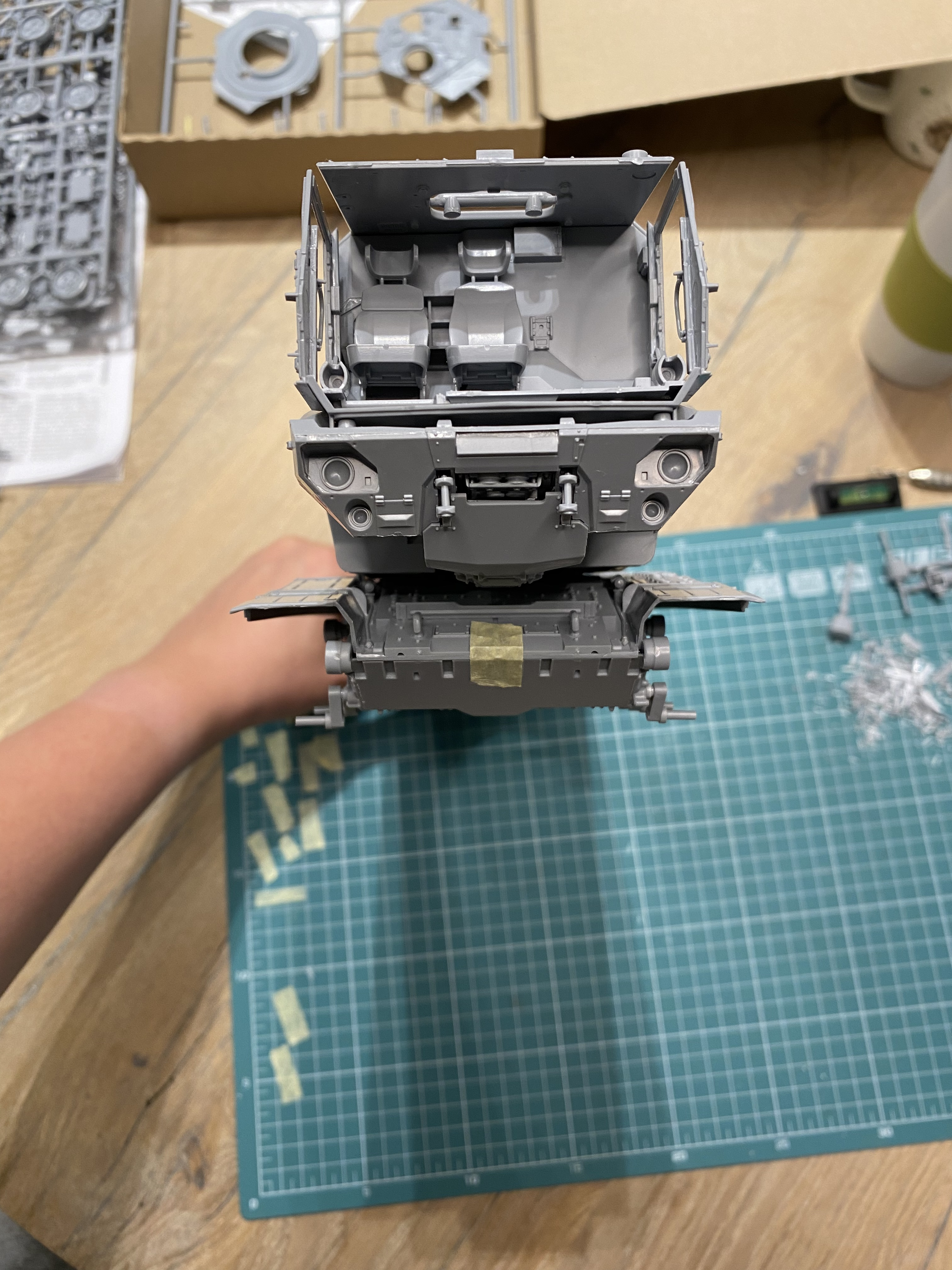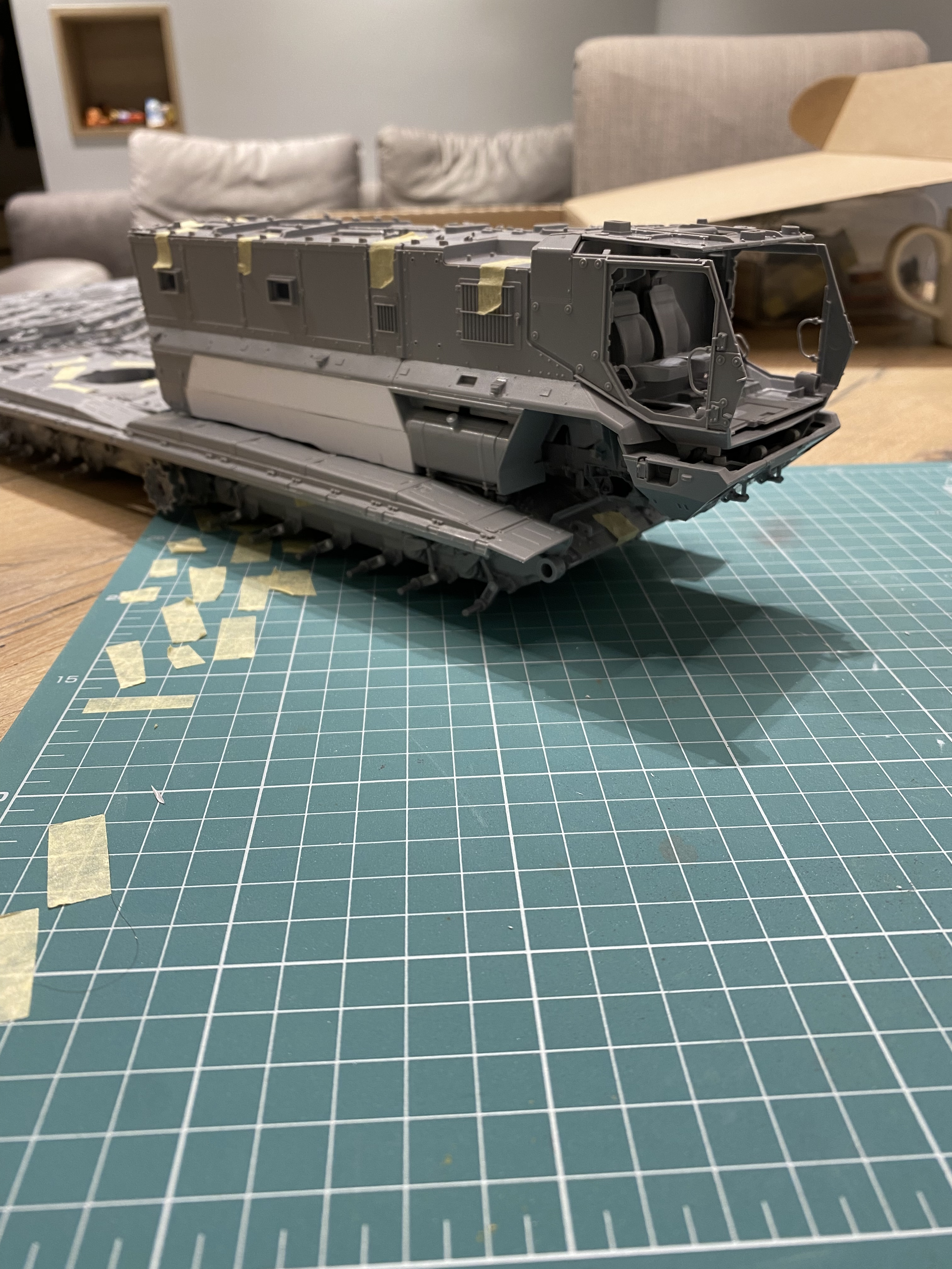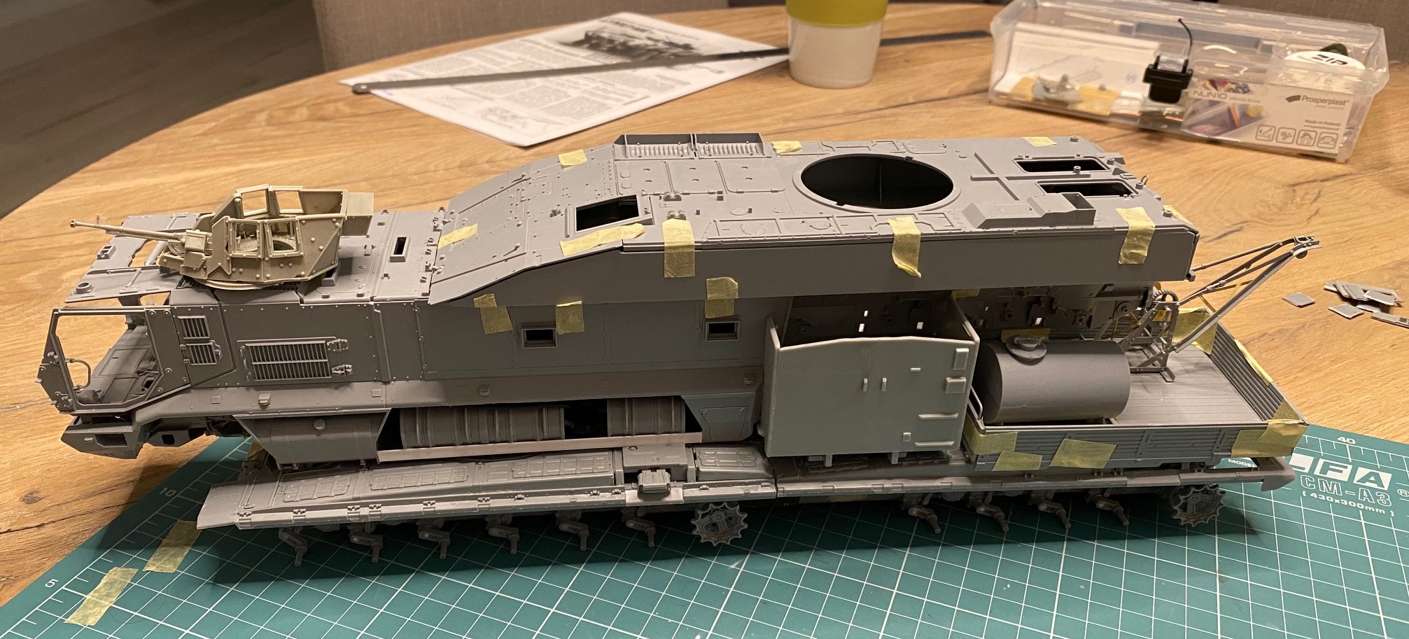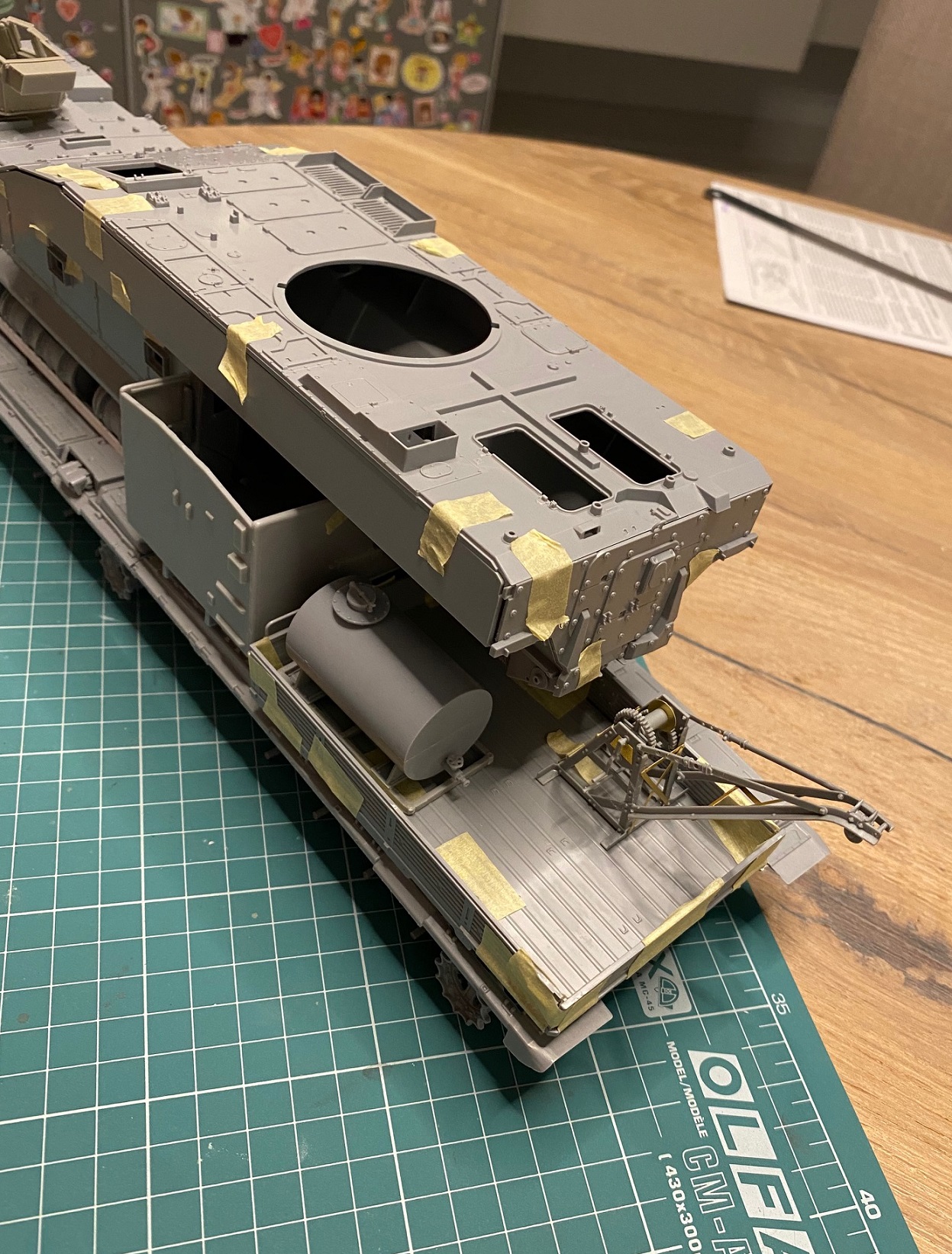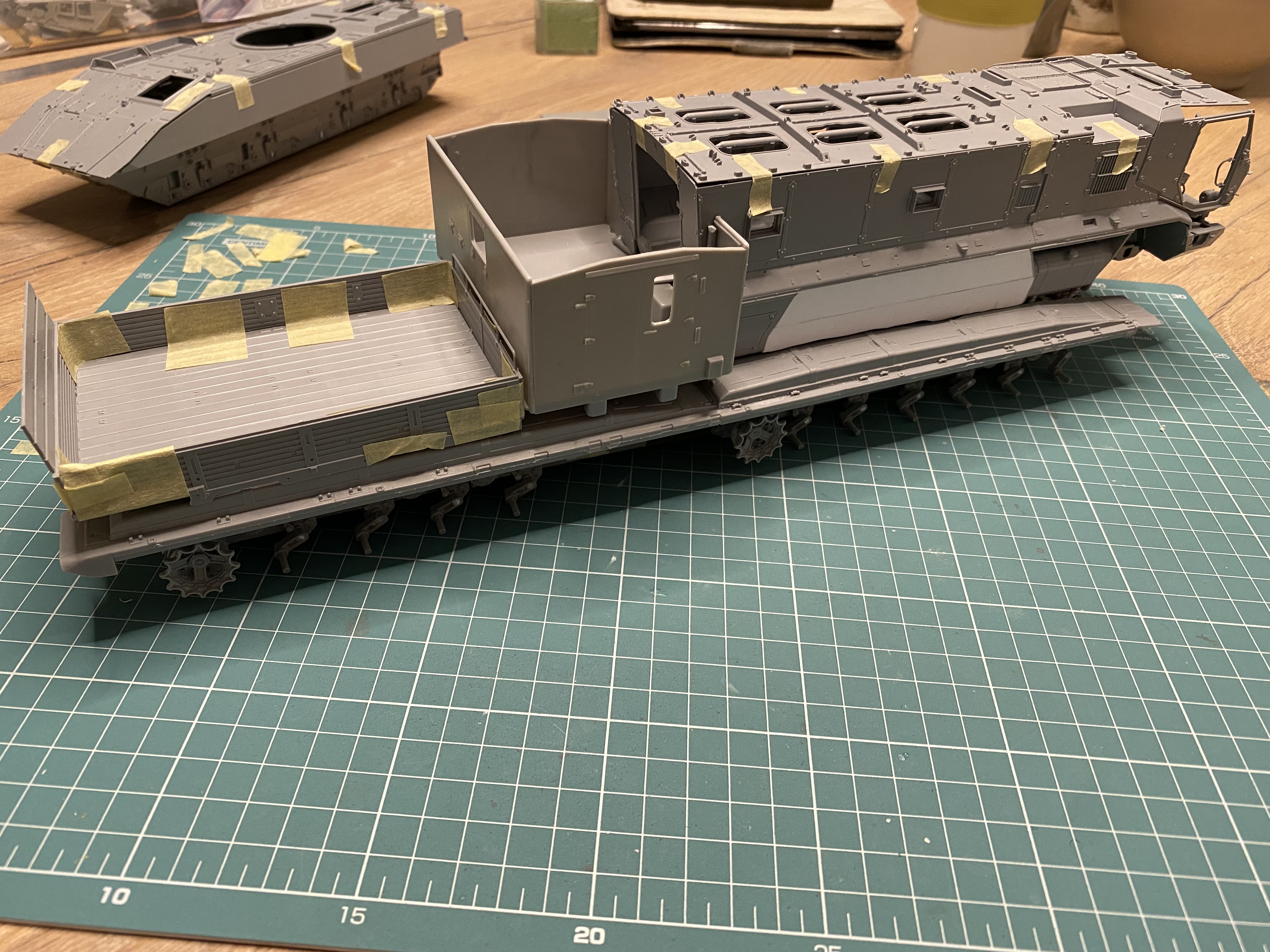Собрал верхнюю часть (пока без башни), имитировал ходовку Бумернга, которую в жизни могли бы разобрать частично для вот такой установки и облегчения конструкции.
