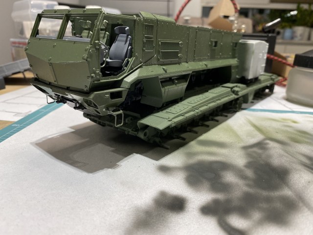 Выбрал в качестве основного цвета темный зеленый. Кунг и грузовую платформу буду красить в другой цвет, но не могу понять какой цвет компаньоном будет лучше. Если кто-то может подсказать - буду благодарен. Бумеранг сверху будет тоже зеленым. Обе башни пустынный желтый (но это как раз смотреть после того как все тело машины будет собрано и окрашено в базовые цвета).