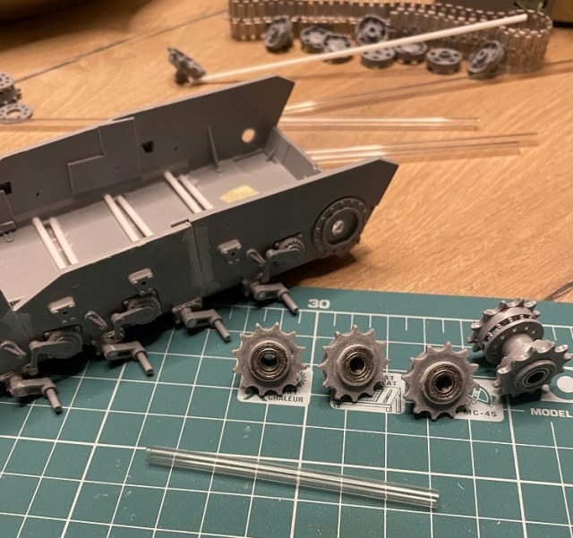 Ходовую решил делать рабочей. И это у меня отняло 1,5 месяца... я посмотрел десятки видео. Пробовал разные варианты. Купил кучу мелких пружин и пытался делать подвеску пружинной, но в итоге все как у всех - торсионы из 2мм прута от Тамии. Ведущие катки сделал с подшипниками (крутятся от дуновения воздуха).