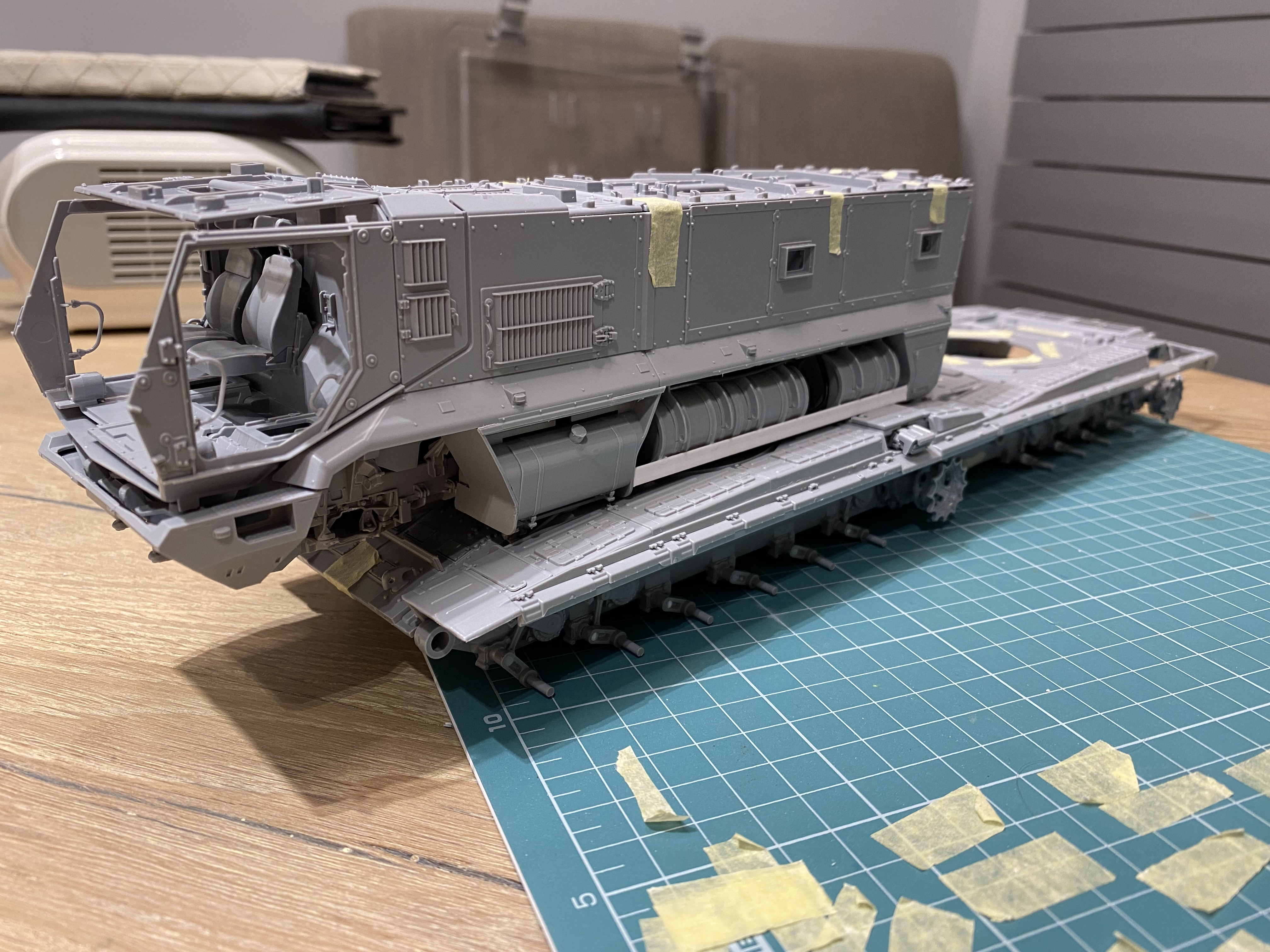 )) Долго думал, решил все же делать компоновку, где корпус тайфуна как "автобус", как на референсная картинке, можно ходить внутри в полный рост, хоть это и привело к сложностям с тем как обыграть его оставшуюся ходовку.