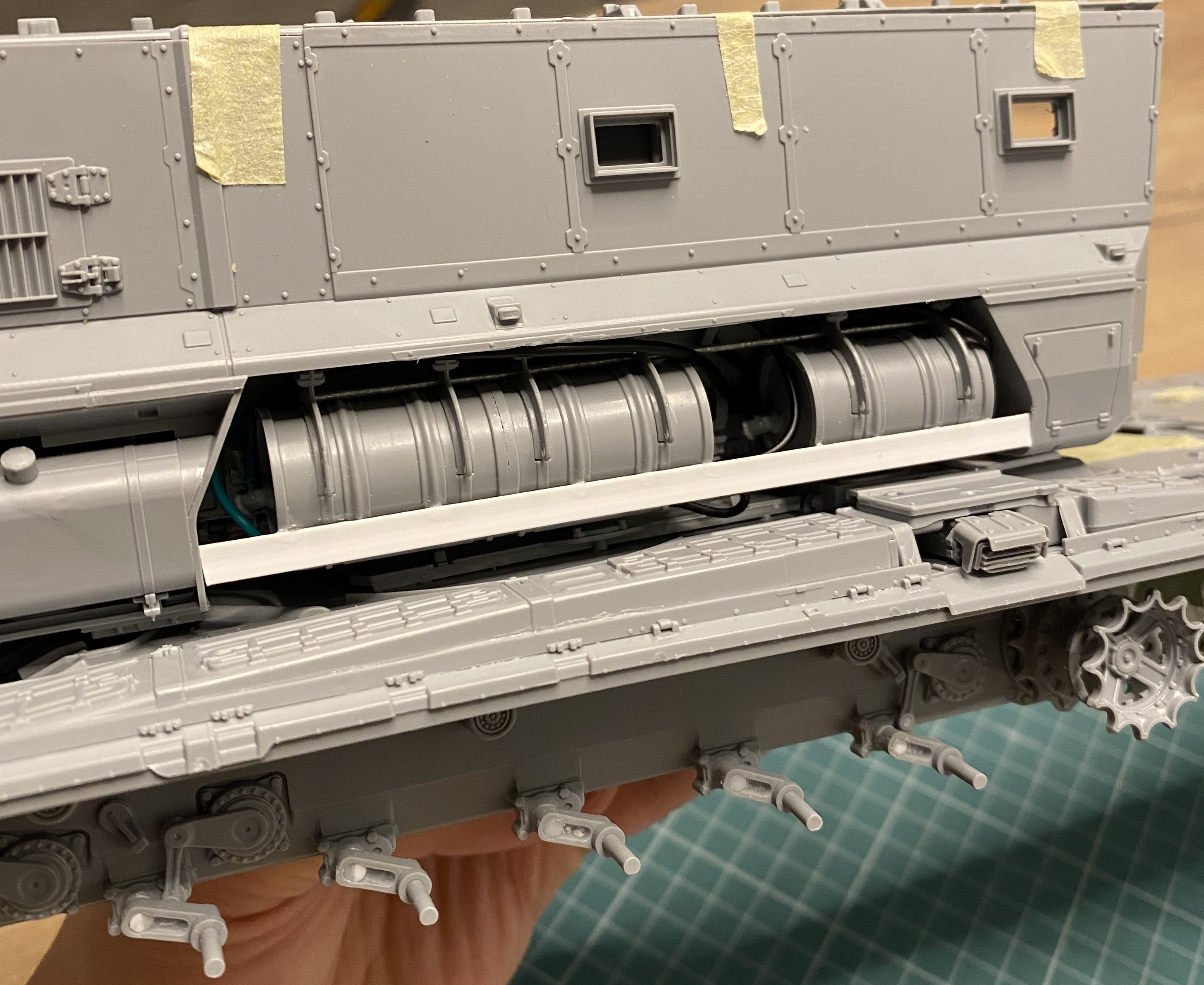 Между гусениц решил разместить секционирующие ящики от Тайфуна. Думал разместить тут еще топливные бочки, но очень уж они впритык к гусеницам.