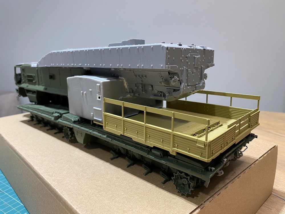 Еще нет башни Бумеранга, кучи деталей от тушек Бумеранга и Тайфуна, грузовая платформа только половинка, нет поручней и десятка переходных лестниц и ступеней, но о силуэте уже можно судить.