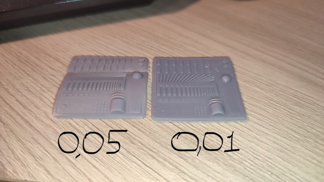 Но для моделизма толщина слоя по умолчанию - 0.05 мм великовата. Начал тестировать толщину слоя в 0.01 мм. И выявил проблему - все детали на высоте 1-2 мм от стола как-будто "сплющивает".