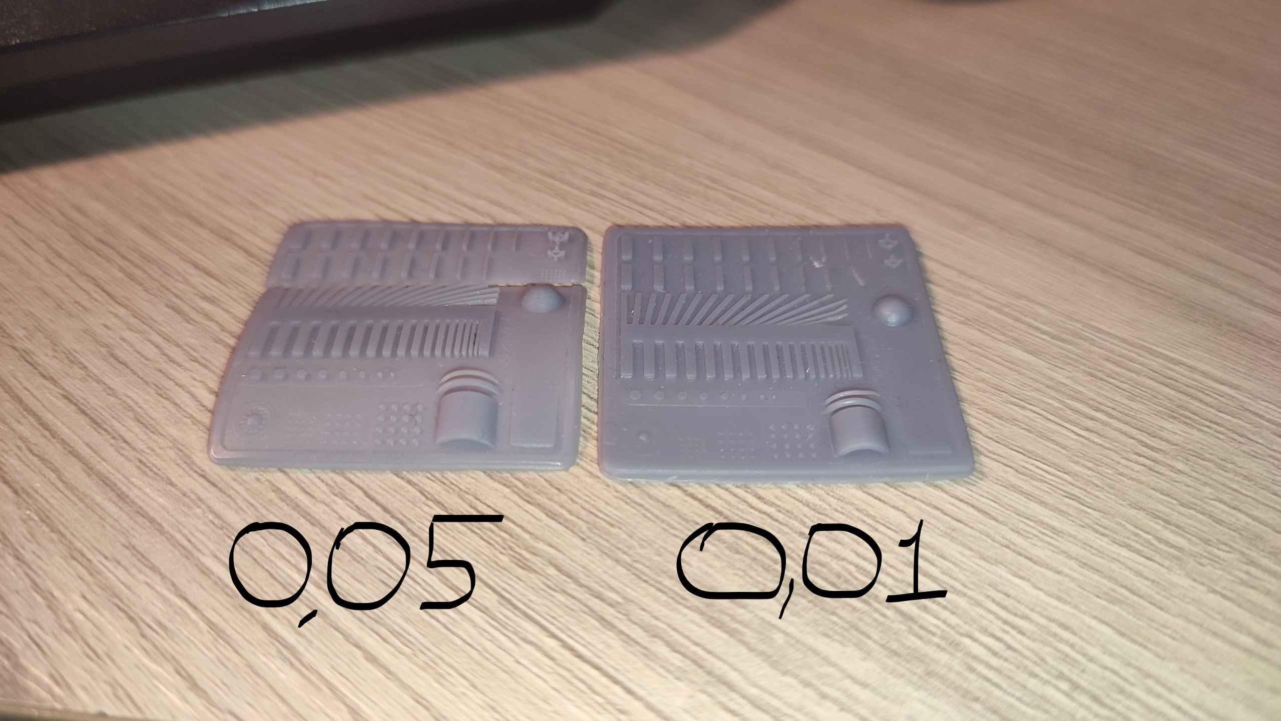 На первом фото видно, что тестовая пластинка с толщиной слоя в 0.01 мм (справа) имеет рисунок ниже, чем пластинка слева (с базовыми настройками).