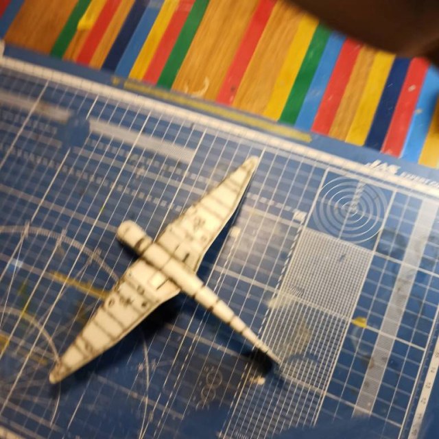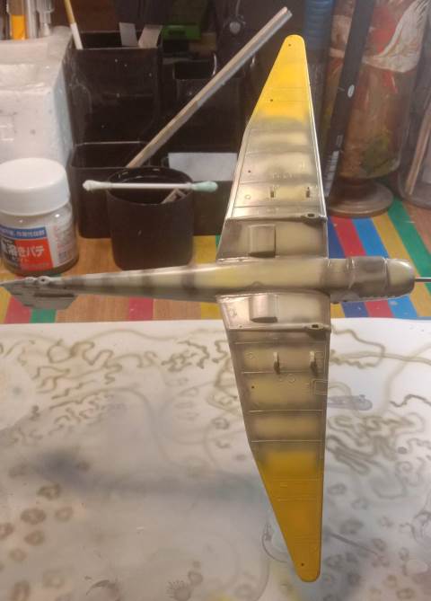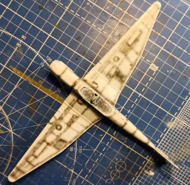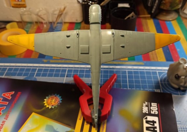 Начал окраску используя токо Ганзу. На данный момент за концовки окрашены RLM04, и низ окрашен RLM65. Снял маскирующую ленту - срывов нет. Между всеми операциями выдерживал “правило суток”. Полностью закрыл нижную часть тамиевской лентой.