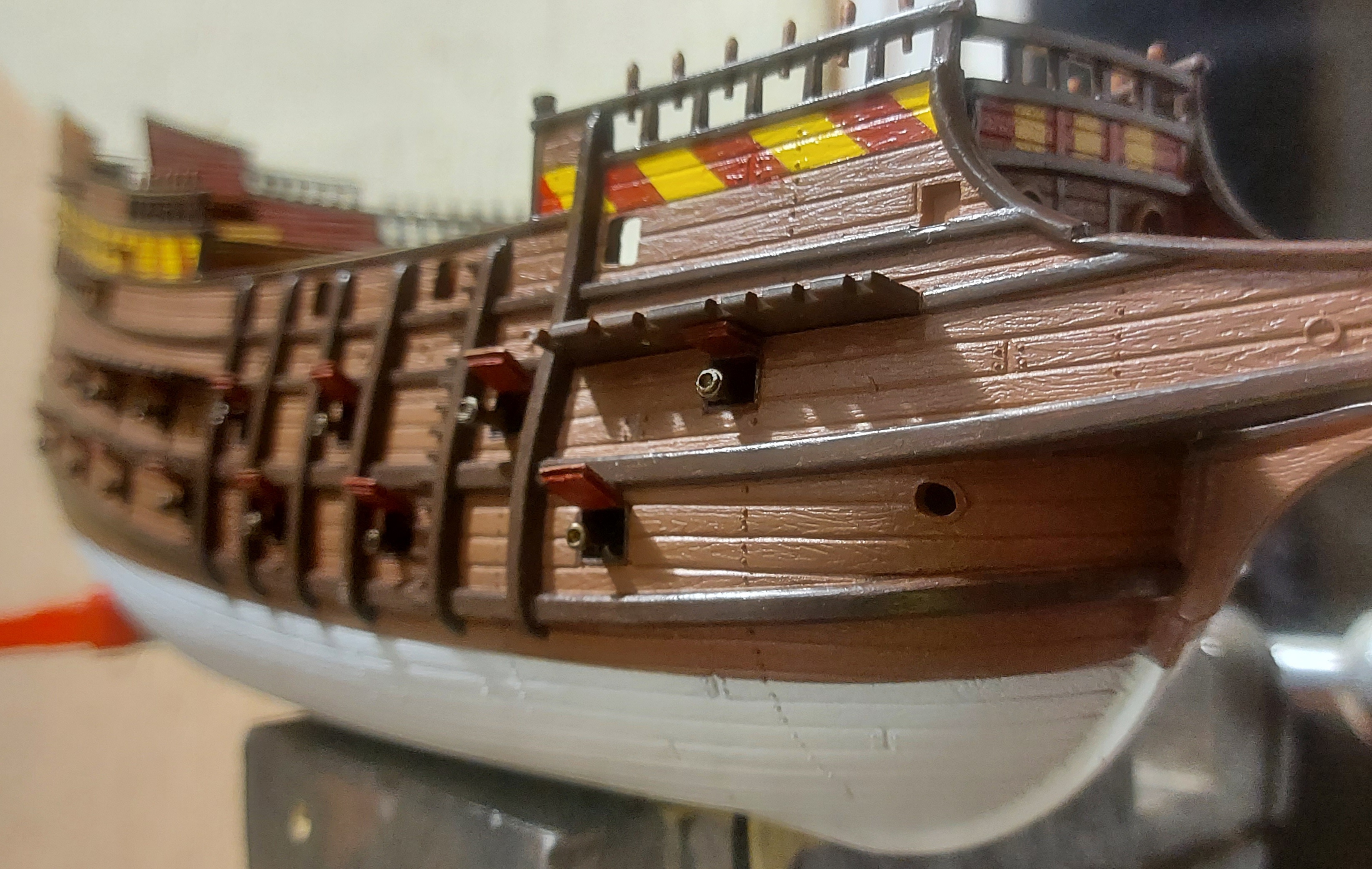 Было бы неплохо перенести якорные клюзы на положенное им место, а на их месте сделать погонные пушечные порты. Но тут уж Вам решать