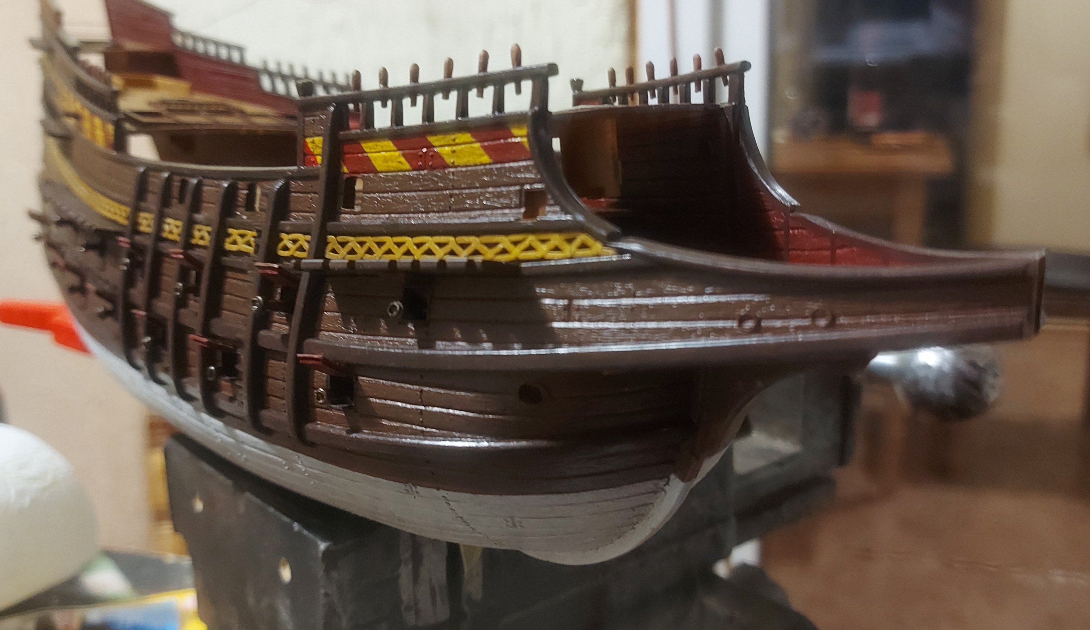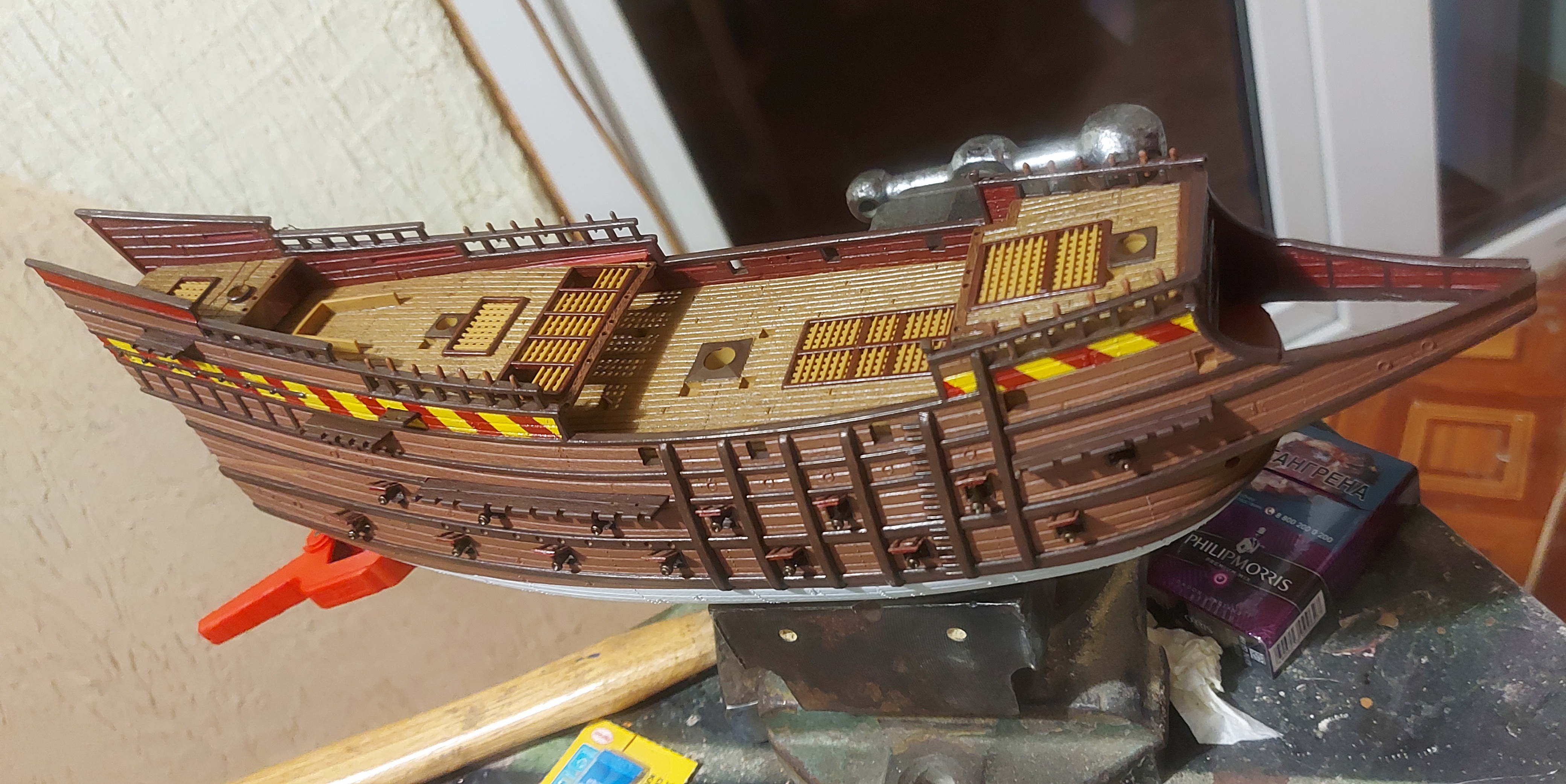Стартовая покраска по тихоньку движется. Ничего пока не склеиваю. Открашусь, попробую затонироваться, дальше к пушкам полезу. Красить классикой не захотел. Не люблю сильно яркую раскраску с кучей арнаментов. Плюс хочу одну идейку подсмотренную у коллег на другом судне попробовать. В общем видно будет