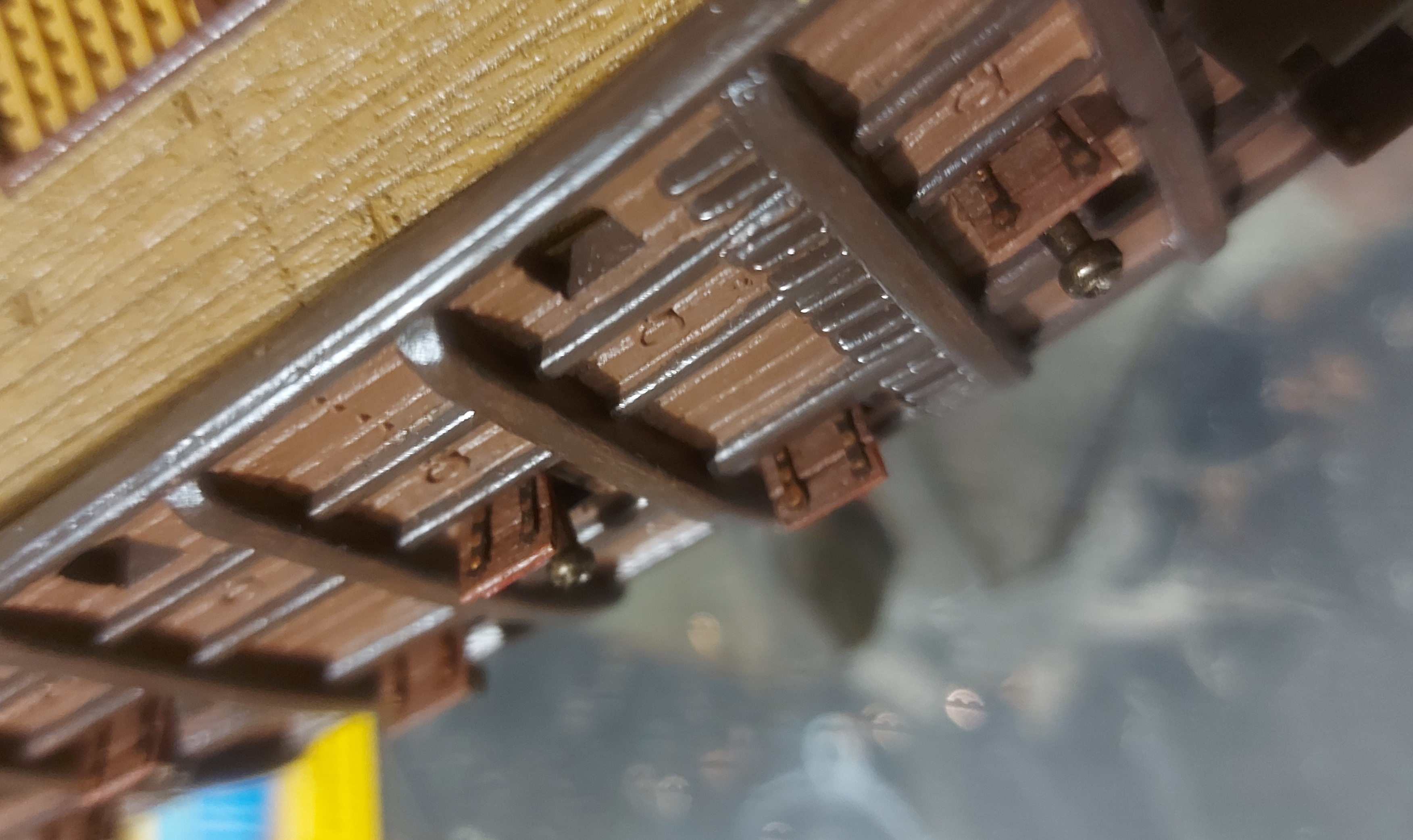 Сегодня выложил ополнительные нагели на бак и шканцы и попробовал сделать фальконет. Правда ещё пока не красил. Думаю штук 6 дополнительно поставить.