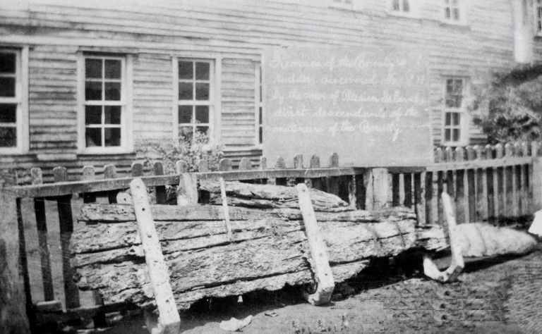 RELICS FROM HMS BOUNTY. These items were brought back from Pitcairn Island by Kenneth M. Dodson (1907-1999), who served in the Pacific aboard the USS Pierce during World War II. Included in the present lot is Dodson's copy of Pitcairn Island by David Silverman (1967), with numerous marginal notes by Dodson detailing his visit and recording his impressions of the island and its inhabitants. In the margins of p 81, Dodson writes, "I visited Pitcairn Island 28 Aug 1942[.] pop was 206. I carried a 50 lb bag of sugar up this 'Hill of Difficulty,' a steep trail from boat landing to the level of Adamstown above." On p 100 he notes, "They gave me a piece of the Bounty's rudder," then on p 103, "Stone adze from pre Bounty inhabitants." The nail head is housed in an envelope on which Dodson has noted, "Copper Nail from The 'Bounty' given by David Young 5th from Midshipman Edward Young."