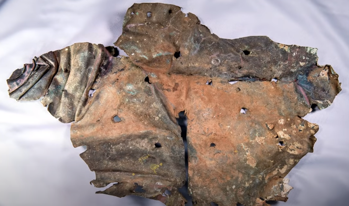 Copper nail head, 2 centimeter diameter, and fragment of wooden rudder, approximately 4 x 2 x 2 inches, from HMS Bounty, rudder mounted in box frame.