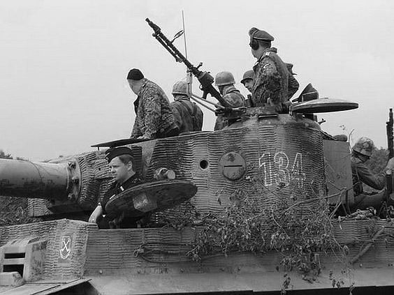 Вывешивание автомата снаружи машины это тоже художественный вымысел. На всех фото, где есть такое присутствует пехота "на броне" (или рядом) чьей собственностью и яаляется стрелковое оружие. Каски тоже емнип на kingtiger сверху не встречаются.
