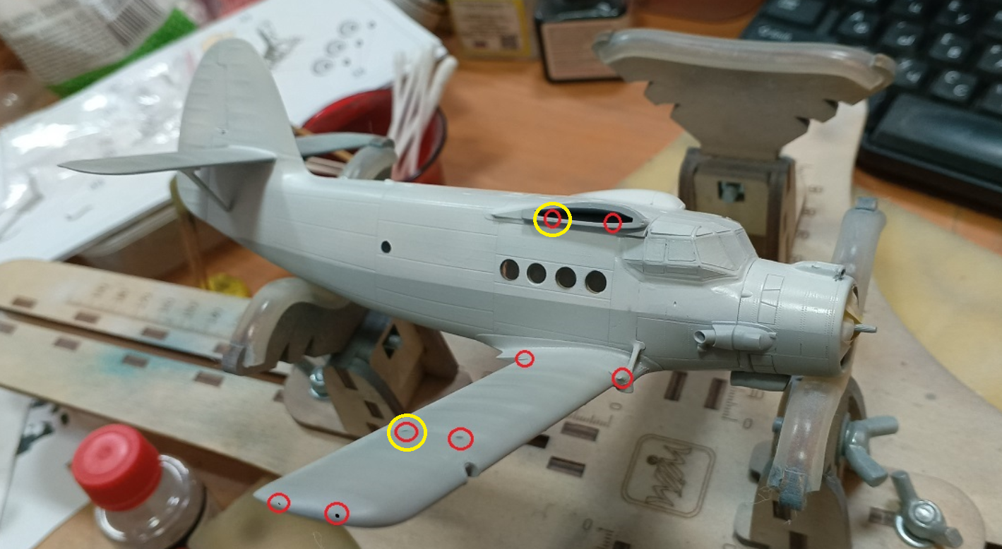 Сложности возникают из-за того, модель уже собрана и подобраться к месту сверления с внутренней стороны полуплоскостей не просто и поэтому все отверстия, ИМХО, нужно делать сквозными, причем сверлить их сверху верхней полуплоскости (2 шт. для крепления несущих расчалок) и снизу (3 шт.) с нижней стороны нижней полуплоскости.