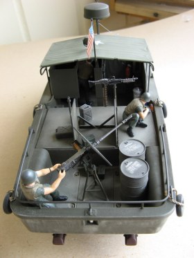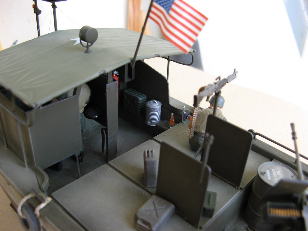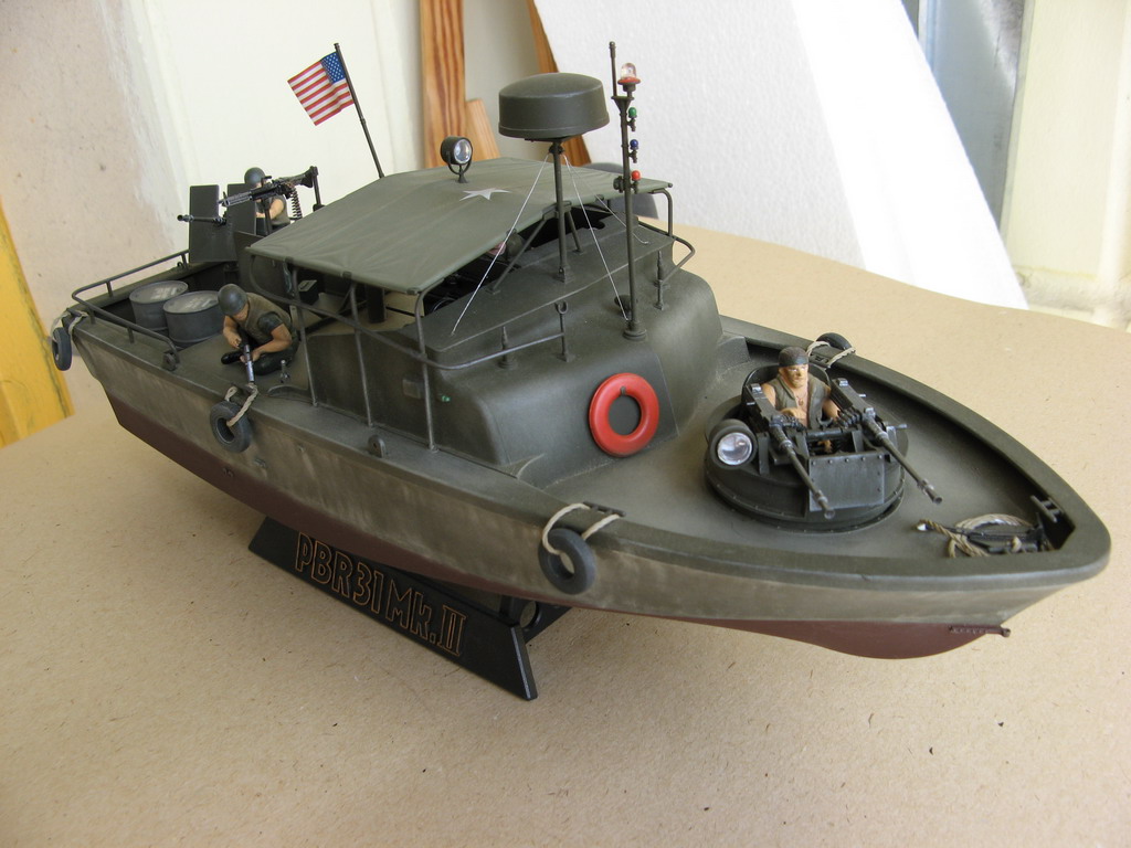 Собрал в прошлом авгкусте, а запачкал недавно-не нравился слишком чистый вид.Модель отличного качества, собираемость первый класс. Равзве что я купил модель чуть уцененную-без декалей, посему звезду и надписи на бочках взял с декали М113, этикетки на бутылках пришлось подрисовать. Модель содержит кроме прозрачных деталей также флаг и трос., фигуры 4 членов экимажа ( М.Шина не хватает!) а также разнообразные патронные каробки, бочки, термосы для воды и провизии, магнитофон (не делал) и т.п. Т.е. почти все для создания катера как в фильме. НО-нет ещё одной фигурки(в фильме то их 5 там плавало!), а кроме того, если присмотреться к фильму внимательнее, то заметите, что в разных кадрах роль катера играет 1 катера играют 3 разных! Посему делал просто один из многих плававших во Вьетнаме корабликов.