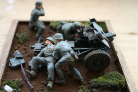 Сама композиция диорамы - признанные спецы советуют избегать размещения техники, людей и т.д. строго вдоль сторон основания. Т.е. пушку лучше было бы разместить примерно по диагонали.